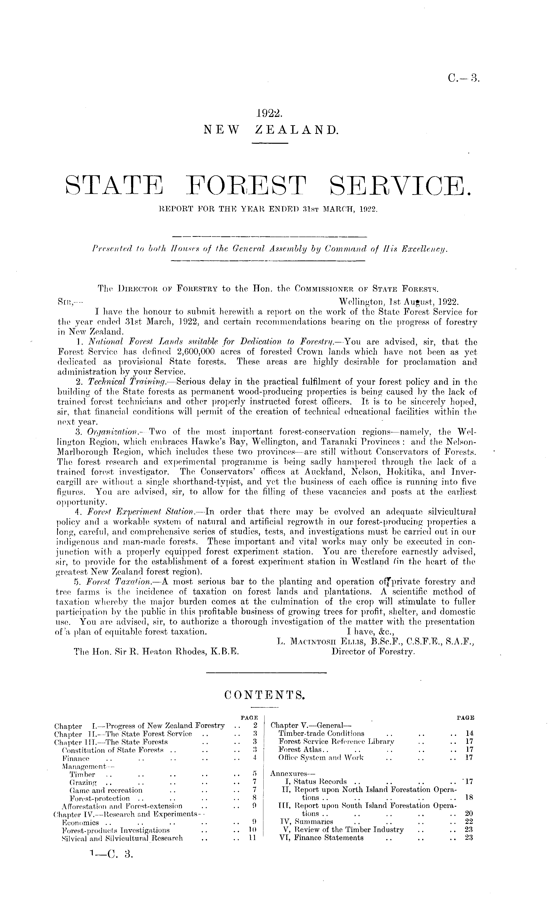 The Director of Forestry to the Hon. the Commissioner of State Forests. Sir,— Wellington, Ist August, 1922. I have the honour to submit herewith a report on the work of the State Forest Service for the year ended 31st March, ]922, and certain recommendations bearing on the progress of forestry in New Zealand. 1. National Forest Lands suitable for Dedication to Forestry. —You are advised, sir, that the Forest Service has defined 2,600,000 acres of forested Crown lands which have not been as yet dedicated as provisional State forests. These areas are highly desirable for proclamation and administration by your Service. 2. Technical Training. —Serious delay in the practical fulfilment of your forest policy and in the building of the State forests as permanent wood-producing properties is being caused by the lack of trained forest technicians and other properly instructed forest officers. It is to be sincerely hoped, sir, that financial conditions will permit of the creation of technical educational facilities within the next year. 3. Organization. —Two of the most important forest-conservation regions—namely, the Wellington Region, which embraces Hawke's Bay, Wellington, and Taranaki Provinces : and the NelsonMarlborough Region, which includes these two provinces—are still without Conservators of Forests. The forest research and experimental programme is being sadly hampered through the lack of a, trained forest investigator. The Conservators' offices at Auckland, Nelson, Hokitika, and Invercargill are without a single shorthand-typist, and yet the business of each office is running into five figures. You are advised, sir, to allow for the filling of these vacancies and posts at the earliest opportunity. 4. Forest Experiment Station. —ln order that there may be evolved an adequate silvicultural policy and a workable system of natural and artificial regrowth in our forest-producing properties a long, careful, and comprehensive series of studies, tests, and investigations must be carried out in our indigenous and man-made forests. These important and vital works may only bo executed in conjunction with a properly equipped forest experiment station. You are therefore earnestly advised, sir, to provide for the establishment of a forest experiment station in Westland (m the heart of the greatest New Zealand forest region). 5. Forest Taxation. —A most serious bar to the planting and operation offprivate forestry and tree farms is the incidence of taxation on forest lands and plantations. A scientific method of taxation whereby the major burden comes at the culmination of the crop will stimulate to fuller participation by the public in this profitable business of growing trees for profit, shelter, and domestic use. You are advised, sir, to authorize a thorough investigation of the matter with the presentation of ! a plan of equitable forest taxation. I have, &c, L. Macintosh Ellis, B.Sc.F., C.S.F.E., S.A.F., The Hon. Sir R. Heaton Rhodes, K.B.E. Director of Forestry.