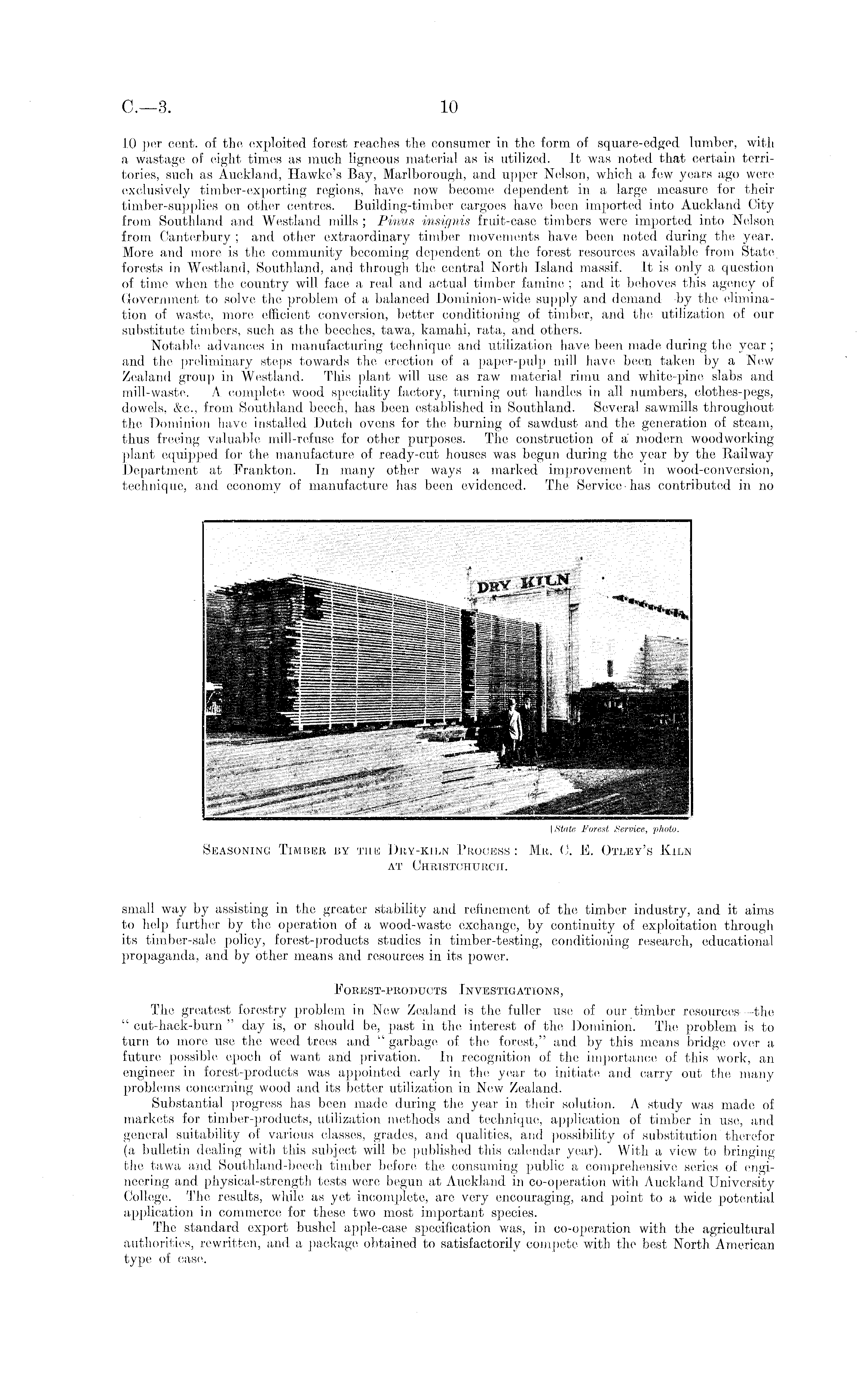 small way by assisting in tho greater stability and refinement of the timber industry, and it aims to help further by the operation of a wood-waste exchange, by continuity of exploitation through its timber-sale policy, forest-products studies in timber-testing, conditioning research, educational propaganda, and by other means and resources in its power. Forest-products Investigations, The greatest forestry problem in Now Zealand is the fuller use of our timber resources—the " cut-hack-burn " day is, or should be, past in the interest of the Dominion. The problem is to turn to more use the weed trees and " garbage of the forest," and by this means bridge over a future possible epoch of want and privation. In recognition of the importance of this work, an engineer in forest-products was appointed early in the year to initiate and carry out the many problems concerning wood and its better utilization in New Zealand. Substantial progress has been made during the year in their solution. A study was made of markets for timber-products, utilization methods and technique, application of timber in use, and general suitability of various classes, grades, and qualities, and possibility of substitution therefor (a bulletin dealing with this subject will be published this calendar year). With a view to bringing the tawa and Southland-beech timber before the consuming public a comprehensive series of engineering and physical-strength tests wore begun at Auckland in co-operation with Auckland University College. The results, while as yet incomplete, are very encouraging, and point to a wide potential application in commerce for these two most important species. The standard export bushel apple-case specification was, in co-operation with the agricultural authorities, rewritten, and a package obtained to satisfactorily compete with the best North "American type of case.