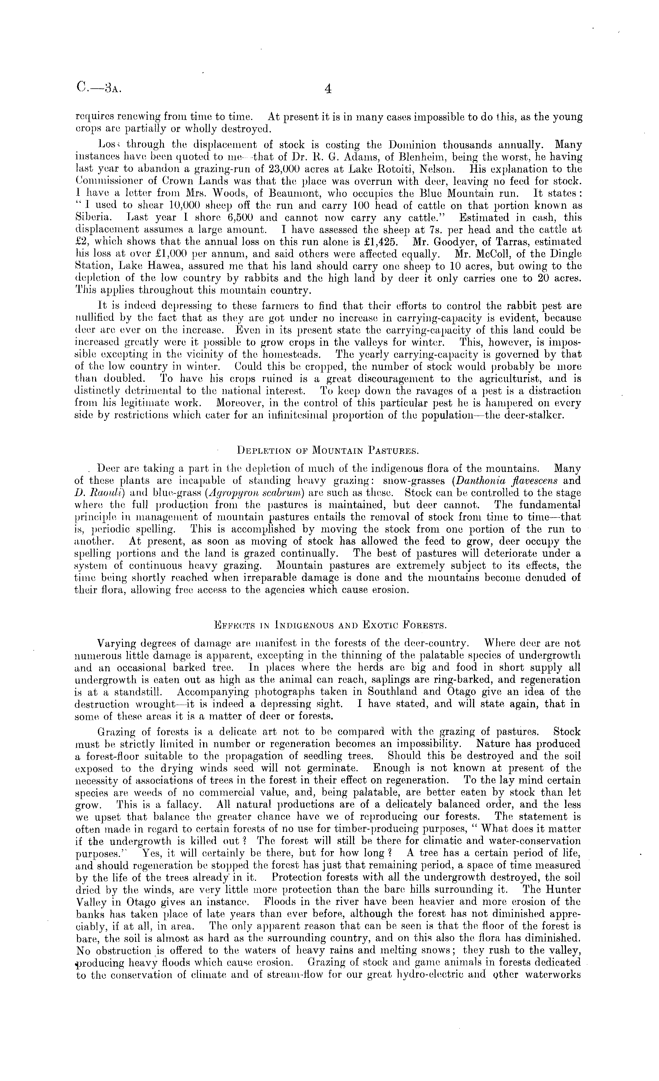 requires renewing from time to time. At present it is in many cases impossible to do this, as the young crops are partially or wholly destroyed. Los-; through the displacement of stock is costing the Dominion thousands annually. Many instances have been quoted to me that of Dr. R. G. Adams, of Blenheim, being the worst, he having last year to abandon a grazing-run of 23,000 acres at Lake Rotoiti, Nelson. His explanation to the Commissioner of Crown Lands was that the place was overrun with deer, leaving no feed for stock. I have a letter from Mrs. Woods, of Beaumont, who occupies the Blue Mountain run. It states : " I used to shear 10,000 sheep off the; run and carry 100 head of cattle on that portion known as Siberia. Last year 1 shore 6,500 and cannot now carry any cattle." Estimated in cash, this displacement assumes a large amount. I have assessed the sheeji at 7s. per head and the cattle at £2, which shows that the annual loss on this run alone is £1,425. Mr. Goodyer, of Tarras, estimated his loss at over £1,000 per annum, and said others were affected equally. Mr. McColl, of the Dingle, Station, Lake Hawea, assured me that his land should carry one sheep to 10 acres, but owing to the depletion of the low country by rabbits and the high land by deer it only carries one to 20 acres. This applies throughout this mountain country. It is indeed depressing to these farmers to find that their efforts to control the rabbit pest are nullified by the fact that as they are got under no increase in carrying-capacity is evident, because deer' arc ever on the increase. Even in its present state the, carrying-capacity of this land could be increased greatly were it possible to grow crops in the valleys for winter. This, however, is impossible excepting in the vicinity of the homesteads. The yearly carrying-capacity is governed by that of the low country in winter. Could this be cropped, the number of stock would probably be more, than doubled. To have his crops ruined is a great discouragement to the agriculturist, and is distinctly detrimental to the national interest. To keep down the, ravages of a pest is a distraction from his legitimate work. Moreover, in the control of this particular pest he is hampered on every side by restrictions which cater for an infinitesimal proportion of the papulation —the deer-stalker. Depletion of Mountain Pastures. . Deer are taking a part in the depletion of much of the indigenous flora of the mountains. Many of these, plants are incapable of standing heavy grazing: snow-grasses (Danlhoniu flavescens and D. Raouli) and blue-grass (Agropyron scabrum) are such as these. Stock can be, controlled to the stage where the full production from the pastures is maintained, but deer cannot. The, fundamental principle in management of mountain pastures entails the removal of stock from time to time —that is, periodic spelling. This is accomplished by moving the stock from one portion of the run to another. At present, as soon as moving of stock has allowed the feed to grow, deer occupy the spelling portions and the land is grazed continually. The best of pastures will deteriorate under a system of continuous heavy grazing. Mountain pastures are extremely subject to its effects, the time being shortly reached when irreparable damage is done and the mountains become denuded of their flora, allowing free access to the agencies which cause erosion. Effects in Indkiicnous and Exotic Forests. Varying degrees of damage are manifest in the forests of the deer-country. Where deer are not numerous little damage is apparent, excepting in the thinning of the palatable species of undergrowth and an occasional barked tree. In places where the herds are big and food in short supply all undergrowth is eaten out as high as the animal can reach, saplings are, ring-barked, and regeneration is at a standstill. Accompanying photographs taken in Southland and Otago give an idea of the destruction wrought —it is indeed a depressing sight. I have stated, and will state, again, that in some, of these areas it is a matter of deer or forests. Crazing of forests is a delicate art not to lie compared with the grazing of pastures. Stock must be strictly limited in number or regeneration becomes an impossibility. Nature has produced a forest-floor suitable to the propagation of seedling trees. Should, this be destroyed and the soil exposed to the drying winds seed will not germinate. Enough is not known at present of the necessity of associations of trees in the forest in their effect on regeneration. To the lay mind certain species are weeds of no commercial value, and, being palatable, are better eaten by stock than let grow. This is a fallacy. All natural productions are of a delicately balanced order, and the less we upset that balance the greater chance have we of reproducing our forests. The statement is often made in regard to certain forests of no use for timber-producing purposes, " What, does it matter if the undergrowth is killed out % The forest will still be there for climatic and water-conservation purposes.'" Yes, it will certainly be there, but for how long ? A tree has a certain period of life, and should regeneration be stopped the forest has just that remaining period, a space of time measured by the life of the trees already in it. Protection forests with all the undergrowth destroyed, the soil dried by the winds, an; very little more protection than the bare hills surrounding it. The Hunter Valley in Otago gives an instance. Floods in the river have been heavier and more erosion of the banks has taken place of late years than ever before, although the forest has not diminished appreciably, if at all, in area. The only apparent reason that can be seen is that the floor of the forest is bare, the soil is almost as hard as the surrounding country, and on this also the flora has diminished. No obstruction is offered to the waters of heavy rains and melting snows; they rush to 