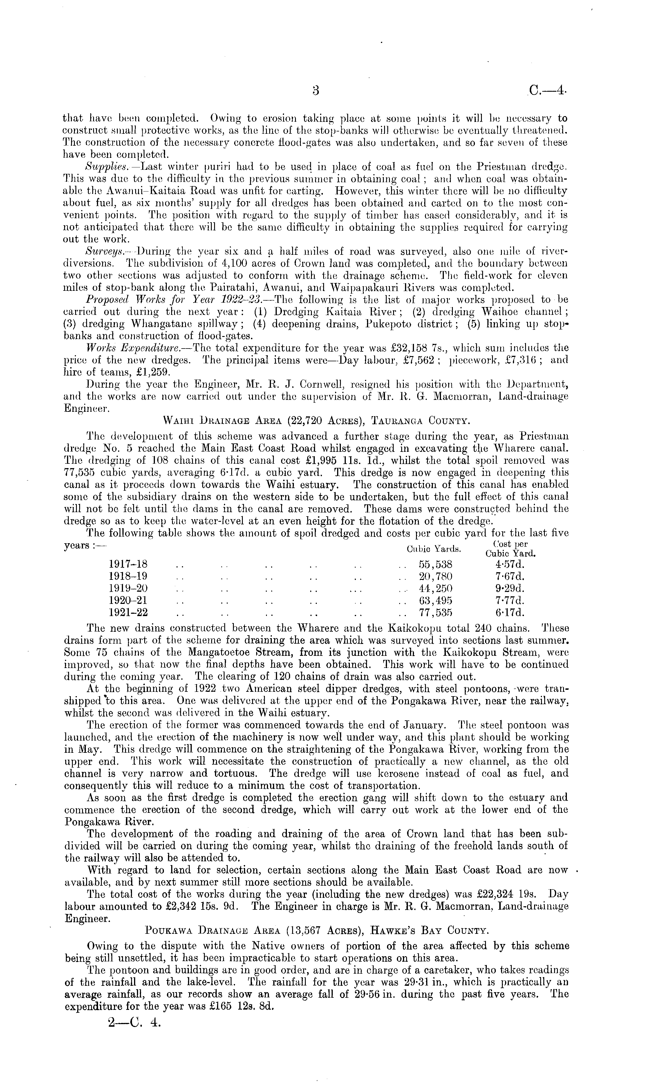 that have been completed. Owing to erosion taking place at some points it will be necessary to construct small protective works, as the line of the stop-banks will otherwise be eventually threatened. The construction of the necessary concrete flood-gates was also undertaken, and so far seven of these have been completed. Supplies. —Last winter puriri had to be used in place of coal as fuel on the Priestman dredge. This was due to the difficulty in the previous summer in obtaining coal; and when coal was obtainable the Awanui-Kaitaia Road was unfit for carting. However, this winter there will be no difficulty about fuel, as six months' supply for all dredges has been obtained and carted on to the most convenient points. The position with regard to the supply of timber lias eased considerably, and it is not anticipated that there; will be the same difficulty in obtaining the supplies required for carrying out the work. Surveys. —During the year six and a half miles of road was surveyed, also one mile of riverdiversions. The subdivision of 4,1.00 acres of Crown land was completed, and the boundary between two other sections was adjusted to conform with the drainage scheme. The field-work for eleven miles of stop-bank along the Pairatahi, Awanui, and Waipapakauri Rivers was completed. Proposed Works for Year 1922-23. —The following is the list of major works proposed to be carried out during the next year: (I) Dredging Kaitaia River; (2) dredging Waihoe; channel; (3) dredging Whangatane spillway; (4) deepening drains, Pukepoto district; (5) linking up stopbanks and construction of flood-gates. Works Expenditure. —The total expenditure for the year was £32,158 75., which sum includes the price of the new dredges. The principal items were—Day labour, £7,562 ; piecework, £7,316 ; and hire of teams, £1,259. During the year the Engineer, Mr. R. J. Cornwell, resigned his position with the Department, and the works are now carried out under the supervision of Mr. R. G. Macmorran, Land-drainage Engineer. Wauh Drainage Area (22,720 Acres), Tauranga County. The development of this scheme was advanced a further stage during the year, as Priestman dredge No. 5 reached the Main East Coast Road whilst engaged in excavating the Wharere canal. The dredging of 108 chains of this canal cost £1,995 lis. Id., whilst the total spoil removed was 77,535 cubic yards, averaging (M7d. a cubic yard. This dredge is now engaged in deepening this canal as it proceeds down towards the Waihi estuary. The construction of this canal has enabled some of the subsidiary drains on the western side to be undertaken, but the full effect of this canal will not be felt until the dams in the canal are removed. These dams were constructed behind the dredge so as to keep the water-level at an even height for the flotation of the dredge. The following table shows the amount of spoil dredged and costs per cubic yard for the last five yca,rs:— Cubio Yards Cost per J Cubic Yaiila. Cubi(J Yara 1917-18 .. .. .. .. .. ..55,538 4-57 d. 1918-19 .. .. .. .. .. .. 20,780 7-67 d. 1919-20 '.. .. .. ... 4.4,250 9-29 d. 1920-21 .. .. .. .. .. .. 63,495 7-77 d. 1921-22 .. .. .. .. .. ..77,535 6-17 d. The new drains constructed between the Wharere and the Kaikokopu total 240 chains. These drains form part of the scheme for draining the area which was surveyed into sections last summer. Some 75 chains of the Mangatoetoe Stream, from its junction with the Kaikokopu Stream, were improved, so that now the final depths have been obtained. This work will have to be continued during the coming year. The clearing of 120 chains of drain was also carried out. At the beginning of 1922 two American steel dipper dredges, with steel pontoons, were transhipped *to this area. One was delivered at the upper end of the Pongakawa River, near the railway, whilst the second was delivered in the Waihi estuary. The erection of the former was commenced, towards the end of January. The steel pontoon was launched, and the erection of the machinery is now well under way, and this plant should be working in May. This dredge will commence on the straightening of the Pongakawa River, working from the upper end. This work will necessitate the construction of practically a new channel, as the old channel is very narrow and tortuous. The dredge will use kerosene instead of coal as fuel, and consequently this will reduce to a minimum the cost of transportation. As soon as the first dredge is completed the erection gang will shift down to the estuary and commence the erection of the second dredge, which will carry out work at the lower end of the Pongakawa River. The development of the roading and draining of the area of Crown land that has been subdivided will be carried on during the coming year, whilst the draining of the freehold lands south of the railway will also be attended to. With regard to land for selection, certain sections along the Main East Coast Road are now available, and by next summer still more sections should, be available. The total cost of the works during the year (including the new dredges) was £22,324 19s. Day labour amounted to £2,342 15s. 9d. The Engineer in charge is Mr. R. G. Macmorran, Land-drainage Engineer. Poukawa Drainage Area (13,567 Acres), Hawke's Bay County. Owing to the dispute with the Native owners of portion of the area affected by this scheme being still unsettled, it has been impracticable to start operations on this area. The pontoon and buildings are in good order, and are in charge of a caretaker, who takes readings of the rainfall and the lake-level. The rainfall for the year was 29-31 in., which is practically an average rainfall, as our records show an average fall of 29-56 in. during the past five years. The expenditure for the year was £165 12s. Bd.