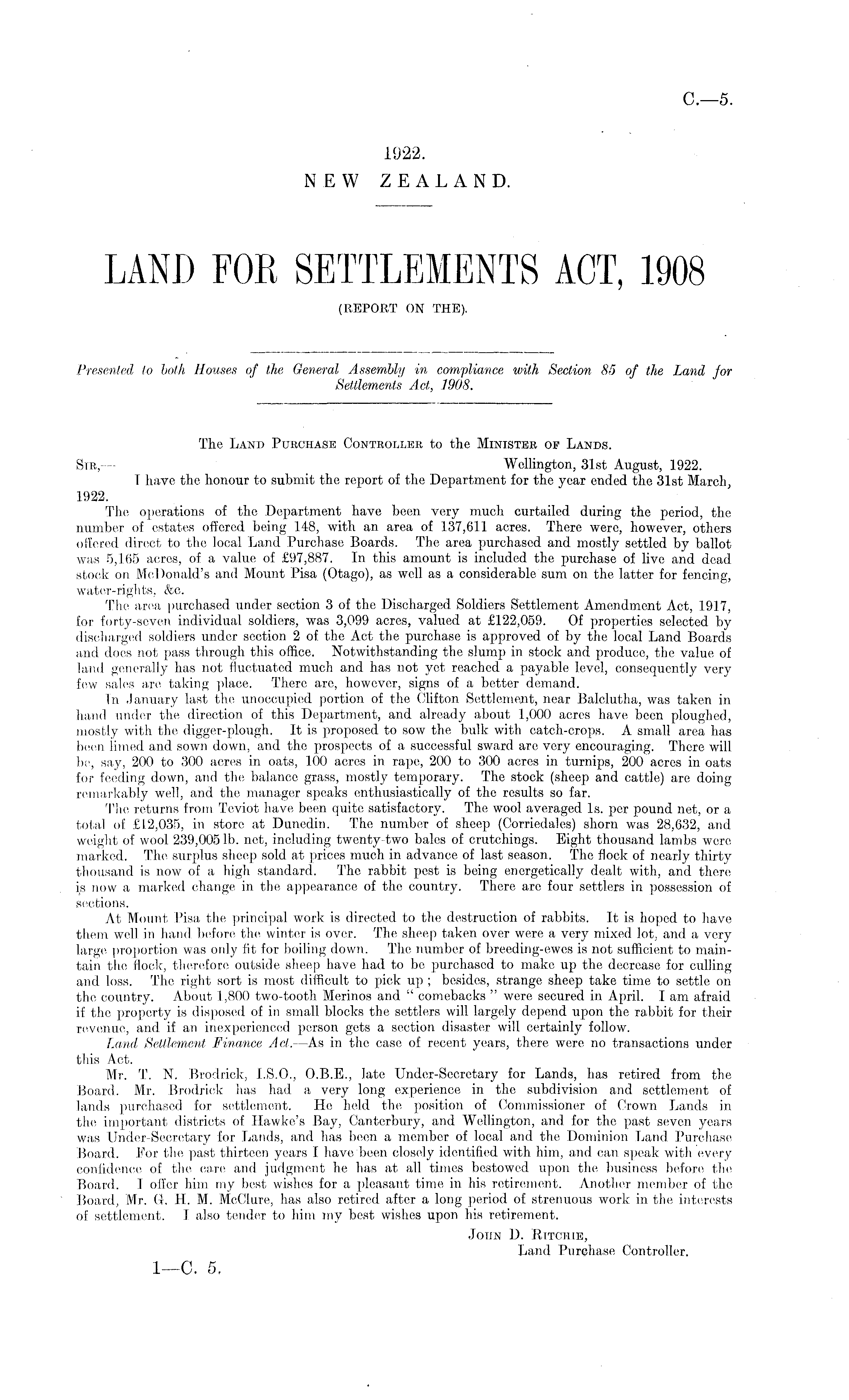 The Land Purchase Controller to the Minister of Lands. Sir,— Wellington, 31st August, 1922. I have the honour to submit the report of the Department for the year ended the 31st March, 1922. The operations of the Department have been very much curtailed during the period, the number of estates offered being 148, with an area of 137,611 acres. There were, however, others offered direct to the local Land Purchase Boards. The area purchased and mostly settled by ballot was 5,165 acres, of a value of £97,887. In this amount is included the purchase of live and dead stock on McDonald's and Mount Pisa (Otago), as well as a considerable sum on the, latter for fencing, water-rights. &c. The, area purchased under section 3 of the Discharged Soldiers Settlement Amendment Act, 1917, for forty-seven individual soldiers, was 3,099 acres, valued at £122,059. Of properties selected by discharged soldiers under section 2 of the Act the purchase is approved of by the local Land Boards and does not pass through this office. Notwithstanding the slump in stock and produce, the value of land generally has not fluctuated much and has not yet reached a payable level, consequently very few sales are taking place. There are, however, signs of a better demand. Tn January last the unoccupied portion of the Clifton Settlement, near Balclutha, was taken in hand under the direction of this Department, and already about 1,000 acres have been ploughed, mostly with the digger-plough. It is proposed to sow the bulk with catch-crops. A small area has been limed and sown down, and the prospects of a successful sward are very encouraging. There will be, say, 200 to 300 acres in oats, 100 acres in rape, 200 to 300 acres in turnips, 200 acres in oats for feeding down, and the balance grass, mostly temporary. The stock (sheep and cattle) are doing remarkably well, and the manager speaks enthusiastically of the results so far. The returns from Teviot have been quite satisfactory. The wool averaged Is. per pound net, or a total of £12,035, in store at Dunedin. The number of sheep (Corriedales) shorn was 28,632, and weight of wool 239,005 lb. net, including twenty two bales of crutchings. Eight thousand lambs were marked. The surplus sheep sold at prices much in advance of last season. The flock of nearly thirty thousand is now of a high standard. The rabbit pest is being energetically dealt with, and there is now a marked change in the appearance of the country. There are four settlers in possession of sections. At Mount Pisa the principal work is directed to the destruction of rabbits. It is hoped to have them well in hand before the winter is over. The sheep taken over were a very mixed lot, and a very large proportion was only fit for boiling down. The number of breeding-ewes is not sufficient to maintain the flock, therefore outside sheep have had to be purchased to make up the decrease for culling and loss. The right sort is most difficult to pick up ; besides, strange sheep take time to settle on the country. About 1,800 two-tooth Merinos and " comebacks " were secured in April. lam afraid if the property is disposed of in small blocks the settlers will largely depend upon the rabbit for their revenue, and if an inexperienced person gets a section disaster will certainly follow. Land Settlement Finance Act. —As in the case of recent years, there were no transactions under this Act. Mr. T. N. Brodrick, 1.5.0., 0.8.E., late Under-Secretary for Lands, has retired from the Board. Mr. Brodrick has had a very long experience in the subdivision and settlement of lands purchased for settlement. He held the position of Commissioner of Crown Lands in the important districts of Hawke's Bay, Canterbury, and Wellington, and for the past seven years was Under-Secretary for Lands, and has been a member of local and the Dominion Land Purchase Board. For the past thirteen years I have/been closely identified with him, and can speak with every confidence of the care and judgment he has at all times bestowed upon the business before the Board. I oiler him my best wishes for a pleasant time in his retirement. Another member of the Board, Mr. G. H. M. McClure, has also retired after a long period of strenuous work in the interests of settlement. I also tender to him my best wishes upon his retirement. John D. Ritchie, Land Purchase Controller.