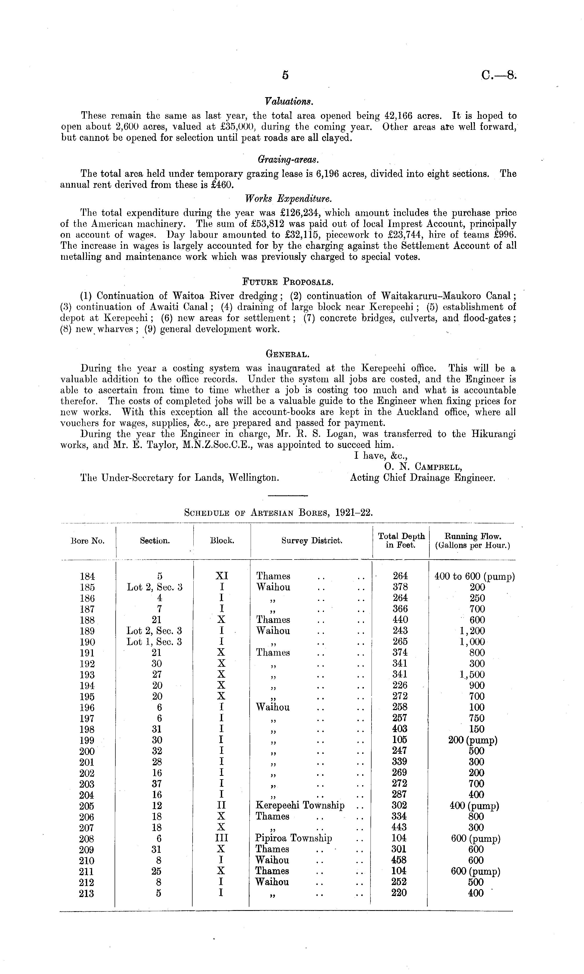 Valuations. These remain the same as last year, the total area opened, being 4-2,166 acres. It is hoped to open about 2,600 acres, valued at £35,000, during the coming year. Other areas are well forward, but cannot be opened for selection until peat roads are all clayed. Grazing-areas. The total area held under temporary grazing lease is 6,196 acres, divided into eight sections. The annual rent derived from these is £460. Works Expenditure. The total expenditure during the year was £126,234, which amount includes the purchase price of the American machinery. The sum of £53,812 was paid out of local Imprest Account, principally on account of wages. Day labour amounted to £32,115, piecework to £23,744, hire of teams £996. The increase in wages is largely accounted for by the charging against the Settlement Account of all metalling and maintenance work which was previously charged to special votes. Future Proposals. (1) Continuation of Waitoa River dredging; (2) continuation, of Waitakaruru-Maukoro Canal; (3) continuation of Awaiti Canal; (4) draining of large block near Kerepeehi ; (5) establishment of depot at Kerepeehi; (6) new areas for settlement; (7) concrete bridges, culverts, and flood-gates ; (8) new wharves ; (9) general development work. General. During the year a costing system was inaugurated at the Kerepeehi office. This will be a valuable addition to the office records. Under the system all jobs are costed, and the Engineer is able to ascertain from time to time whether a job is costing too much and what is accountable therefor. The costs of completed jobs will be a valuable guide to the Engineer when fixing prices for new works. With this exception all the account-books are kept in the Auckland office, where all vouchers for wages, supplies, &c, are prepared and passed for payment. During the year the Engineer in charge, Mr. R. S. Logan, was transferred to the Hikurangi works, and Mr. E. Taylor, M.N.Z.Soc.C.E., was appointed to succeed him. I have, &c, O. N. Campbell, The Under-Secretary for Lands, Wellington. Acting Chief Drainage Engineer.