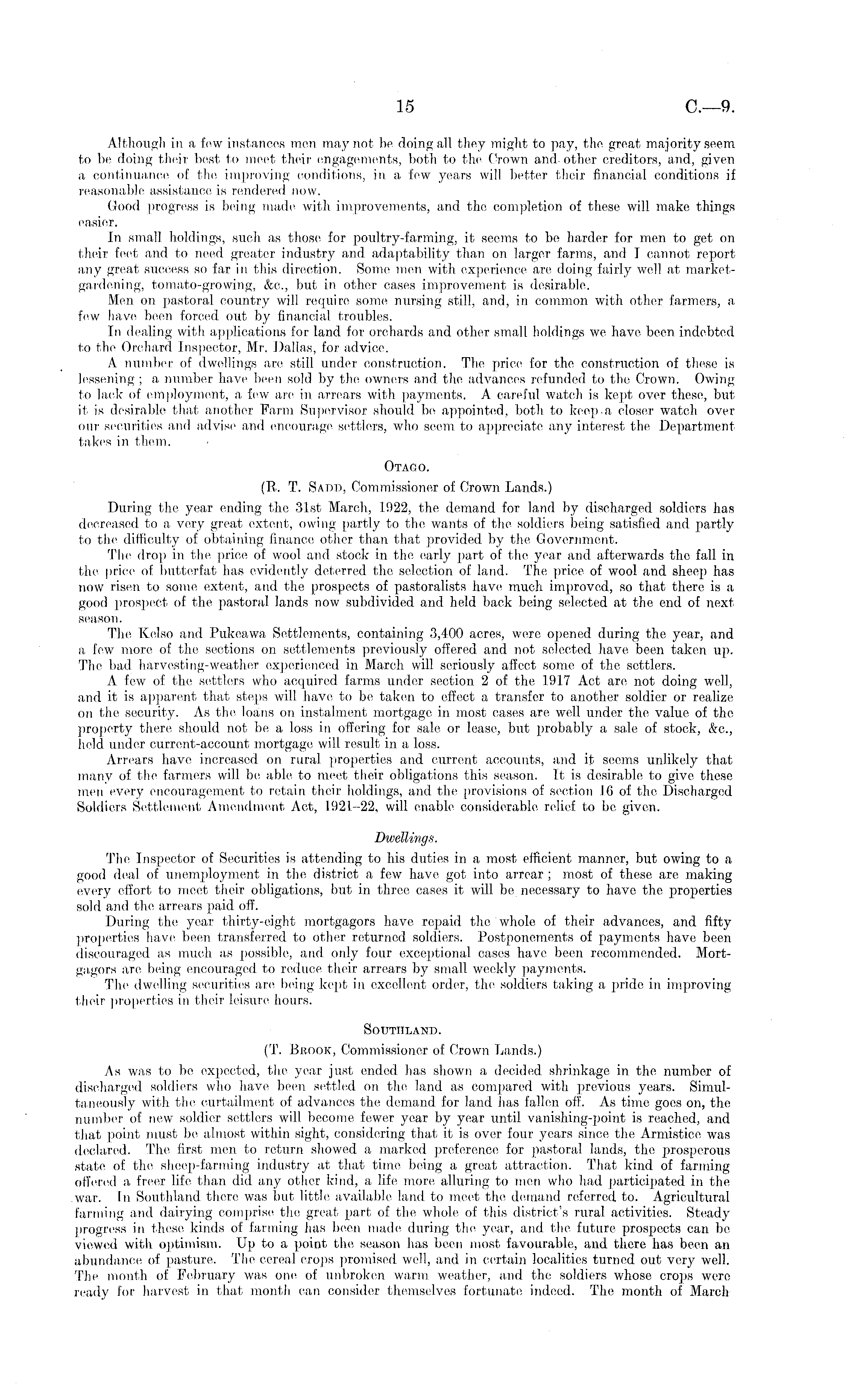 Although in a few instances men may not be doing all they might to pay, the great majority seem to be doing their best to meet their engagements, both to the Crown and other creditors, and, given a continuance of the improving conditions, in a few years will better their financial conditions if reasonable assistance is rendered now. Good progress is being made witli improvements, and the completion of these will make things easier. In small holdings, such as those for poultry-farming, it seems to be harder for men to get on their feet and to need greater industry and adaptability than on larger farms, and I cannot report any great success so far in this direction. Some men with experience art; doing fairly well at marketgardening, tomato-growing, &c, but in other cases improvement is desirable. Men on pastoral country will, require some nursing still, and, in common with other farmers, a few have been forced out by financial troubles. In dealing with applications for land for orchards and other small holdings we have been indebted to the Orchard Inspector, Mr. Dallas, for advice. A number of dwellings are still under construction. The price for the construction of these is lessening ; a number have been sold by the owners and the advances refunded to the Crown. Owing to lack of employment, a few are in arrears with payments. A careful watch is kept over these, but it is desirable that another Farm Supervisor should be appointed, both to keep a closer watch over our securities and advise and encourage settlers, who seem to appreciate any interest the Department takes in them. Otago. (R. T. Sadd, Commissioner of Crown Lands.) During the year ending the 31st March, 1922, the demand for land by discharged soldiers has decreased to a very great extent, owing partly to the wants of the soldiers being satisfied and partly to the difficulty of obtaining finance other than that provided by the Government. The drop in the price of wool and stock in the early j)art of the year and afterwards the fall in the price of butterfat has evidently deterred the selection of land. The price of wool and sheep has now risen to some extent, and the prospects of pastoralists have much improved, so that there is a good prospect of the pastoral lands now subdivided and held back being selected at the end of next season. The Kelso and Pukeawa Settlements, containing 3,400 acres, were opened during the year, and a few more of the sections on settlements previously offered and not selected have been taken up. The bad harvesting-weather experienced in March will seriously affect some of the settlers. A few of the settlers who acquired farms under section 2 of the 1917 Act are not doing well, and it is apparent that steps will have to be taken to effect a transfer to another soldier or realize on the security. As the loans on instalment mortgage in most oases are well under the value of the property there should not be a loss in offering for sale or lease, but probably a sale of stock, &c, neld under current-account mortgage will result in a loss. Arrears have increased on rural properties and current accounts, and it seems unlikely that many of the farmers will be able to meet their obligations this season. It is desirable to give these men every encouragement to retain their holdings, and the provisions of section 16 of the Discharged Soldiers Settlement Amendment Act, 1921-22, will enable considerable relief to be given. Dwellings. The Inspector of Securities is attending to his duties in a most efficient manner, but owing to a good deal of unemployment in the district a few have got into arrear ; most of these are making every effort to meet their obligations, but in three cases it will be necessary to have the properties sold and the arrears paid off. During the year thirty-eight mortgagors have repaid the whole of their advances, and fifty properties have been transferred to other returned soldiers. Postponements of payments have been discouraged as much as possible, and only four exceptional cases have been recommended. Mortgagors are being encouraged to reduce their arrears by small weekly payments. The dwelling securities are being kept in excellent order, the soldiers taking a pride in improving their properties in their leisure hours. Southland. (T. Brook, Commissioner of Crown Lands.) As was to be expected, the year just ended has shown a decided shrinkage in the number of discharged soldiers who have been settled on the land as compared with previous years. Simultaneously with the curtailment of advances the demand for land has fallen off. As time goes on, the number of new soldier settlers will, become fewer year by year until vanishing-point is reached, and that point must be almost within sight, considering that it is over four years since the Armistice was declared. The first men to return showed a marked preference for pastoral lands, the prosperous state of the sheep-farming industry at that time being a great attraction. That kind of farming offered a freer life than did any other kind, a life more alluring to men who had participated in the war. In Southland there was but little available land to meet the demand referred to. Agricultural farming and dairying comprise the great part of the whole of this district's rural activities. Steady progress in these kinds of farming has been made during the year, and the future prosjaccts can be viewed with optimism. Up to a point the season has been most favourable, and there has been an abundance of pasture. The cereal crops promised well, and in certain localities turned out very well. The month of February was one of unbroken warm weather, and the soldiers whose crops were ready for harvest in that month can consider themselves fortunate indeed. The month of March-