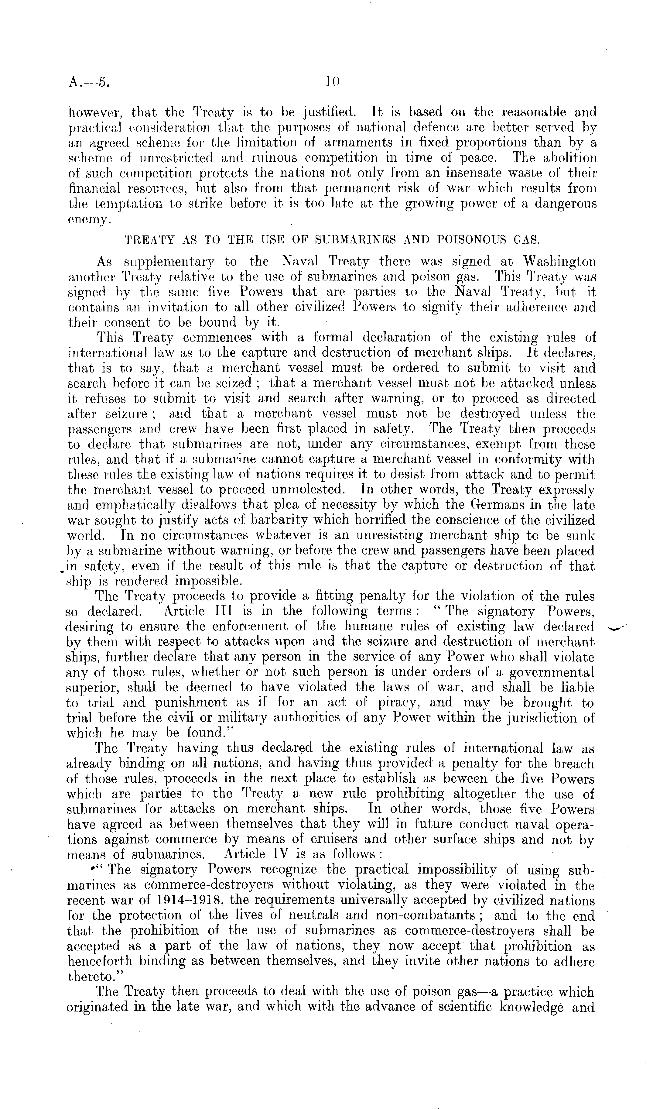 however, that the Treaty is to be justified. It is based on the reasonable and practical consideration that the purposes of national defence are better served by an agreed scheme for the limitation of armaments in fixed proportions than by a scheme of unrestricted and ruinous competition in time of peace. The abolition of such competition protects the nations not only from an insensate waste of their financial resources, but also from that permanent risk of war which results from the temptation to strike before it is too late at the growing power of a dangerous enemy. TREATY AS TO THE USE OF SUBMARINES AND POISONOUS GAS. As supplementary to the Naval Treaty there was signed at Washington another Treaty relative to the use of submarines and poison gas. This Treaty was signed by the same five Powers that are parties to the Naval Treaty, but it contains an invitation to all other civilized Powers to signify their adherence and their consent to lie bound by it. This Treaty commences with a formal declaration of the existing rules of international law as to the capture and destruction of merchant ships, it declares, that is to say, that a merchant vessel must be ordered to submit to visit and search before it can be seized ; that a merchant vessel must not be attacked unless it refuses to submit to visit and search after warning, or to proceed as directed after seizure ; and that a merchant vessel must not be destroyed unless the passengers and crew have been first placed in safety. The Treaty then proceeds to declare that submarines are not, under any circumstances, exempt from these rules, and that if a submarine cannot capture a merchant vessel in conformity with these rules the existing law of nations requires it to desist from attack and to permit the merchant vessel to proceed unmolested. In other words, the Treaty expressly and emphatically disallows that plea of necessity by which the Germans in the late war sought to justify acts of barbarity which horrified the conscience of the civilized world. In no circumstances whatever is an unresisting merchant ship to be sunk by a submarine without warning, or before the crew and passengers have been placed in safety, even if the result of this rule is that the capture or destruction of that ship is rendered impossible. The Treaty proceeds to provide a fitting penalty for the violation of the rules so declared. Article 111 is in the following terms : ' The signatory Powers, desiring to ensure the enforcement of the humane rules of existing law declared *■ by them with respect to attacks upon and the seizure and destruction of merchant ships, further declare that any person in the service of any Power who shall violate any of those rules, whether' or not such person is under orders of a governmental superior, shall be deemed to have violated the laws of war, and shall be liable to trial and punishment as if for an act ol piracy, and may be brought to trial before the civil or military authorities of any Power within the jurisdiction of which he may be found." The Treaty having thus declared the existing rules of international law as already binding on all nations, and having thus provided a penalty for the breach of those rules, proceeds in the next place to establish as beween the five Powers which are parties to the Treaty a new rule prohibiting altogether the use of submarines for attacks on merchant ships. In other words, those five Powers have agreed as between themselves that they will in future conduct naval operations against commerce by means of cruisers and other surface ships and not by means of submarines. Article IV is as follows :— '" The signatory Powers recognize the practical impossibility of using submarines as commerce-destroyers without violating, as they were violated in the recent war of 1914-1918, the requirements universally accepted by civilized nations for the protection of the lives of neutrals and non-combatants ; and to the end that the prohibition of the use of submarines as commerce-destroyers shall be accepted as a part of the law of nations, they now accept that prohibition as henceforth binding as between themselves, and they invite other nations to adhere thereto." The Treaty then proceeds to deal with the use of poison gas —a practice which originated in the late war, and which with the advance of scientific knowledge and