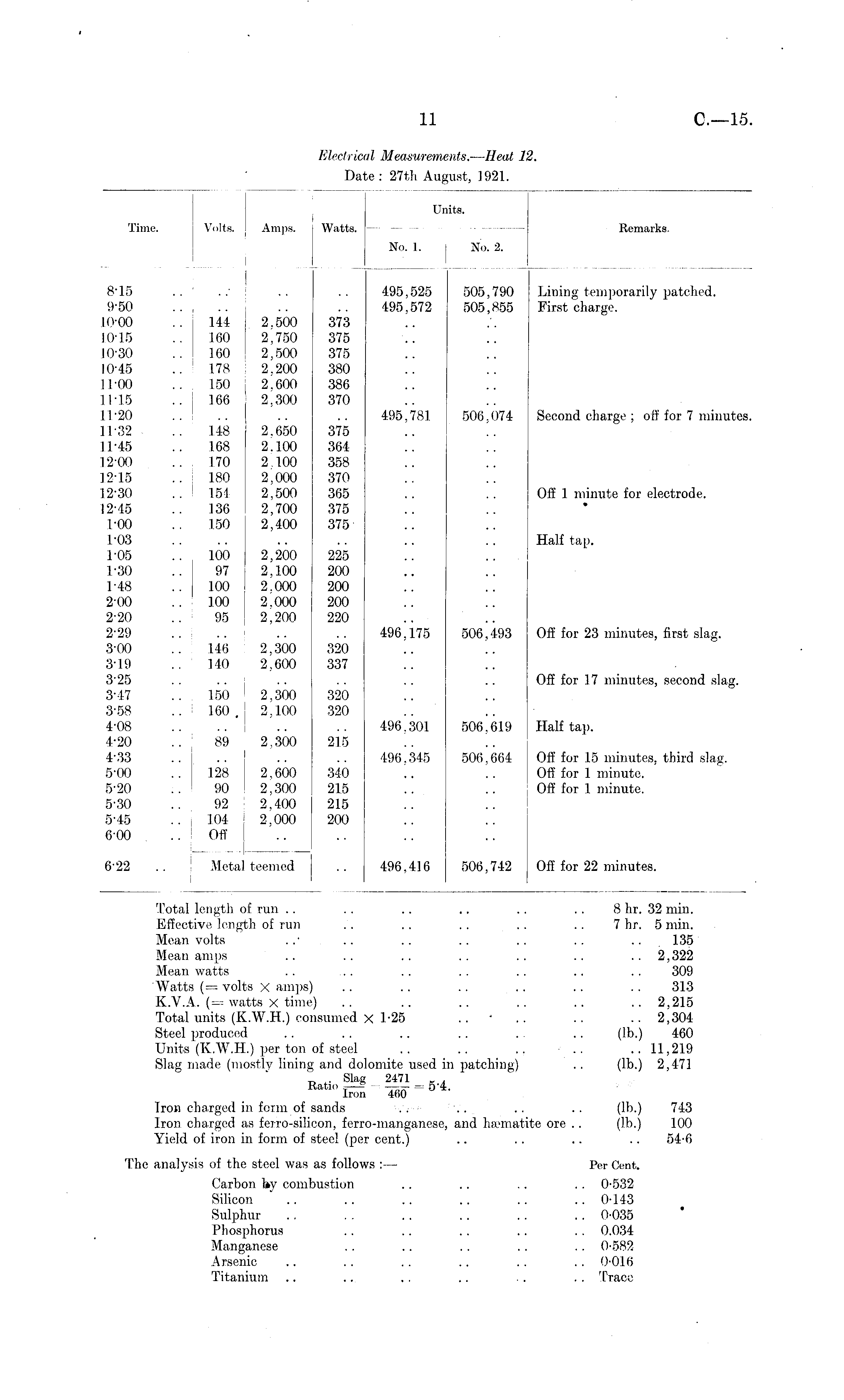 Time. Volts. Amps. Watts. Ui lits. No. 2. Remarks, No. 1. r 8-15 9-50 10-00 10-15 10-30 10-45 11-00 11-15 11 -20 11-32 11-45 12-00 12-15 12-30 12-45 1-00 1-03 1-05 1-30 1-48 2-00 2-20 2-29 3-00 3-19 3-25 3-47 3-58 4-08 4-20 4-33 5-00 5-20 5-30 5-45 6-00 6-22 144 2.500 160 2,750 160 2,500 ..178 2.200 .. ! 150 2,600 166 2,300 .. ' 148 2.650 .. 168 2.100 170 2.100 180 2,000 151 2,500 .. 136 2,700 150 2,400 100 2,200 97 2,100 100 2,000 100 2.000 95 2,200 146 2.300 140 2,600 .. j 150 2,300 .. i 160 , 2,100 89 2,300 I 128 2,600 :. 90 2,300 .. 92 2,400 104 2.000 Off Metal teemed 373 375 375 380 386 370 375 364 358 370 365 375 375 225 200 200 200 220 495,525 495,572 495,781 505,790 505,855 506,074 Lining temporarily patched. First charge. Second charge ; off for 7 minutes. Off 1 minute for electrode. Half tap. 320 337 496,175 506,493 Off for 23 minutes, first slag. 320 320 I Off for 17 minutes, second slag. 215 496.301 506,619 Half tap. 340 215 215 200 496,345 506,664 Off for 15 minutes, third slag. Off for 1 minute. Off for 1 minute. 496,416 506,742 Off for 22 minutes.