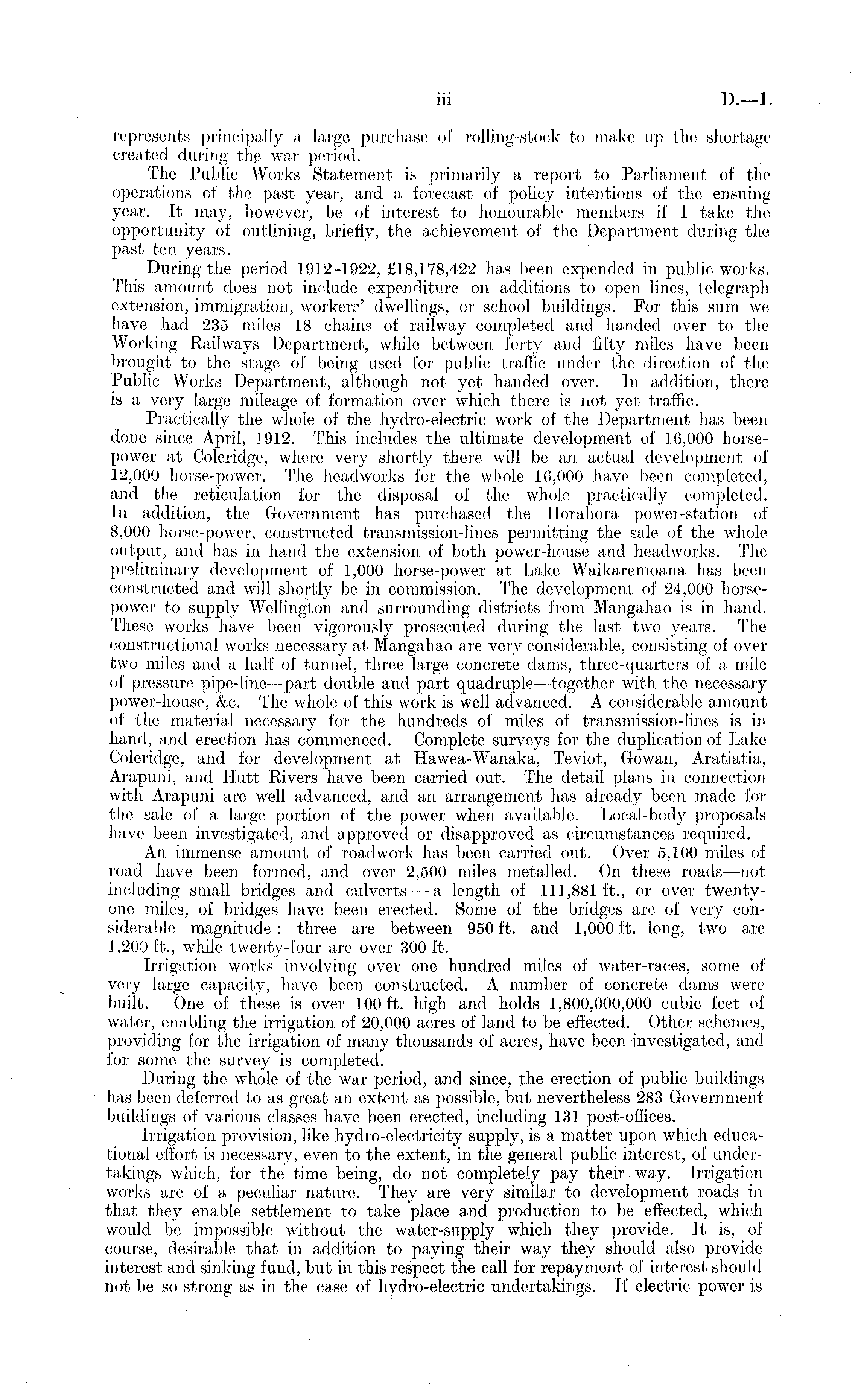 represents principally a large purchase of rolling-stock to make up the shortage created during the war period. The Public Works Statement is primarily a report to Parliament of the operations of the past year, and a forecast of policy intentions of the ensuing year. It may, however, be of interest to honourable members if I take the opportunity of outlining, briefly, the achievement of the Department during the past ten years. During the period 1912-1922, £18,178,422 has been expended in public works. This amount does not include expenditure on additions to open lines, telegraph extension, immigration, workers' dwellings, or school buildings. For this sum we have had 235 miles 18 chains of railway completed and handed over to the Working Railways Department, while between forty and fifty miles have been brought to the stage of being used for public traffic under the direction of the Public Works Department, although not yet handed over. In addition, there is a very large mileage of formation over which, there is not yet traffic. Practically the whole of the hydro-electric work of the Department has been done since April, 1912. This includes the ultimate development of 16,000 horsepower at Coleridge, where very shortly there will be an actual development of 12,000 horse-power. The headworks for the whole 1(5,000 have been completed, and the reticulation for the disposal of the whole practically completed. In addition, the Government has purchased the Horahora power-station of 8,000 horse-power', constructed transmission-lines permitting the sale of the whole output, and has in hand the extension of both power-house and headworks. The preliminary development of 1,000 horse-power at Lake Waikaremoana has been constructed and will shortly be in commission. The development of 24,000 horsepower to supply Wellington and surrounding districts from Mangahao is in hand. These works have been vigorously prosecuted during the last two years. The constructional works necessary at Mangahao are very considerable, consisting of over two miles and a half of tunnel, three large concrete dams, three-quarters of a. mile of pressure pipe-line —part double and part quadruple— together with the necessary power-house, &c. The whole of this work is well advanced. A considerable amount of the material necessary for the hundreds of miles of transmission-fines is in hand, and erection has commenced. Complete surveys for the duplication of Lake Coleridge, and for development at Hawea-Wanaka, Teviot, Gowan, Aratiatia, Arapuni, and Hutt Rivers have been carried out. The detail plans in connection with Arapuni are well advanced, and an arrangement has already been made for the sale of a large portion of the power when available. Local-body proposals have been investigated, and approved or disapproved as circumstances required. An immense amount of roadwork has been carried out. Over 5,100 miles of road have been formed, and over 2,500 miles metalled. On these roads—not including small bridges and culverts — a length of 111,881 ft., or over twentyone miles, of bridges have been erected. Some of the bridges are of very considerable magnitude: three are between 950 ft. and I,oooft. long, two are 1,200 ft., while twenty-four are over 300 ft. Irrigation works involving over one hundred miles of water-races, sonic; of very large capacity, have been constructed. A number of concrete; dams were built. One of these is over 100 ft. high and holds 1,800,000,000 cubic; feet of water, enabling the irrigation of 20,000 acres of land to be effected. Other schemes, providing for the irrigation of many thousands of acres, have been investigated, and for some the survey is completed. During the whole of the war period, and since, the erection of public buildings has been deferred to as great an extent as possible, but nevertheless 283 Government buildings of various classes have been erected, including 131 post-offices. Irrigation provision, like hydro-electricity supply, is a matter upon which educational effort is necessary, even to the extent, in the general public interest, of undertakings which, for the time being, do not completely pay their way. Irrigation works are of a peculiar nature. They are very similar to development roads in that they enable settlement to take place and production to be effected, which would be impossible without the water-supply which they provide. It is, of course, desirable that in addition to paying their way they should also provide interest and sinking fund, but in this respect the call for repayment of interest should not be so strong as in the case of hydro-electric undertakings. If electric power is