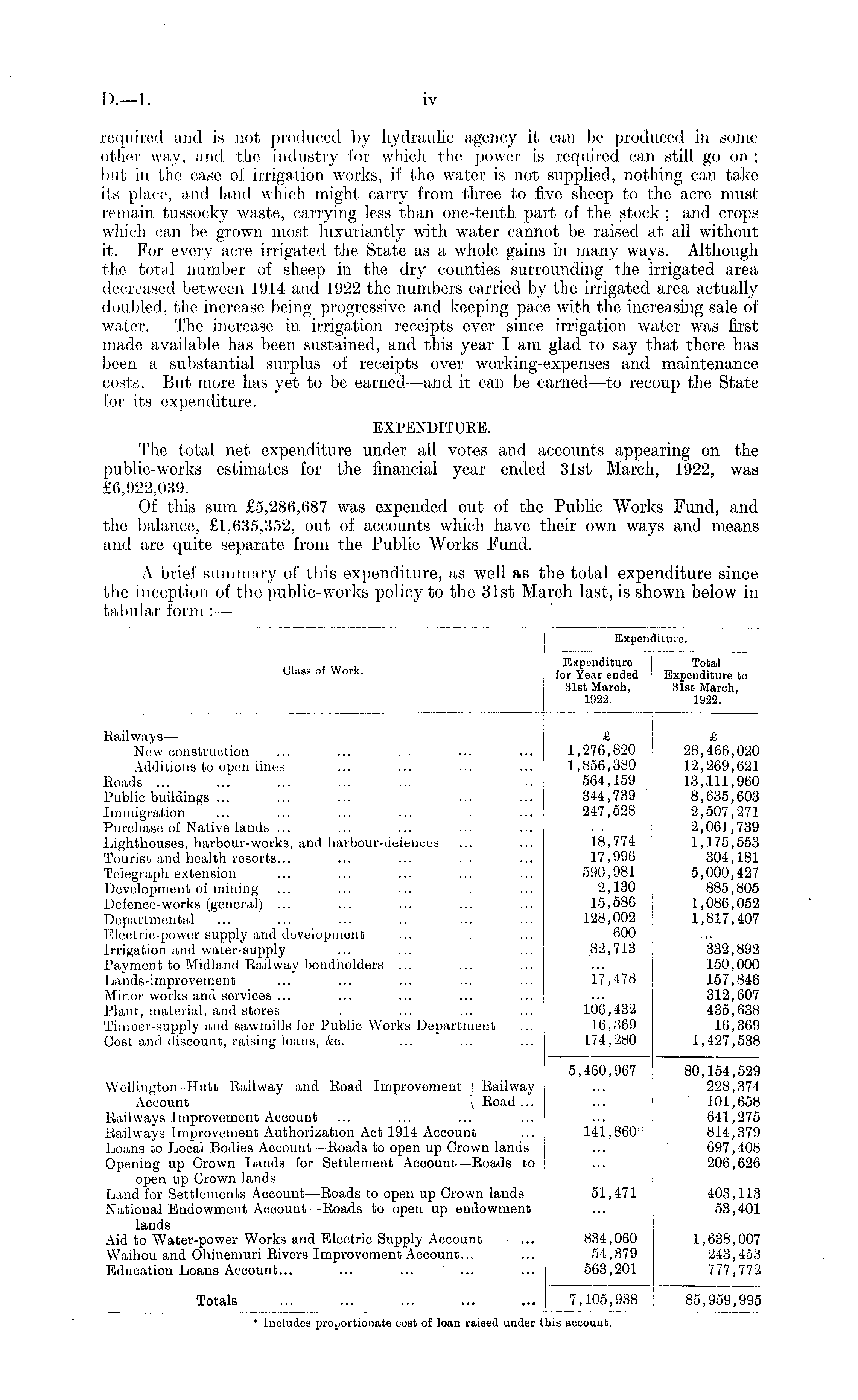 Expem liture. Class of Work. Expenditure for Year ended 31st March, 1922. Total Expenditure to 31st March, 1922. Railways— New construction Additions to open lines Roads ... Public buildings ... Immigration Purchase of Native lands ... Lighthouses, harbour-works, and harbour-defences Tourist and health resorts... Telegraph extension Development of mining Defence-works (general) ... Departmental Electric-power supply and development Irrigation and water-supply Payment to Midland Railway bondholders ... Lands-improvement Minor works and services ... Plant, material, and stores Timber-supply and sawmills for Public Works Department Cost and discount, raising loans, Ajc. £ 1,276,820 1,856,380 564,159 344,739 ' 247,528 £ 28,466,020 12,269,621 13,111,960 8,635,603 2,507,271 2,061,739 1,175,553 304,181 5,000,427 885,805 1,086,052 1,817,407 18,774 17,996 590,981 2,130 15,586 128,002 600 82,713 17,478 332,892 150,000 157,846 312,607 435,638 16,369 1,427,538 106,432 16,369 174,280 Wellington-Hutt Railway and Road Improvement | Railway Account ( Road ... Railways Improvement Account Railways Improvement Authorization Act 1914 Account Loans to Local Bodies Account—Roads to open up Crown lands Opening up Crown Lands for Settlement Account —Roads to open up Crown lands Land for Settlements Account —Roads to open up Crown lands National Endowment Account—Roads to open up endowment lands Aid to Water-power Works and Electric Supply Account Waihou and Ohinemuri Rivers Improvement Account... Education Loans Account... 5,460,967 80,154,529 228,374 101,658 641,275 814,379 697,408 206,626 141,860* 51,471 403,113 53,401 834,060 54,379 563,201 1,638,007 243,453 777,772 Totals 7,105,938 85,959,99£ * Includes proportionate cost of loan raised under t [is account.