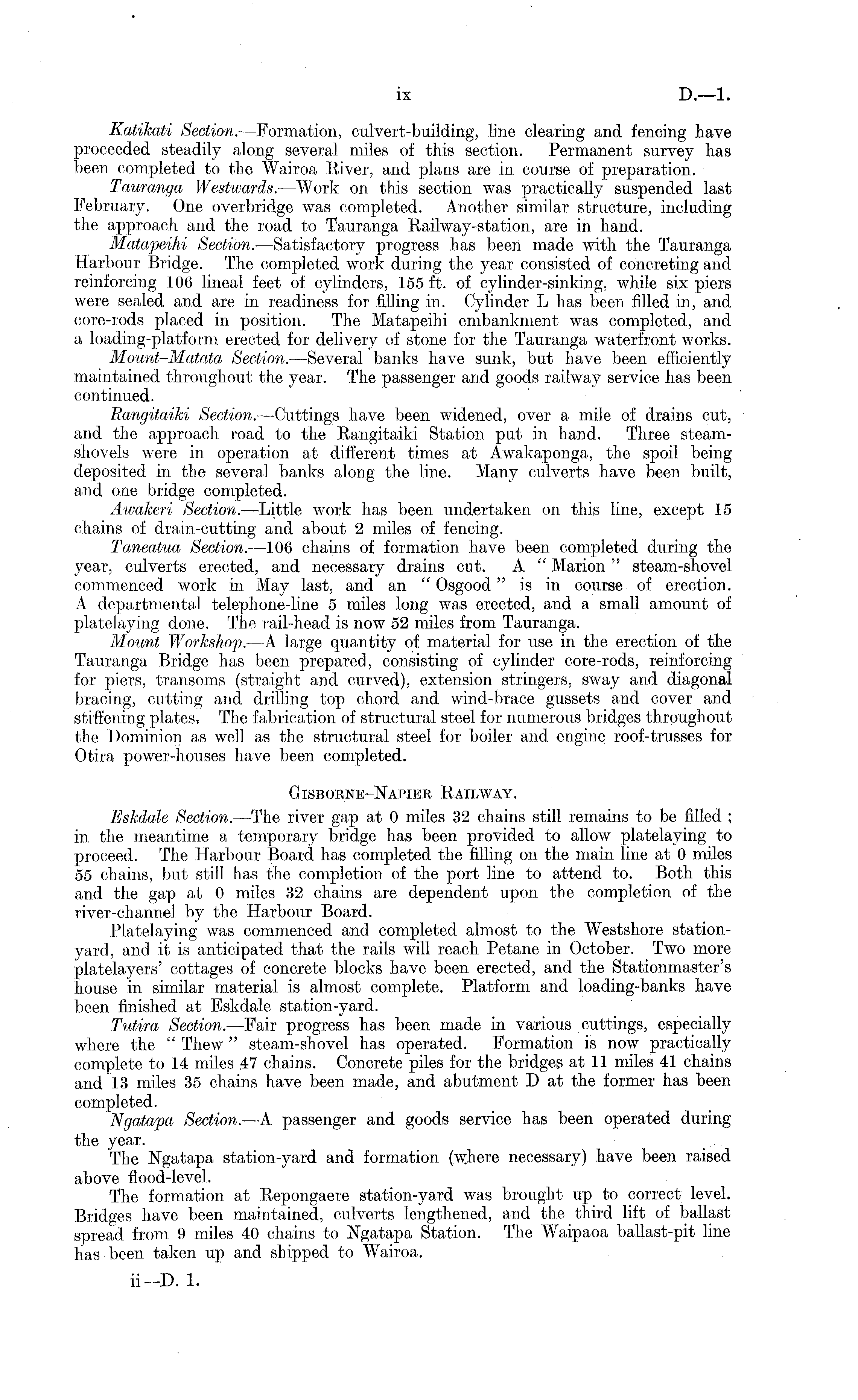 Katikati Section. —Formation, culvert-building, line clearing and fencing have proceeded steadily along several miles of this section. Permanent survey has been completed to the Wairoa River, and plans are in course of preparation. Tauranga Westwards.- —Work on this section was practically suspended last February. One overbridge was completed. Another similar structure, including the approach and the road to Tauranga Railway-station, are in hand. Matapeihi Section. —Satisfactory progress has been made with the Tauranga Harbour Bridge. The completed work during the year consisted of concreting and reinforcing 106 lineal feet of cylinders, 155 ft. of cylinder-sinking, while six piers were sealed and are in readiness for filling in. Cylinder L has been filled in, and core-rods placed in position. The Matapeihi embankment was completed, and a loading-platform erected for delivery of stone for the Tauranga waterfront works. Mount-Matata Section. —Several banks have sunk, but have been efficiently maintained throughout the year. The passenger and goods railway service has been continued. Rangitaiki Section. —Cuttings have been widened, over a mile of drains cut, and the approach road to the Rangitaiki Station put in. hand. Three steamshovels were in operation at different times at Awakaponga, the spoil being deposited in the several banks along the line. Many culverts have been built, and one bridge completed. Awakeri Section. —Little work has been undertaken on this line, except 15 chains of drain-cutting and about 2 miles of fencing. Taneatua Section. —lo6 chains of formation have been completed during the year, culverts erected, and necessary drains cut. A " Marion " steam-shovel commenced work in May last, and an " Osgood" is in course of erection. A departmental telephone-line 5 miles long was erected, and a small amount of platelaying done. The rail-head is now 52 miles from Tauranga. Mount Workshop. —A large quantity of material for use in the erection of the Tauranga Bridge has been prepared, consisting of cylinder core-rods, reinforcing for piers, transoms (straight and curved), extension stringers; sway and diagonal bracing, cutting and drilling top chord and wind-brace gussets and cover and stiffening plates, The fabrication of structural steel for numerous bridges throughout the Dominion as well as the structural steel for boiler and engine roof-trusses for Otira power-houses have been completed. Gisborne-Napier Railway. Eskdale Section. —The river gap at 0 miles 32 chains still remains to be filled ; in the meantime a temporary bridge has been provided to allow platelaying to proceed. The Harbour Board has completed the filling on the main line at 0 miles 55 chains, but still has the completion of the port line to attend to. Both this and the gap at 0 miles 32 chains are dependent upon the completion of the river-channel by the Harbour Board. Platelaying was commenced and completed almost to the Westshore stationyard, and it is anticipated that the rails will reach Petane in October. Two more platelayers' cottages of concrete blocks have been erected, and the Stationmaster's house in similar material is almost complete. Platform and loading-banks have been finished at Eskdale station-yard. Tutira Section. —Fair progress has been made in various cuttings, especially where the " Thew " steam-shovel has operated. Formation is now practically complete to 14 miles 47 chains. Concrete piles for the bridges at 11 miles 41 chains and 13 miles 35 chains have been made, and abutment D at the former has been completed. Ngatapa Section. —A passenger and goods service has been operated during the year. The Ngatapa station-yard and formation (where necessary) have been raised above flood-level. The formation at Repongaere station-yard was brought up to correct level. Bridges have been maintained, culverts lengthened, and the third lift of ballast spread from 9 miles 40 chains to Ngatapa Station. The Waipaoa ballast-pit line has been taken up and shipped to Wairoa.