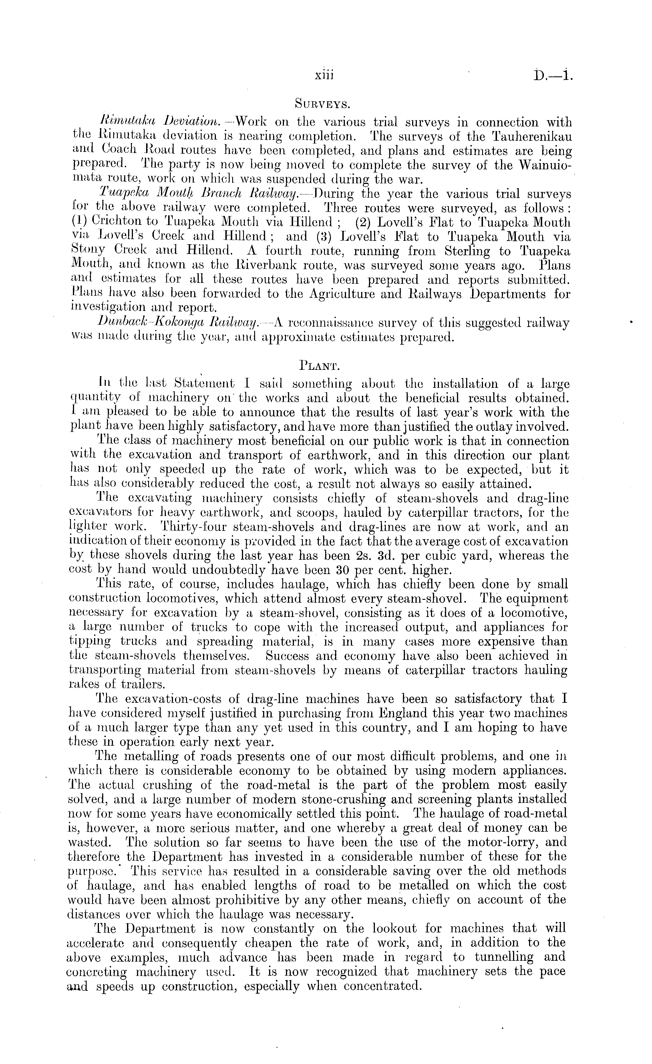 Surveys. Rimutaka Deviation. —Work on the various trial surveys in connection with the Rimutaka deviation is nearing completion. The surveys of the Tauherenikau and Coach Road routes have been completed, and plans and estimates are being prepared. The party is now being moved to complete the survey of the Wainuiomata route, work on which was suspended during the war. Tuapeka Mouth Branch Railway.— During the year the various trial surveys for the above railway were completed. Three routes were surveyed, as follows : (1) Crichton to Tuapeka Mouth via Hillend. ; (2) Lovell's Flat to Tuapeka Mouth via Lovell's Creek and Hillend ; and (3) Lovell's Flat to Tuapeka Mouth via Stony Creek and Hillend. A fourth route, running from Sterling to Tuapeka Mouth, and known as the Riverbank route, was surveyed some years ago. Plans and estimates for all these routes have been prepared and reports submitted. Plans have also been forwarded to the Agriculture and Railways Departments for investigation and report. Dunback-Kokonga Railway.- —A reconnaissance survey of this suggested railway was made during the year, and approximate estimates prepared. Plant. In the last Statement I said something about the installation of a large quantity of machinery on' the works and. about the beneficial results obtained. 1 am pleased to be able to announce that the results of last year's work with the plant have been highly satisfactory, and have more than justified the outlay involved. The class of machinery most beneficial on our public work is that in connection with the excavation and transport of earthwork, and in this direction our plant has not only speeded up the rate of work, which was to be expected, but it has also considerably reduced the cost, a result not always so easily attained. The excavating machinery consists chiefly of steam-shovels and drag-line excavators for heavy earthwork, and scoops, hauled by caterpillar tractors, for the lighter work. Thirty-four steam-shovels and drag-lines are now at work, and an indication of their economy is provided in the fact that the average cost of excavation by these shovels during the last year has been 2s. 3d. per cubic yard, whereas the cost by hand would undoubtedly have been 30 per cent, higher. This rate, of course, includes haulage, which has chiefly been done by small construction locomotives, which attend almost every steam-shovel. The equipment necessary for excavation by a steam-shovel, consisting as it does of a locomotive, a large number of trucks to cope with the increased output, and appliances for tipping trucks and spreading material, is in many cases more expensive than the steam-shovels themselves. Success and economy have also been achieved in transporting material from steam-shovels by means of caterpillar tractors hauling rakes of trailers. The excavation-costs of drag-line machines have been so satisfactory that I have considered myself justified in purchasing from England this year two machines of a much larger type than any yet used in this country, and I am hoping to have these in operation early next year. The metalling of roads presents one of our most difficult problems, and one in which there is considerable economy to be obtained by using modern appliances. The actual crushing of the road-metal is the part of the problem most easily solved, and a large number of modern stone-crushing and screening plants installed now for some years have economically settled this point. The haulage of road-metal is, however, a more serious matter, and one whereby a great deal of money can be wasted. The solution so far seems to have been the use of the motor-lorry, and therefore the Department has invested in a considerable number of these for the purpose. This service has resulted in a considerable saving over the old methods of haulage, and has enabled lengths of road to be metalled on which the cost would have been almost prohibitive by any other means, chiefly on account of the distances over which the haulage was necessary. The Department is now constantly on the lookout for machines that will accelerate and consequently cheapen the rate of work, and, in addition to the above examples, much advance has been made in regard to tunnelling and concreting machinery used. It is now recognized that machinery sets the pace and speeds up construction, especially when concentrated.