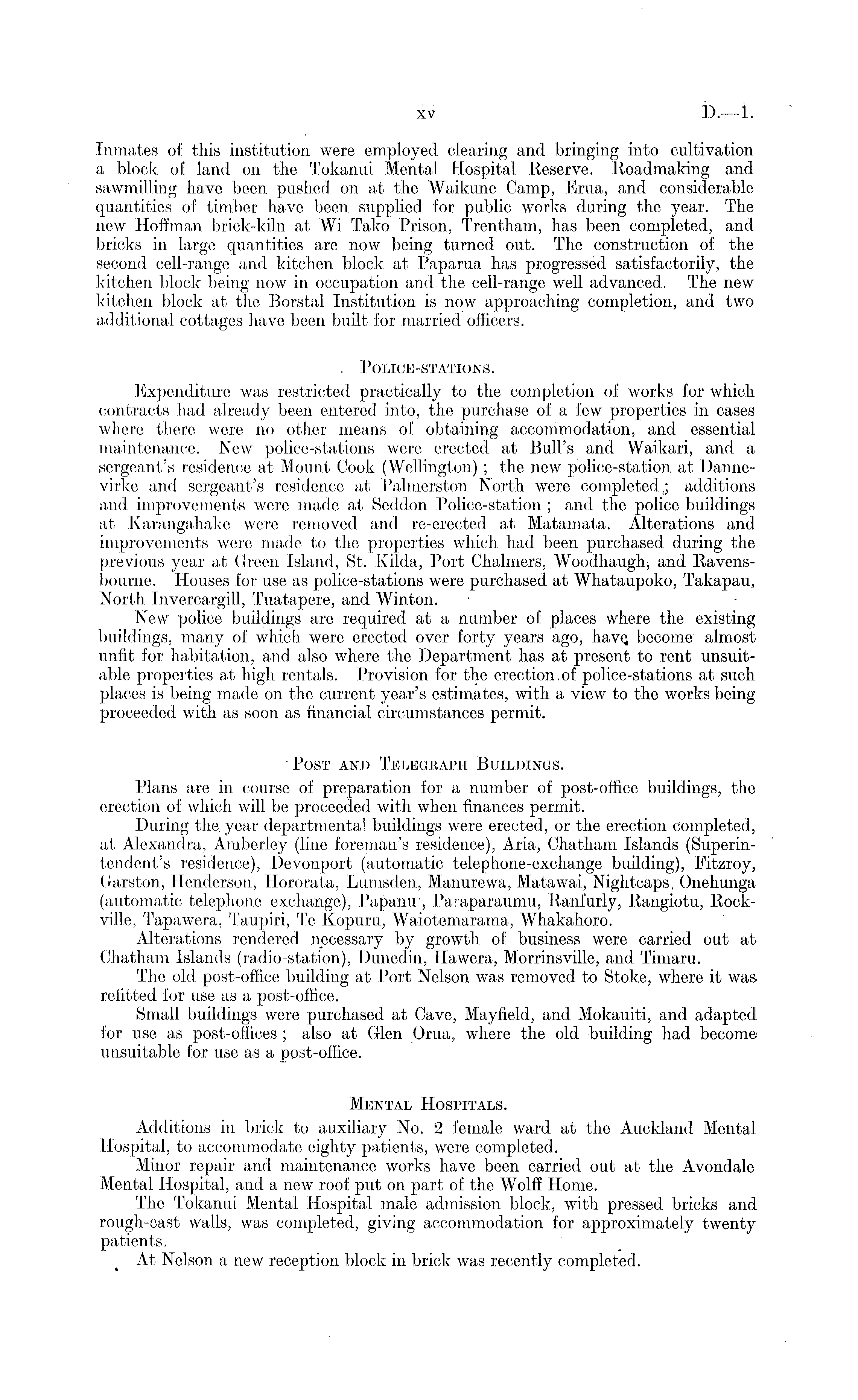 Inmates of this institution were employed clearing and bringing into cultivation a block of land on the Tokanui Mental Hospital Reserve. Roadmaking and sawmilling have been pushed on at the Waikune Camp, Erua, and considerable quantities of timber have been supplied for public works during the year. The new Hoffman brick-kiln at Wi Tako Prison, Trentham, has been completed, and bricks in large quantities are now being turned out. The construction of the second cell-range and kitchen block at Paparua has progressed satisfactorily, the kitchen block being now in occupation and the cell-range well advanced. The new kitchen block at the Borstal Institution is now approaching completion, and two additional cottages have been built for married officers. . Police-stations. Expenditure was restricted practically to the completion of works for which contracts had already been entered, into, the purchase of a few properties in cases where there were no other means of obtaining accommodation, and essential maintenance. New police-stations were erected at Bull's and Waikari, and a sergeant's residence at Mount Cook (Wellington) ; the new police-station at Dannevirke and. sergeant's residence at Palmerston North were completed,; additions and improvements were made at Seddon Police-station ; and the police buildings at Karangahake were removed and re-erected at Matamata. Alterations and improvements were made to the properties which had been purchased during the previous year at Green Island, St. Kilda, Port Chalmers, Woodhaugh, and Ravensbourne. Houses for use as police-stations were purchased at Whataupoko, Takapau, North Invercargill, Tuatapere, and Winton. New police buildings are required at a number of places where the existing buildings, many of which were erected over forty years ago, havQ become almost unfit for habitation, and also where the Department has at present to rent unsuitable properties at high rentals. Provision for the erection.of police-stations at such places is being made on the current year's estimates, with a view to the works being proceeded with as soon as financial circumstances permit. Post and Telegraph Buildings. Plans are in course of preparation for a number of post-office buildings, the erection of which will be proceeded with when finances permit. During the year departmental buildings were erected, or the erection completed, at Alexandra, Amberley (line foreman's residence), Aria, Chatham Islands (Superintendent's residence), Devonport (automatic telephone-exchange building), Fitzroy, Carston, Henderson, Hororata, Lumsden, Manurewa, Matawai, Nightcaps, Onehunga (automatic telephone exchange), Papanu , Paraparaumu, Ranfurly, Rangiotu, Rockviile, Tapawera, Taupiri, Te Kopuru, Waiotemarama, Whakahoro. Alterations rendered necessary by growth of business were carried out at Chatham Islands (radio-station), Dunedin, Hawera, Morrinsville, and Timaru. The old post-office building at Port Nelson was removed to Stoke, where it was refitted for use as a post-office. Small buildings were purchased at Cave, May field, and Mokauiti, and adapted for use as post-offices ; also at Glen Orua, where the old building had become unsuitable for use as a post-office. Mental Hospitals. Additions in brick to auxiliary No. 2 female ward at the Auckland Mental Hospital, to accommodate eighty patients, were completed. Minor repair and maintenance works have been carried out at the Avondale Mental Hospital, and a new roof put on part of the Wolff Home. The Tokanui Mental Hospital male admission block, with pressed bricks and rough-cast walls, was completed, giving accommodation for approximately twenty patients. At Nelson a new reception block in brick was recently completed.