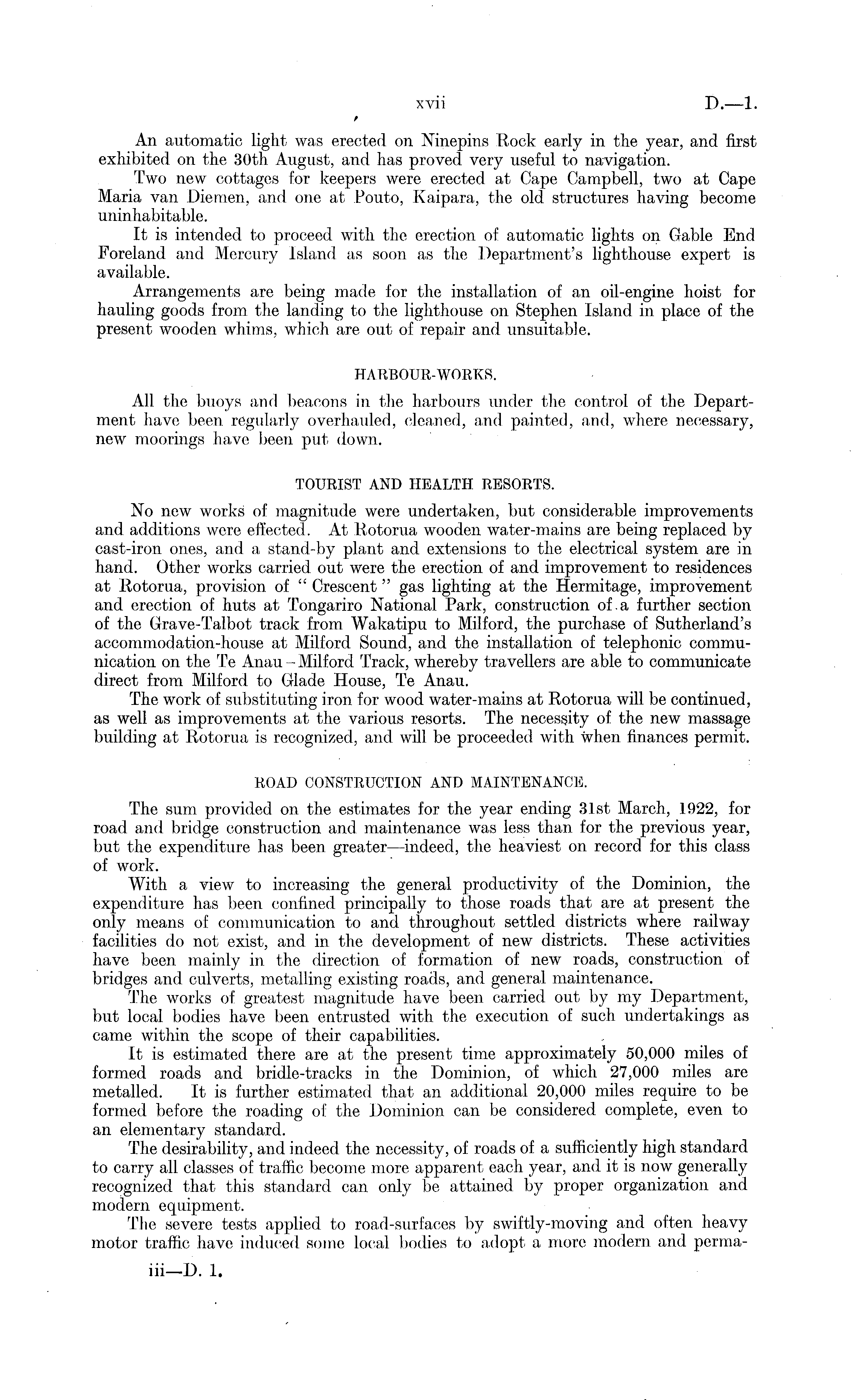 An automatic light was erected on Ninepins Rock early in the year, and first exhibited on the 30th August, and has proved very useful to navigation. Two new cottages for keepers were erected at Cape Campbell, two at Cape Maria van Diemen, and one at Pouto, Kaipara, the old structures having become uninhabitable. It is intended to proceed with the erection of automatic lights on Gable End Foreland and Mercury Island as soon as the Department's lighthouse expert is available. Arrangements are being made for the installation of an oil-engine hoist for hauling goods from the landing to the lighthouse on Stephen Island in place of the present wooden whims, which are out of repair and unsuitable. HARBOUR-WORKS. All the buoys and beacons in the harbours under the control of the Department have been regularly overhauled, cleaned, and painted, and, where necessary, new moorings have been put down. TOURIST AND HEALTH RESORTS. No new works of magnitude were undertaken, but considerable improvements and additions were effected. At Rotorua wooden water-mains are being replaced by cast-iron ones, and a stand-by plant and extensions to the electrical system are in hand. Other works carried out were the erection of and improvement to residences at Rotorua, provision of " Crescent " gas lighting at the Hermitage, improvement and erection of huts at Tongariro National Park, construction of.a further section of the Grave-Talbot track from Wakatipu to Milford, the purchase of Sutherland's accommodation-house at Milford Sound, and the installation of telephonic communication on the Te Anau - Milford Track, whereby travellers are able to communicate direct from Milford to Glade House, Te Anau. The work of substituting iron for wood water-mains at Rotorua will be continued, as well as improvements at the various resorts. The necessity of the new massage building at Rotorua is recognized, and will be proceeded with when finances permit. ROAD CONSTRUCTION AND MAINTENANCE. The sum provided on the estimates for the year ending 31st March, 1922, for road and bridge construction and maintenance was less than for the previous year, but the expenditure has been greater —indeed, the heaviest on record for this class of work. With a view to increasing the general productivity of the Dominion, the expenditure has been confined principally to those roads that are at present the only means of communication to and throughout settled districts where railway facilities do not exist, and in the development of new districts. These activities have been mainly in the direction of formation of new roads, construction of bridges and culverts, metalling existing roads, and general maintenance. The works of greatest magnitude have been carried out by my Department, but local bodies have been entrusted with the execution of such undertakings as came within the scope of their capabilities. It is estimated there are at the present time approximately 50,000 miles of formed roads and bridle-tracks in the Dominion, of which 27,000 miles are metalled. It is further estimated that an additional 20,000 miles require to bo formed before the roading of the Dominion can be considered complete, even to an elementary standard. The desirability, and indeed the necessity, of roads of a sufficiently high standard to carry all classes of traffic become more apparent each year, and it is now generally recognized that this standard can only be attained by proper organization and modern equipment. The severe tests applied to road-surfaces by swiftly-moving and often heavy motor traffic have induced some local bodies to adopt a more modern and perma-
