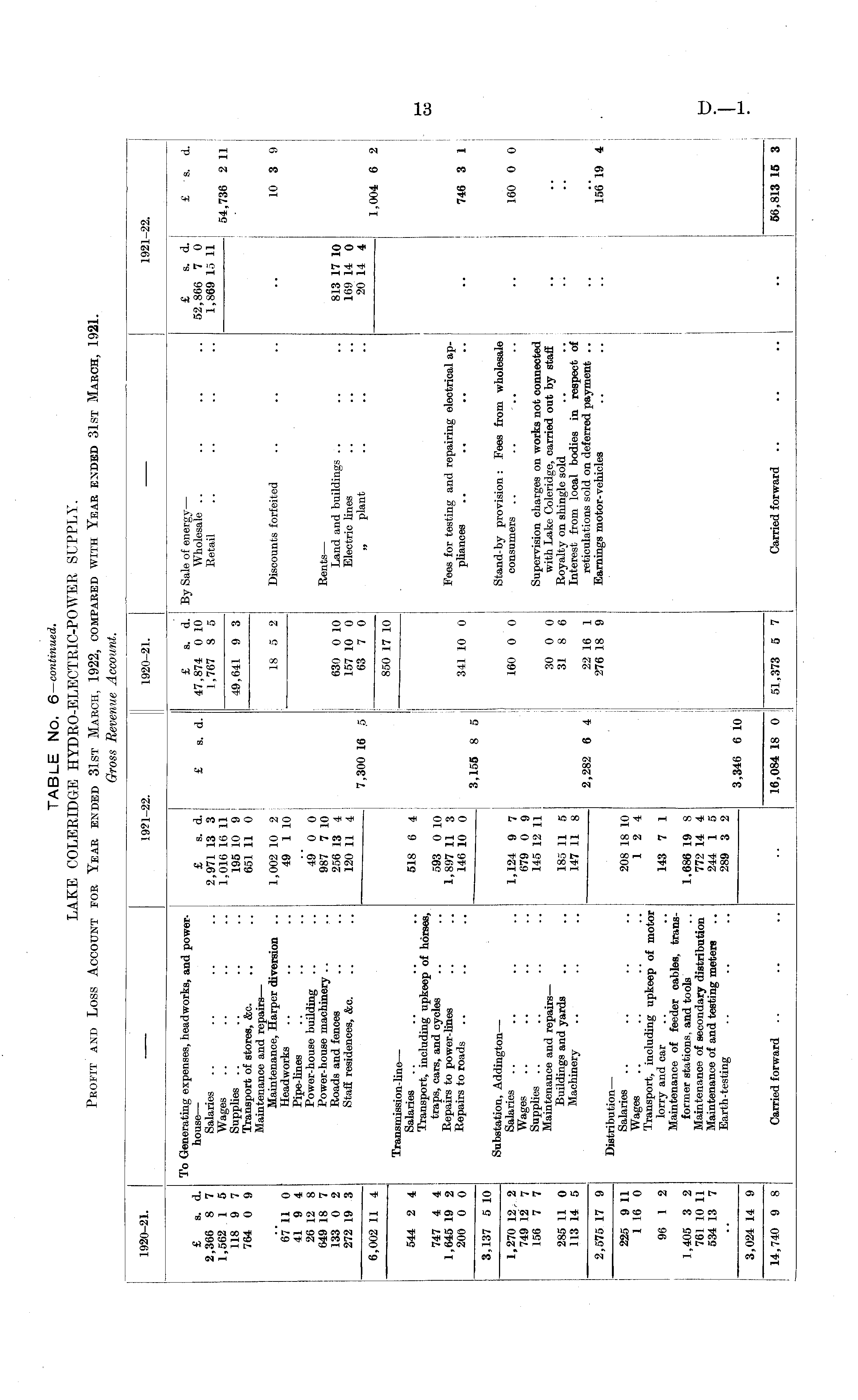 TABLE No. 6—continued. LAKE COLERIDGE HYDRO-ELECTRIC-POWER SUPPLY. Profit and Loss Account for Year ended 31st March, 1922, compared with Year ended 31st March, 1921. Gross Revenue Account.