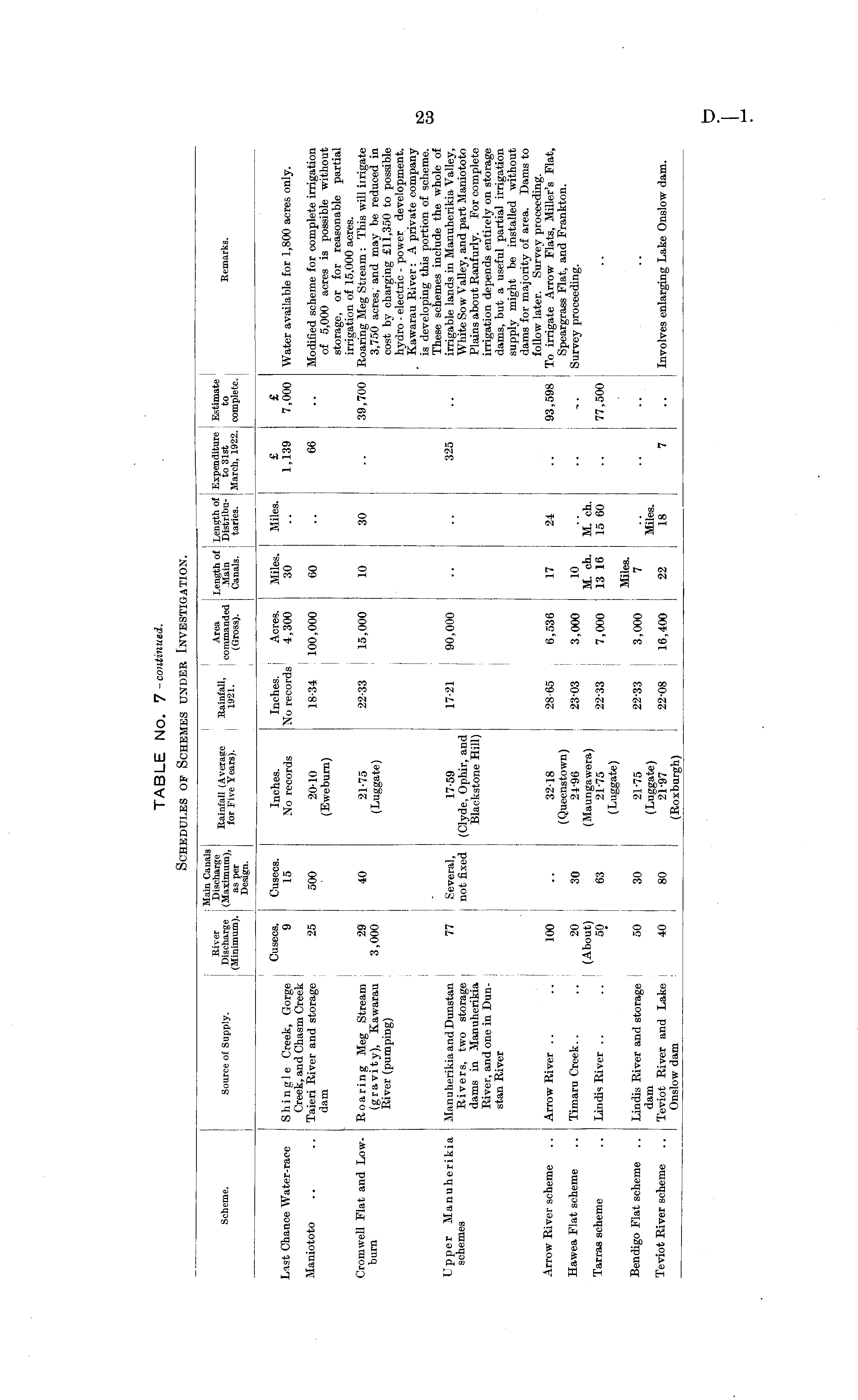 Scheme. i Source of Supply. River Discharge (Minimum). Main Canals Discharge (Maximum), as per Design. Rainfall (Average for Five Years). -p . ... Area I Length of Length of Expenditure isSr commanded j Main Distribu- to 31st lazl - (Gross). ! Canals. taries. March, 1922. J I Estimate to complete. Remarks. I I I Last Chance Water-race Maniototo Cusecs. Cusecs. Shingle Creek, Gorge 9 15 Creek, and Chasm Creek Taieri River and storage 25 500 dam Cusecs. 15 500 Inches. No records Inches. Acres. No records 4,300 Miles. 30 60 Miles. £ 1,139 66 £ 7,000 Water available for 1,800 acres only. Modified scheme for complete irrigation of 5,000 acres is possible without storage, or for reasonable partial irrigation of 15,000 acres. Boaring Meg Stieam : This will iirigate 3,750 acres, and may be reduced in cost by charging £11,350 to possible hydro - electric - power development. Kawarau River: A private company is developing this portion of scheme. These schemes include the whole of irrigable lands in Manuherikia Valley, White Sow Valley, and part Maniototo Plains about Ranfurly. For complete irrigation depends entirely on storage dams, but a useful partial irrigation supply might be installed without dams for majority of area. Dams to follow later. Survey proceeding. To irrigate Arrow Flats, Miller's Flat, Speargrass Flat, and Frankton. Survey proceeding. 20-10 (Ewebum) .„„. 18-34 100,000 Cromwell Flat and Lowburn - Roaring Meg Stream 29 40 (gravity), Kawarau 3,000 River (pumping) 40 21-75 (Luggate) 22-33 15,000 10 30 39,700 Upper Manuherikia schemes - ManuherikiaandDunstan ! 77 Several, Rivers, two storage i not fixed dams in Manuherikia River, and one in Dun- j stan River 17-59 (Clyde, Ophir, and Blackstone Hill) 17-21 90,000 325 Arrow Biver scheme j Arrow River .. .. 100 3218 (Queenstown) 24-96 (Maungawera) 21-75 (Luggate) 28-65 6,536 17 24 93,598 Hawea Flat scheme Timaru Creek.. .. 20 30 (About) Lindis River .. .. 50 63 23 03 3,000 10 M. ch. 13 16 M. ch. 15 60 77,500 I Tarras scheme 22-33 7,000 Bendigo Flat scheme .. Lindis River and storage 50 30 dam Teviot River and Lake j 40 80 Onslow dam 21-75 (Luggate) 21-97 (Roxburgh) 22-33 3,000 Miles. 7 Miles. 18 Teviot Biver scheme 22-08 16,400 22 7 Involves enlarging Lake Onslow dam.