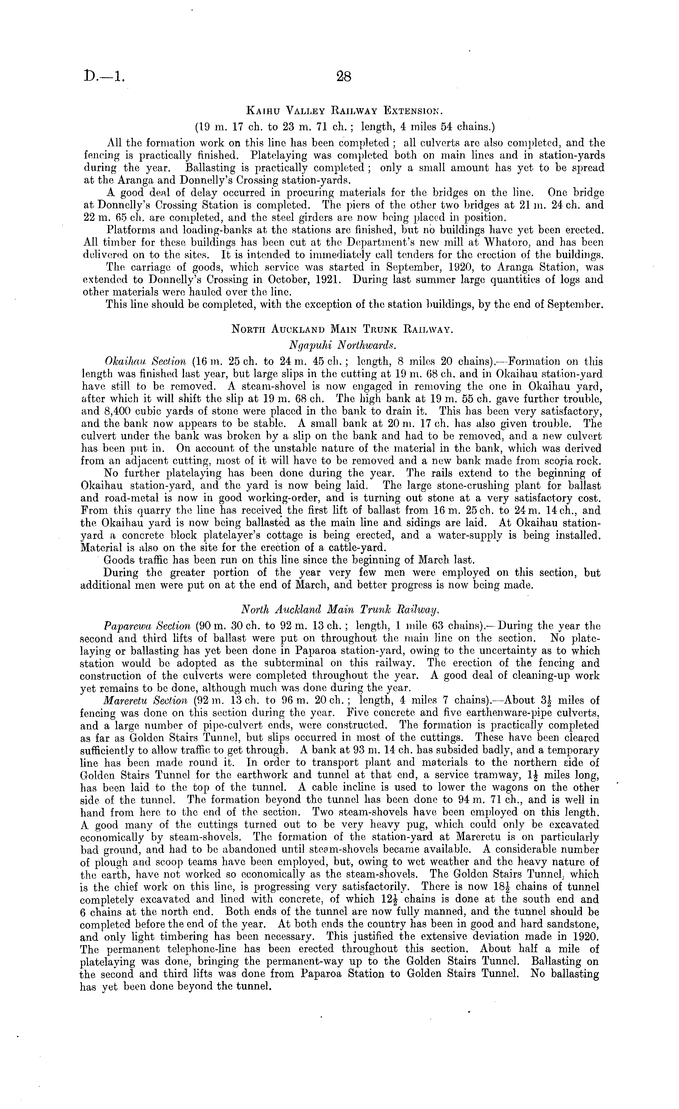Kaihu Valley Railway Extension. (19 m. 17 eh. to 23 m. 71 eh. ; length, 4- miles 54 chains.) All the formation work on this line has been completed ; all culverts are also completed, and the fencing is practically finished. Platelaying was completed both on main lines and in station-yards during the year. Ballasting is practically completed ; only a small amount has yet to be spread at the Aranga and Donnelly's Crossing station-yards. A good deal of delay occurred in procuring materials for the bridges on the line. One bridge at Donnelly's Crossing Station is completed. The piers of the other two bridges at 21m. 24 eh. and 22 m. 65 eh. are completed, and the steel girders are now being placed in position. Platforms and loading-banks at the stations are finished, but no buildings have yet been erected. All timber for these buildings has been cut at the Department's new mill at Whatoro, and has been delivered on to the sites. It is intended to immediately call tenders for the erection of the buildings. The carriage of goods, which service was started in September, 1920, to Aranga Station, was extended to Donnelly's Crossing in October, 1921. During last summer large quantities of logs and other materials were hauled over the line. This line should be completed, with the exception of the station buildings, by the end of September. North Auckland Main Trunk Railway. Ngapuhi Northwards. Okaihau Section (16 m. 25 eh. to 24 m. 45 eh. ; length, 8 miles 20 chains). —Formation on this length was finished last year, but large slips in the cutting at 19 m. 68 eh. and in Okaihau station-yard have still to be removed. A steam-shovel is now engaged in removing the one in Okaihau yard, after which it will shift the slip at 19 m. 68 eh. The high bank at 19 m. 55 eh. gave further trouble, and 8,400 cubic yards of stone were placed in the bank to drain it. This has been very satisfactory, and the bank now appears to be stable. A small bank at 20 m. 17 eh. has also given trouble. The culvert under the bank was broken by a slip on the bank and had to be removed, and a new culvert has been put in. On account of the unstable nature of the material in the bank, which was derived from an adjacent cutting, most of it will have to be removed and a new bank made from scoria rock. No further platelaying has been done during the year. The rails extend to the beginning of Okaihau station-yard, and the yard is now being laid. The large stone-crushing plant for ballast and road-metal is now in good working-order, and is turning out stone at a very satisfactory cost. Prom this quarry the line has received the first lift of ballast from 16 m. 25 eh. to 24 m. 14 eh., and the Okaihau yard is now being ballasted as the main line and sidings are laid. At Okaihau stationyard a concrete block platelayer's cottage is being erected, and a water-supply is being installed. Material is also on the site for the erection of a cattle-yard. Goods traffic has been run on this line since the beginning of March last. During the greater portion of the year very few men were employed on this section, but additional men were put on at the end of March, and better progress is now being made. North Auckland Main Trunk Railway. Paparewa Section (90 m. 30 eh. to 92 m. 13 eh. ; length, 1 mile 63 chains).—During the year the second and third lifts of ballast were put on throughout the main line on the section. No platelaying or ballasting has yet been done in Paparoa station-yard, owing to the uncertainty as to which station would be adopted as the subtcrminal on this railway. The erection of the fencing and construction of the culverts were completed throughout the year. A good deal of cleaning-up work yet remains to be done, although much was done during the year. Mareretu Section (92 m. 13 eh. to 96 m. 20 eh. ; length, 4 miles 7 chains). —About 3J miles of fencing was done on this section during the year. Five concrete and five earthenware-pipe culverts, and a large number of pipe-culvert ends, were constructed. The formation is practically completed as far as Golden Stairs Tunnel, but slips occurred in most of the cuttings. These have been cleared sufficiently to allow traffic to get through. A bank at 93 m. 14 eh. has subsided badly, and a temporary line has been made round it. In order to transport plant and materials to the northern side of Golden Stairs Tunnel for the earthwork and tunnel at that end, a service tramway, 1J miles long, has been laid to the top of the tunnel. A cable incline is used to lower the wagons on the other side of the tunnel. The formation beyond the tunnel has been done to 94 m. 71 eh., and is well in hand from here to the end of the section. Two steam-shovels have been employed on this length. A good, many of the cuttings turned out to be very heavy pug, which could only be excavated economically by steam-shovels. The formation of the station-yard at Mareretu is on particularly bad ground, and had to be abandoned until steam-shovels became available. A considerable number of plough a.nd scoop teams have been employed, but, owing to wet weather and the heavy nature of the earth, have not worked so economically as the steam-shovels. The Golden Stairs Tunnel, which is the chief work on this line, is progressing very satisfactorily. There is now 18| chains of tunnel completely excavated and lined with concrete, of which. 12| chains is done at the south end and 6 chains at the north end. Both ends of the tunnel are now fully manned, and the tunnel should be completed before the end of the year. At both ends the country has been in good and hard sandstone, and only light timbering has been necessary. This justified the extensive deviation made in 1920. The permanent telephone-line has been erected throughout this section. About half a mile of platelaying was done, bringing the permanent-w T ay up to the Golden Stairs Tunnel. Ballasting on the second and third lifts was done from Paparoa Station to Golden Stairs Tun
