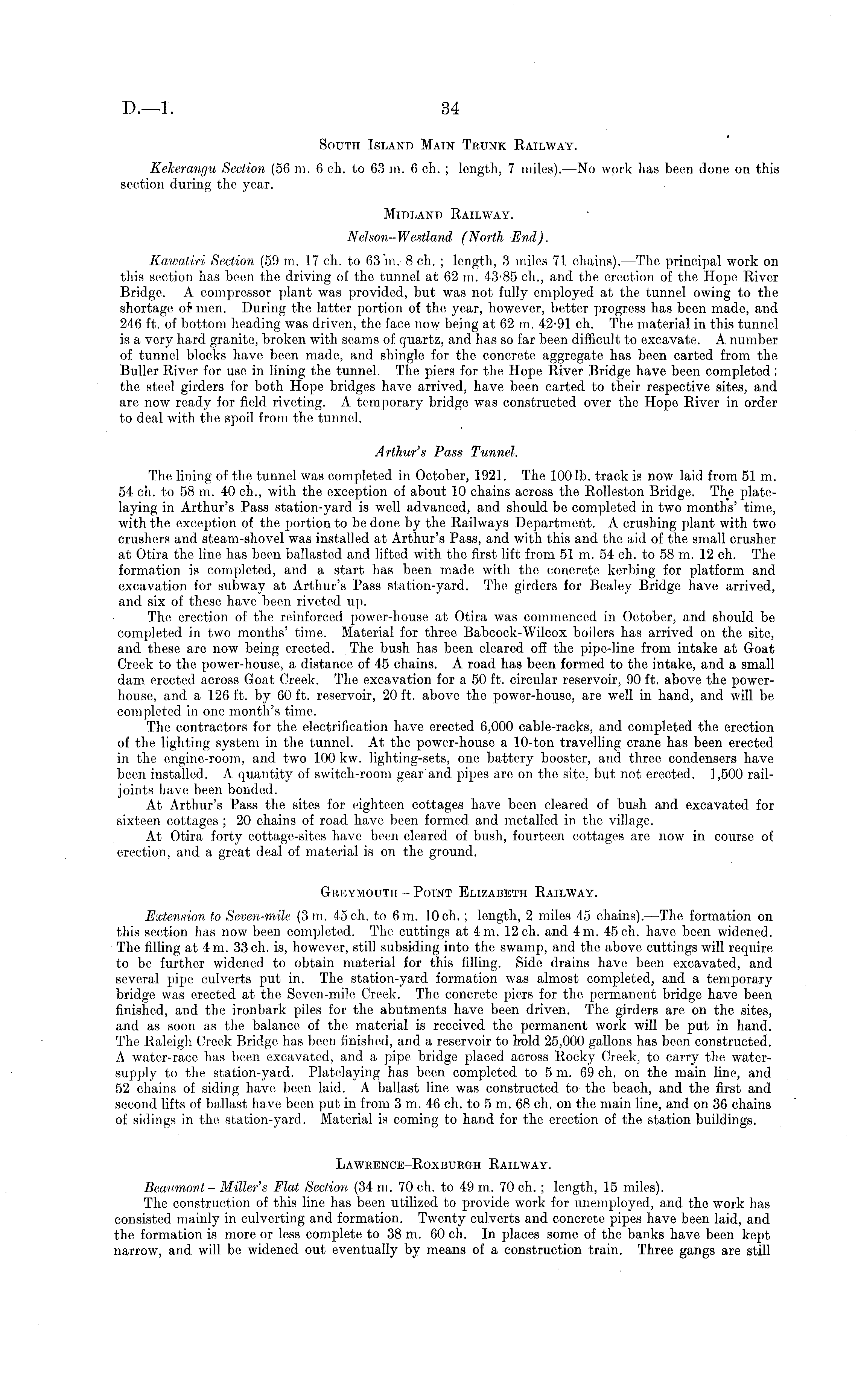 South Island Main Trunk Railway. Kekerangu Section (56 m. 6 eh. to 63 m. 6 eh. ; length, 7 miles). —No work has been done on this section during the year. Midland Railway. Nelson-Westland (North End). Kawatiri Section (59 m. 17 eh. to 63 m. 8 eh. ; length, 3 miles 71. chains). —The principal work on this section has been the driving of tho tunnel at 62 m. 43-85 eh., and the erection of the Hope River Bridge. A compressor plant was provided, but was not fully employed at the tunnel owing to the shortage of* men. During the latter portion of the year, however, better progress has been made, and 246 ft. of bottom heading was driven, the face now being at 62 m. 42-91 eh. The material in this tunnel is a very hard granite, broken with seams of quartz, and has so far been difficult to excavate. A number of tunnel blocks have been made, and shingle for the concrete aggregate, has been carted from the Buffer River for use in lining the tunnel. The piers for the Hope River Bridge have been completed ; the steel girders for both Hope bridges have arrived, have been carted to their respective sites, and are now ready for field riveting. A temporary bridge was constructed over the Hope River in order to deal with the spoil from the tunnel. Arthur's Pass Tunnel. The lining of the tunnel was completed in October, 1921. The 1001b. track is now laid from 51 m. 54 eh. to 58 m. 4-0 eh., with the exception of about 10 chains across the Rolleston Bridge. The platelaying in Arthur's Pass station-yard is well advanced, and should be completed in two months' time, with the exception of the portion to be done by the Railways Department. A. crushing plant with two crushers and steam-shovel was installed at Arthur's Pass, and with this and the aid of the small crusher at Otira tho line has been, ballasted and lifted with the first lift from. 51 m. 54 eh. to 58 m. 12 eh. The formation is completed, and a start has been made with the concrete kerbing for platform and excavation for subway at Arthur's Pass station-yard. The girders for Bealey Bridge have arrived, and six of these have been riveted up. The erection of the reinforced power-house at Otira was commenced in October, and should be completed in two months' time. Material for three Babcock-Wilcox boilers has arrived on the site, and these are now being erected. The bush has been cleared off the pipe-line from intake at Goat Creek to the power-house, a distance of 45 chains. A road has been formed to the intake, and a small dam erected, across Goat Creek. The excavation for aSO ft. circular reservoir, 90 ft. above the powerhouse, and. a 126 ft. by 60 ft. reservoir, 20 ft. above the power-house, are well in hand, and will be completed in one month's time. The contractors for the electrification have erected 6,000 cable-racks, and completed the erection of the lighting system in the tunnel. At the power-house a 10-ton travelling crane has been erected in the engine-room, and two 100 kw. lighting-sets, one battery booster, and three condensers have been installed. A quantity of switch-room gear'and pipes are on the site, but not erected. 1,500 railjoints have been bonded. At Arthur's Pass the sites for eighteen cottages have been cleared of bush and excavated for sixteen cottages ; 20 chains of road have been formed and metalled in the village. At Otira forty cottage-sites have been cleared of bush, fourteen cottages are now in course of erection, and a great deal of material is on the ground. Greymouth - Point Elizabeth Railway. Extension to Seven-mile (3 m. 45 eh. to 6m. 10 eh. ; length, 2 miles 45 chains). —The formation on this section has now been completed. The cuttings at 4m. 12 eh. and 4m. 45 eh. have been widened. The filling at 4 m. 33 eh. is, however, still subsiding into the swamp, and the above cuttings will require to be further widened to obtain material for this filling. Side drains have been excavated, and several pipe culverts put in. The station-yard formation was almost completed, and a temporary bridge was erected at the Seven-mile Creek. The concrete piers for the permanent bridge have been finished, and the ironbark piles for the abutments have been driven. The girders are on the sites, and as soon as the balance of the material is received the permanent work will be put in hand. The Raleigh Creek Bridge has been finished, and a reservoir to hold 25,000 gallons has been constructed. A water-race has been excavated, and a pipe bridge placed across Rocky Creek, to carry the watersupply to the station-yard. Platelaying has been completed to sm. 69 eh. on the main line, and 52 chains of siding have been laid. A ballast line was constructed to the beach, and the first and second lifts of ballast have been put in from 3 m. 46 eh. to 5 m. 68 eh. on the main line, and on 36 chains of sidings in the station-yard. Material is coming to hand for the erection of the station buildings. Lawrence-Roxburgh Railway. Beaumont-Miller's Flat Section (34 m. 70 eh. to 49 m. 70 eh. ; length, 15 miles). The construction of this line has been utilized to provide work for unemployed, and the work has consisted mainly in culverting and formation. Twenty culverts and concrete pipes have been laid, and the formation is more or less complete to 38 m. 60 eh. In places some of the banks have been kept narrow, and will be widened out eventually by means of a construction train. Three gangs are still