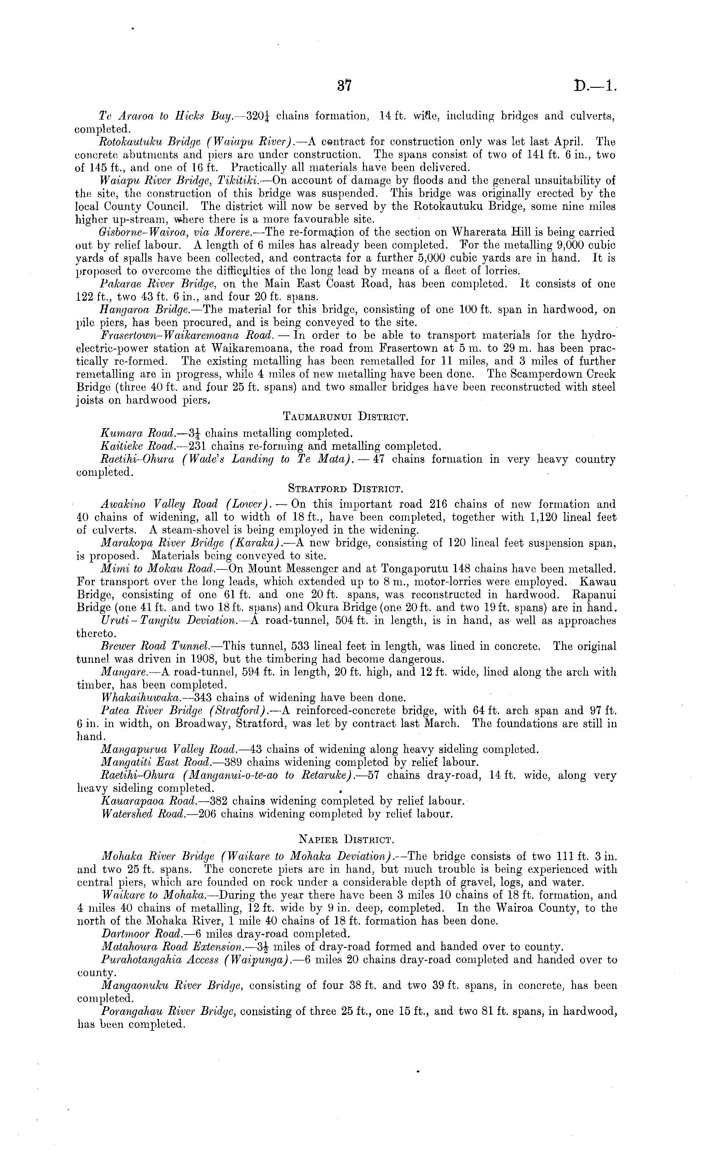 Te Araroa to Hicks Bay. —320-J chains formation, 14 ft. wide, including bridges and culverts, completed. Rotokauluku Bridge (Waiapu River). —A contract for construction only was let last April. The concrete abutments and piers are under construction. The spans consist of two of 141 ft. 6 in., two of 145 ft., and one of 16 ft. Practically all materials have been delivered. Waiapu River Bridge, Tikitiki. —On account of damage by floods and the general unsuitability of the site, the construction of this bridge was suspended. This bridge was originally erected by the local County Council. The district will now be served by the Rotokautuku Bridge, some nine miles higher up-stream, w-here there is a more favourable site. Gisborne-Wairoa, via Morere. —The re-formajrion of the section on Wharerata Hill is being carried out by relief labour. A length of 6 miles has already been completed. For the metalling 9,000 cubic yards of spalls have been collected, and contracts for a further 5,000 cubic yards are in hand. It is proposed to overcome the difficulties of the long lead by means of a fleet of lorries. Pakarae River Bridge, on the Main East Coast Road, has been completed. It consists of one 122 ft., two 43 ft. 6 in., and four 20 ft. spans. Hamjaroa Bridge. —The material for this bridge, consisting of one 100 ft. span in hardwood, on pile piers, has been procured, and is being conveyed to the site. Frasertown-Waikaremoana Road. — In order to be able to transport materials for the hydro-electric-power station at Waikaremoana, the road from Frasertown at 5 m. to 29 m. has been practically re-formed. The existing metalling has been remetalled for 11 miles, and 3 miles of further remetallmg are in progress, while 4 miles of new metalling have been done. The Scamperdown Creek Bridge (three 40 ft. and four 25 ft. spans) and two smaller bridges have been reconstructed with steel joists on hardwood piers. Taumarunui District. Kumara Road. —34; chains metalling completed. Kailieke Road. —231 chains re-forming and metalling completed. Raetihi-Ohura (Wade's Landing to Te Mala). —47 chains formation in very heavy country completed. Stratford District. Awakino Valley Road (Lower). — On this important road 216 chains of new formation and 40 chains of widening, all to width of 18 ft., have been completed, together with 1,120 lineal feet of culverts. A steam-shovel is being employed in the widening. Marakopa River Bridge (Karaka).- A new bridge, consisting of 120 lineal feet suspension span, is proposed. Materials being conveyed to site. Mimi to Mokau Road. —On Mount Messenger and at Tongaporutu 148 chains have been metalled. For transport over the long leads, which extended up to 8 m., motor-lorries were employed. Kawau Bridge, consisting of one 61ft. and one 20 ft. spans, was reconstructed in hardwood. Rapanui Bridge (one 41. ft. and two 18 ft. spans) and Okura Bridge (one 20ft. and two 19 ft. spans) are in hand. TJruti - Tangitu Deviation. —A road-tunnel, 504 ft. in length, is in hand, as well as approaches thereto. Brewer Road Tunnel. —This tunnel, 533 lineal feet in length, was lined in concrete. The original tunnel was driven in 1908, but the timbering had become dangerous. Mangare. —A road-tunnel, 594 ft. in length, 20 ft. high, and 12 ft. wide, lined along the arch with timber, has been completed. Whakaihuwaka.— 343 chains of widening have been done. Patea River Bridge (Stratford). —A reinforced-concrete bridge, with 64 ft. arch span and 97 ft. 6 in. in width, on Broadway, Stratford, was let by contract last March. The foundations are still in hand. Mangapurua Valley Road. —43 chains of widening along heavy sideling completed. Mangatiti East Road. —389 chains widening completed by relief labour. Raetihi-Ohura (Manganui-o-te-ao to Retaruke). —57 chains dray-road, 14 ft. wide, along very heavy sideling completed. , Kauarapaoa Road. -382 chains widening completed by relief labour.Watershed Road. —206 chains widening completed by relief labour. Napier District. Mohaka River Bridge (Waikare to Mohaka Deviation). —The bridge consists of two 111 ft. 3 in. and two 25 ft. spans. The concrete piers arc in hand, but much trouble is being experienced with central piers, which are founded on rock under a considerable depth of gravel, logs, and water. Waikare to Mohaka. —During the year there have been 3 miles 10 chains of 18 ft. formation, and 4 miles 40 chains of metalling, 12 ft. wide by 9 in. deep, completed. In the Wairoa County, to the north of the Mohaka River, 1 mile 40 chains of 18 ft. formation has been done. Dartmoor Road. —6 miles dray-road completed. Matahoura Road Extension. —3£ miles of dray-road formed and handed over to county. Purahotangahia Access (Waipunga). —6 miles 20 chains dray-road completed and handed over to county. Mangaonuku River Bridge, consisting of four 38 ft. and two 39 ft. spans, in concrete, has been completed. Porangahau River Bridge, consisting of three 25 ft., one 15 ft., and two 81 ft. spans, in hardwood, has been completed.