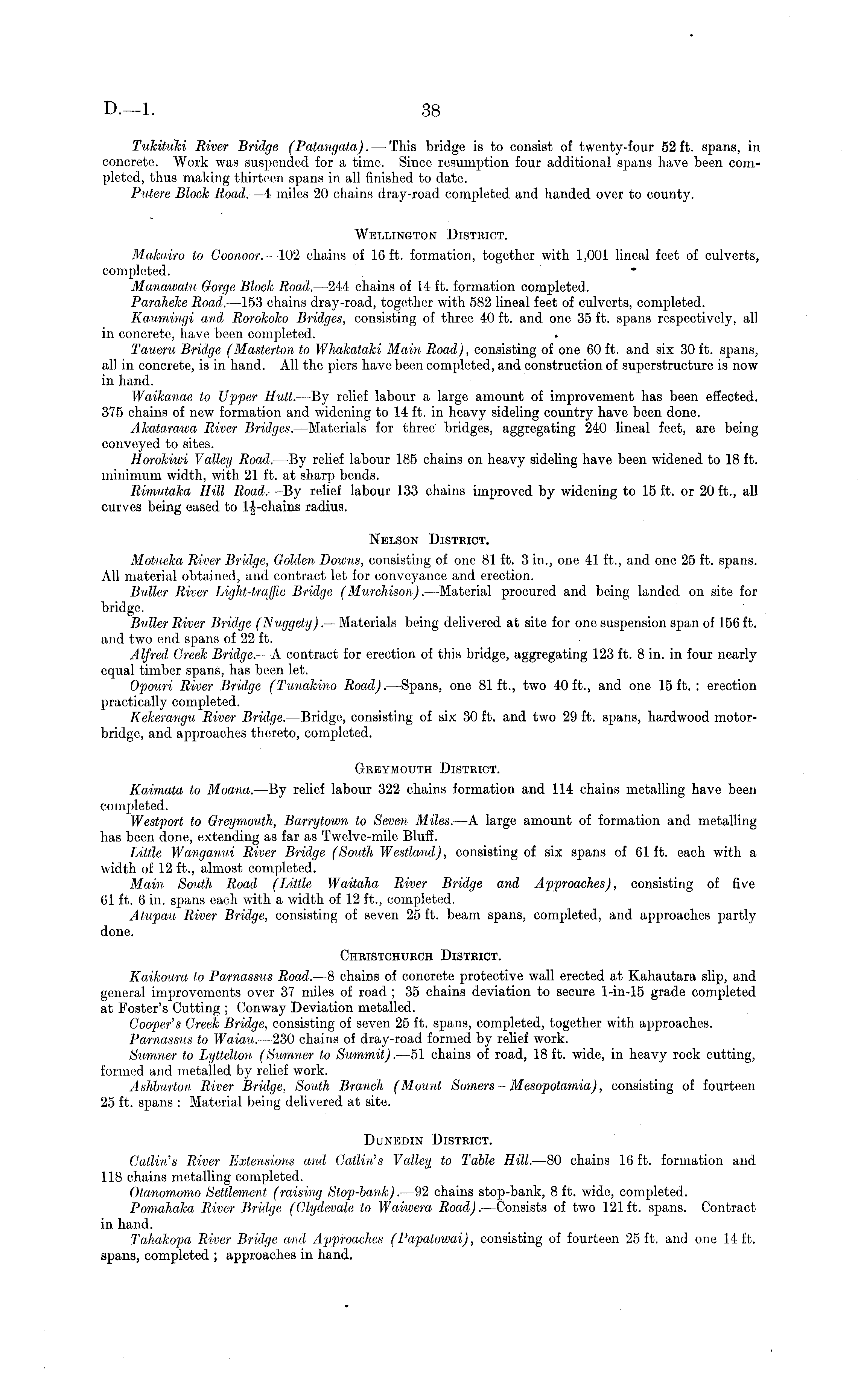 Tukituki River Bridge (Patangata). — This bridge is to consist of twenty-four 52 ft. spans, in concrete. Work was suspended for a time. Since resumption four additional spans have been completed, thus making thirteen spans in all finished to date. Putere Block Road. -4 miles 20 chains dray-road completed and handed over to county. Wellington District. Makairo to Coonoor. 102 chains of 16 ft. formation, together with 1,001 lineal feet of culverts, completed. Manawatu Gorge Block Road. —244 chains of 14 ft. formation completed. Paraheke Road. —ls3 chains dray-road, together with 582 lineal feet of culverts, completed. Kaumingi and Rorokoko Bridges, consisting of three 40 ft. and one 35 ft. spans respectively, all in concrete, have been completed. Taueru Bridge (Masterton to Whakataki Main Road) , consisting of one 60 ft. and six 30 ft. spans, all in concrete, is in hand. All the piers have been completed, and construction of superstructure is now in hand. Waikanae to Upper Hutl. -By relief labour a large amount of improvement has been effected. 375 chains of new formation and widening to 14 ft. in heavy sideling country have been done. Akatarawa River Bridges.- Materials for three' bridges, aggregating 240 lineal feet, are being conveyed to sites. Horokiwi Valley Road. —By relief labour 185 chains on heavy sideling have been widened to 18 ft. minimum width, with 21 ft. at sharp bends. Rimutaka Hill Road. —By relief labour 133 chains improved by widening to 15 ft. or 20 ft., all curves being eased to lj-chains radius. Nelson District. Motueka River Bridge, Golden Downs, consisting of one 81 ft. 3 in., one 41 ft., and one 25 ft. spans. All material obtained, and contract let for conveyance and erection. Duller River Light-traffic Bridge (Murchison). —Material procured and being landed on site for bridge. Butter River Bridge (Nuggely) .— Materials being delivered at site for one suspension span of 156 ft. and two end spans of 22 ft. Alfred Creek Bridge. A contract for erection of this bridge, aggregating 123 ft. 8 in. in four nearly equal timber spans, has been let. Opouri River Bridge (Tunakino Road). — Spans, one 81ft., two 40ft., and one 15 ft. : erection practically completed. Kekerangu River Bridge. —Bridge, consisting of six 30 ft. and two 29 ft. spans, hardwood motorbridge, and approaches thereto, completed. Greymouth District. Kaimata lo Moana. —By relief labour 322 chains formation and 114 chains metalling have been completed. Westport to Greymouth, Barrytown to Seven Miles. —A large amount of formation and metalling has been done, extending as far as Twelve-mile Bluff. Little Wanganui River Bridge (South Westland), consisting of six spans of 61 ft. each with a width of 12 ft., almost completed. Main South Road (Little Waitaha River Bridge and Approaches), consisting of five 61 ft. 6 in. spans each with a width of 12 ft., completed. Atupau River Bridge, consisting of seven 25 ft. beam spans, completed, and approaches partly done. Christchurch District. Kaikoura to Parnassus Road. —B chains of concrete protective wall erected at Kahautara slip, and general improvements over 37 miles of road ; 35 chains deviation to secure l-in-15 grade completed at Foster's Cutting ; Conway Deviation metalled. Cooper's Creek Bridge, consisting of seven 25 ft. spans, completed, together with approaches. Parnassus to Waiau. -230 chains of dray-road formed by relief work. Sumner to Lyttelton (Sumner to Summit). —51 chains of road, 18 ft. wide, in heavy rock cutting, formed and metalled by relief work. Ashburton River Bridge, South Branch (Mount Somers - Mesopotamia), consisting of fourteen 25 ft. spans : Material being delivered at site. Dunedin District. Catlin's River Extensions and Catlin's Valley to Table Hill. —80 chains 16 ft. formation and 118 chains metalling completed. Otanomomo Settlement (raising Stop-bank). —92 chains stop-bank, 8 ft. wide, completed. Pomahaka River Bridge (Clydevale to Waiwera Road). —Consists of two J2l ft. spans. Contract in hand. Tahakopa River Bridge and Approaches (Papatowai), consisting of fourteen 25 ft. and one 14 ft. spans, completed ; approaches in hand.