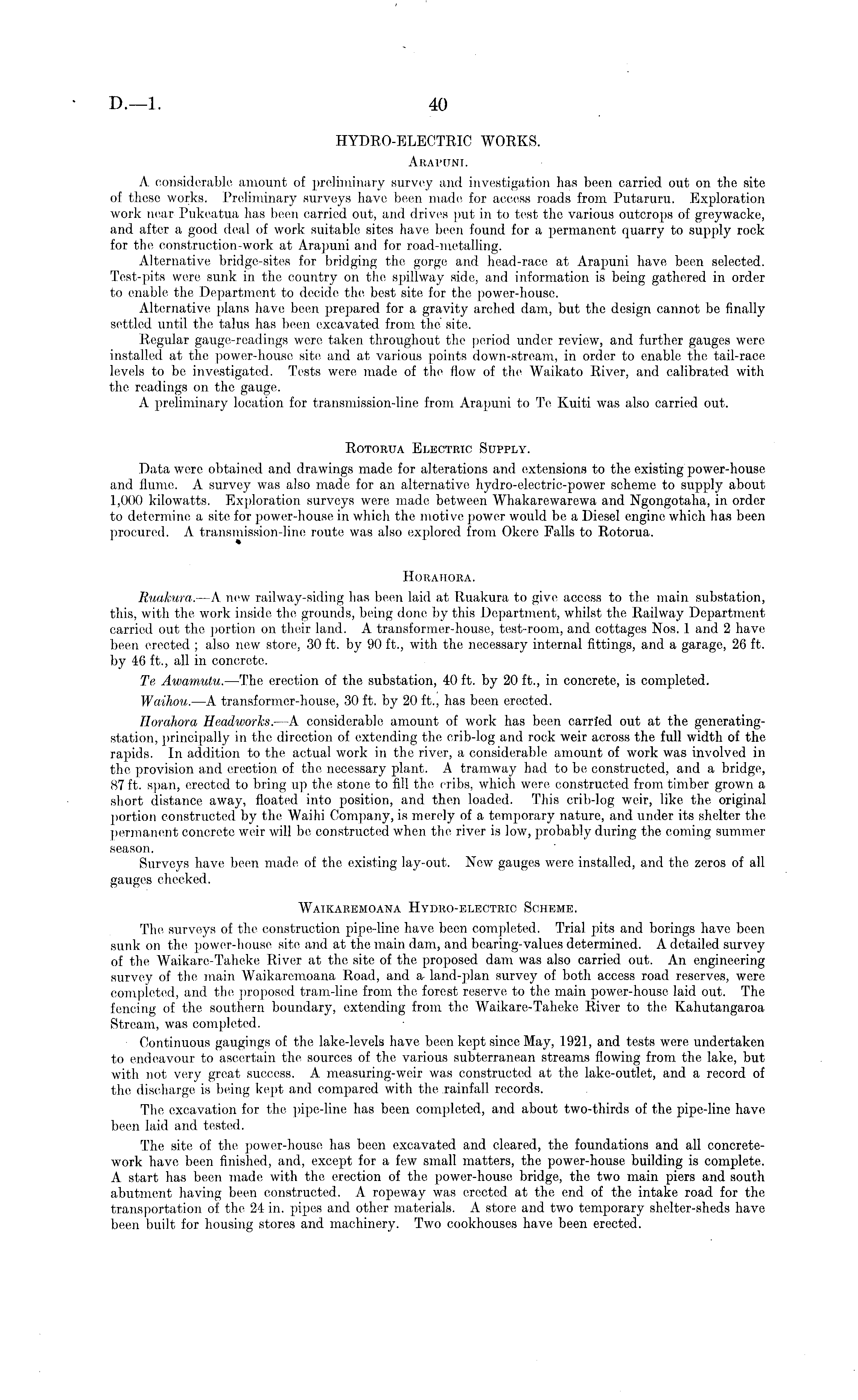 HYDRO-ELECTRIC WORKS. Arapuni. A. considerable amount of preliminary survey and investigation has been carried out on the site of these works. Preliminary surveys have been made for access roads from Putaruru. Exploration work near Pukeatua has been carried out, and drives put in to test the various outcrops of greywacke, and after a good deal of work suitable sites have been found for a permanent quarry to supply rook for the construction-work at Arapuni and for road-metalling. Alternative bridge-sites for bridging the gorge and head-race at Arapuni have been selected. Test-pits were sunk in the country on the spillway side, and information is being gathered in order to enable the Department to decide the best site for the power-house. Alternative plans have been prepared for a gravity arched dam, but the design cannot be finally settled until the talus has been excavated from the site. Regular gauge-readings were taken throughout the period under review, and further gauges were installed at the power-house site and at various points down-stream, in order to enable the tail-race levels to be investigated. Tests were made of the flow of the Waikato River, and calibrated with the readings on the gauge. A preliminary location for transmission-line from Arapuni to Te Kuiti was also carried out. Rotorua Electric Supply. Data were obtained and drawings made for alterations and extensions to the existing power-house and flume. A survey was also made for an alternative hydro-electric-power scheme to supply about 1,000 kilowatts. Exploration surveys were made between Whakarewarewa and Ngongotaha, in order to determine a site for power-house in which the motive power would be a Diesel engine which has been procured. A transmission-line route was also explored from Okere Falls to Rotorua. Horahora. Ruakura. —A new railway-siding has been laid at Ruakura to give access to the main substation, this, with the work inside the grounds, being done by this Department, whilst the Railway Department carried out the portion on their land. A transformer-house, test-room, and cottages Nos. 1 and 2 have been erected ; also new store, 30 ft. by 90 ft., with the necessary internal fittings, and a garage, 26 ft. by 46 ft., all in concrete. Te Awamutu. —The erection of the substation, 40 ft. by 20 ft., in concrete, is completed. Waihou. —A transformer-house, 30 ft. by 20 ft., has been erected. Horahora Headworks. —A considerable amount of work has been carried out at the generatingstation, principally in the direction of extending the crib-log and rock weir across the full width of the rapids. In addition to the actual work in the river, a considerable amount of work was involved in the provision and erection of tho necessary plant. A tramway had to be constructed, and a bridge, 87 ft. span, erected to bring up the stone to fill the cribs, which were constructed from timber grown a short distance away, floated into position, and then loaded. This crib-log weir, like the original portion constructed by the Waihi Company, is merely of a temporary nature, and. under its shelter the permanent concrete weir will be constructed when the river is low, probably during the coming summer season. Surveys have been made of the existing lay-out. New gauges were installed, and the zeros of all gauges checked. Waikaremoana Hydro-electric Scheme. The surveys of the construction pipe-line have been completed. Trial pits and borings have been sunk on the power-house site and at the main dam, and bearing-values determined. A detailed survey of the Waikare-Taheke River at the. site of the proposed dam was also carried out. An engineering survey of the main Waikaremoana Road, and a- land-plan survey of both access road reserves, were completed, and the proposed tram-line from the forest reserve to the main power-house laid out. The fencing of the southern boundary, extending from the Waikare-Taheke River to the Kahutangaroa Stream, was completed. Continuous gaugings of the lake-levels have been kept since May, 1921, and tests were undertaken to endeavour to ascertain the sources of the various subterranean streams flowing from the lake, but with not very great success. A measuring-weir was constructed at the lake-outlet, and a record of the discharge is being kept and compared with the rainfall records. The excavation for the pipe-line has been completed, and about two-thirds of the pipe-line have been laid and tested. The site of the power-house has been excavated and cleared, the foundations and all concretework have been finished, and, except for a few small matters, the power-house building is complete. A start has been made with the erection of the power-house bridge, the two main piers and south abutment having been constructed. A ropeway was erected at the end of the intake road for the transportation of the 24 in. pipes and other materials. A store and two temporary shelter-sheds have been built for housing stores and machinery. Two cookhouses have been erected.