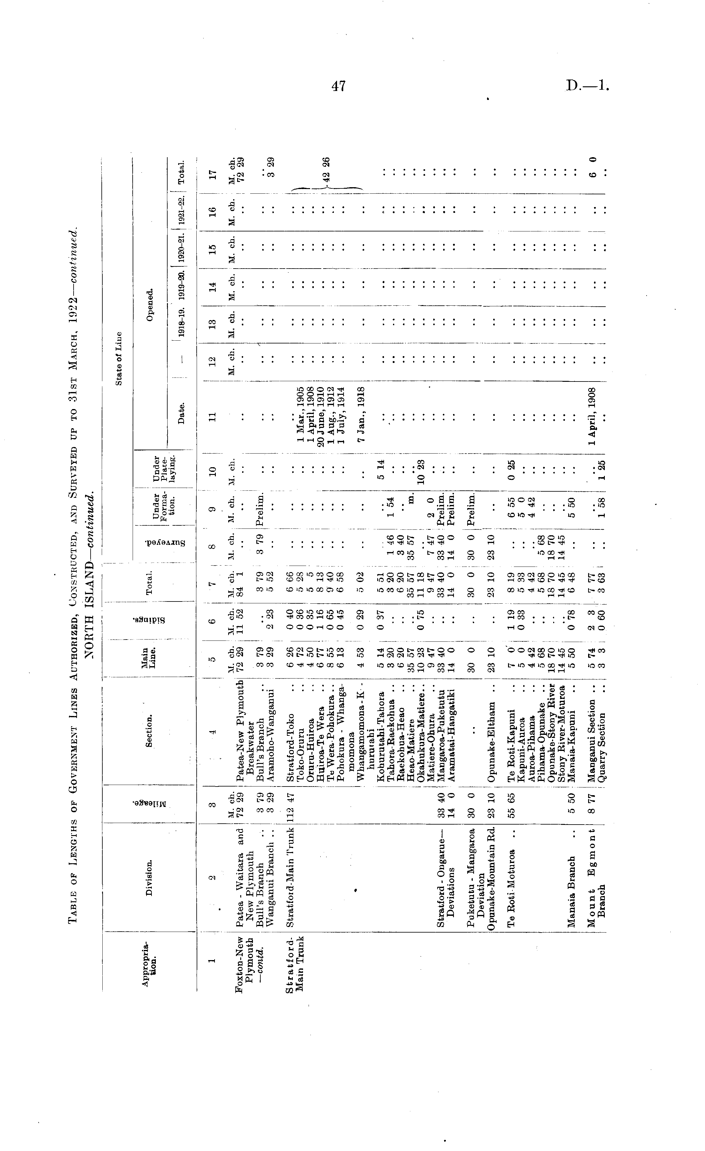Appropriation. Division. as oc as i Section. Main Line. no OS a 3 Total. as > m Under Under Forma- Piatetion. laying. State of Line Opened. Date. 1918-19. 1919-20. I 1920-21. 1921-22. Total. 1 Foxton-New Plymouth — contd. 2 . Patea - Waitara and New Plymouth Bull's Branch Wanganui Branch .. 3 M. ch. 72 29 3 4 5 6 M. ch. M. ch. M. ch. 72 29 ! Patea-New Plymouth 72 29 11 52 Breakwater 3 79 Bull's Branch .. 3 79 3 29 Aramoho-Wanganui 3 29 2 23 7 8 9 M. ch. M. ch. M. ch. 84 1 3 79 3 79 Prelim. 5 52 10 11 12 M. ch. M. ch. 13 M. ch. 14 M. ch. 15 M. ch. 16 17 M. ch. M. ch, .. ! 72 2S 3 79 3 29 32S StratfordMain Trunk Stratford-Main Trunk 112 47 12 47 Stratford-Toko .. 6 26 , 0 40 Toko-Oruru .. 4 72 0 36 Orucu-Huiroa .. 4 50 0 35 Huiroa-Te Wera .. 6 77 1 16 TeWera-Pohokura.. 8 55 0 65 Pohokura - Whanga- 6 13 0 45 momona Whangamomona-K - 4 53 0 29 huruiahi Kohurutahi-Tahora 5 14 0 37 Tahora-Raekohua .. 3 20 Raekohua-Heao .. 6 20 Heao-Matiere .. 35 57 Okahukura-Matiere.. 10 23 0 75 Matiere-Ohura .. 9 47 33 40 Mangaroa-Puketutu 33 40 14 0 Aramatai-Hangatiki 14 0 6 66 5 28 5 5 8 13 9 40 6 58 1 Mar., 1905 1 April, 1908 .. ■ 20 June, 1910 .. 1 Aug., 1912 1 July, 1914 7 Jan., 1918 :: I " j-42 26 5 02 3 20 1 46 1 54 6 20 3 40 35 57 35 57 m. 11 18 9 47 7 47 2 0 33 40 33 40 Prelim. 14 0 14 0 Preiim. 5 14 Stratford - Ongarue — Deviations 10 23 '.'. '.'. " Puketutu - Mangaroa Deviation Opunake-Mountain Bd. 30 0 .. 30 0 i 30 0 30 0 j Prelim. : 23 10 23 10 ! 23 10 Opunake-Eltham .. 23 10 Te Roti Moturoa Manaia Branch 55 65 Te Roti-Kapuni .. 7 0' : 1 19 Kapuni- Auroa .. 5 0 0 33 Auroa-Pihama .. 4 42 Pihama Opunake .. 5 68 Opunake-Stony River 18 70 Stony River-Moturoa 14 45 5 50 Manaia- Kapuni .. 5 50 0 78 8 77 Manganui Section .. 5 74 2 3 Quarry Section .. 3 3 0 60 8 19 .. j 6 55 5 33 .. I 5 0 4 42 .. I 4 42 5 68 5 68 18 70 18 70 14 45 14 45 6 48 .. 5 50 7 77 3 63 ■ .. 1 58 0 25 - - Mount Egmont Branch 1 April, 1908 1 25 . 6 C J