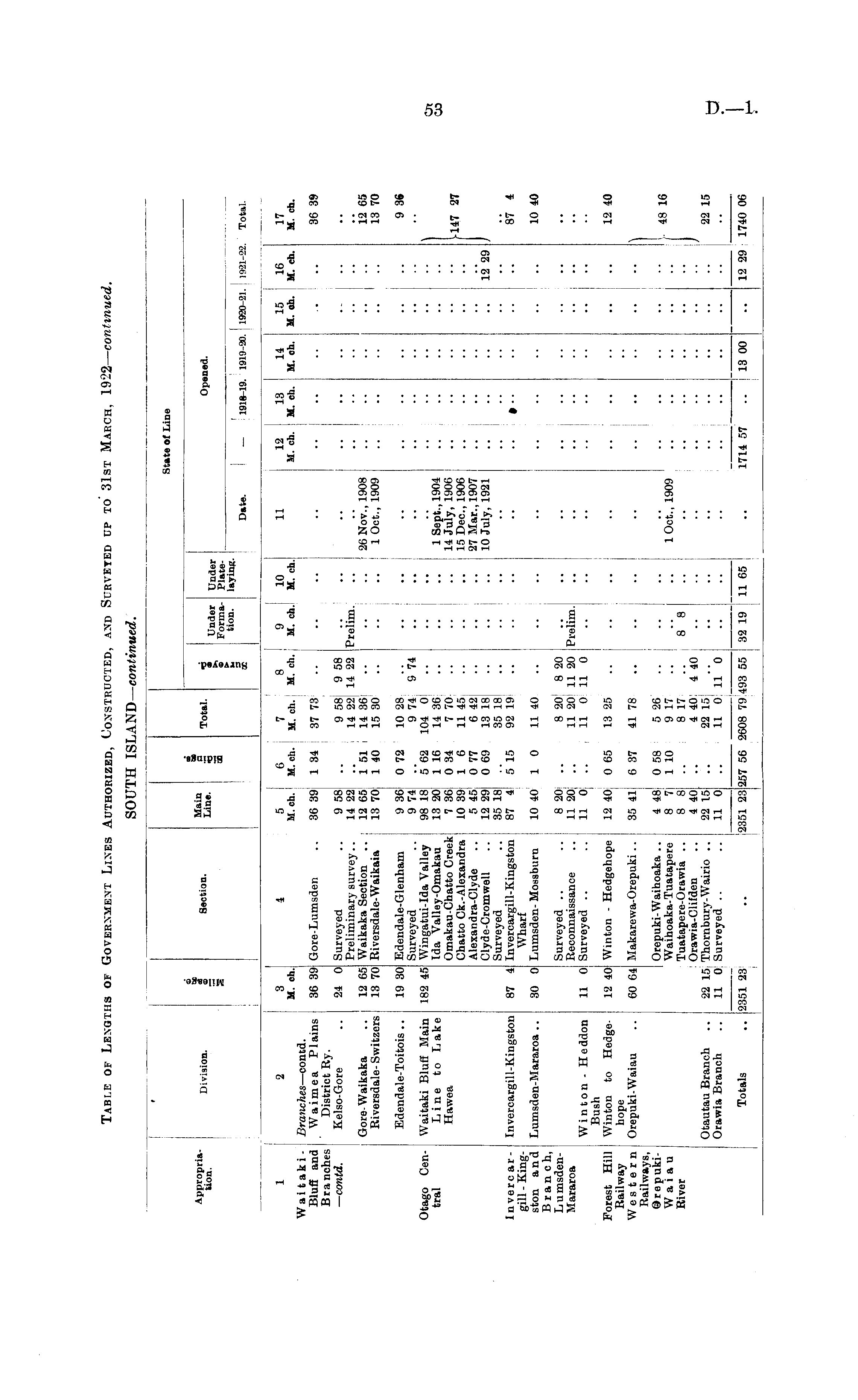 Table of Lengths of Government Lines Authorized, Constructed, and Surveyed up to 31st March, 1922— continued. SOUTH ISLAND— continued.