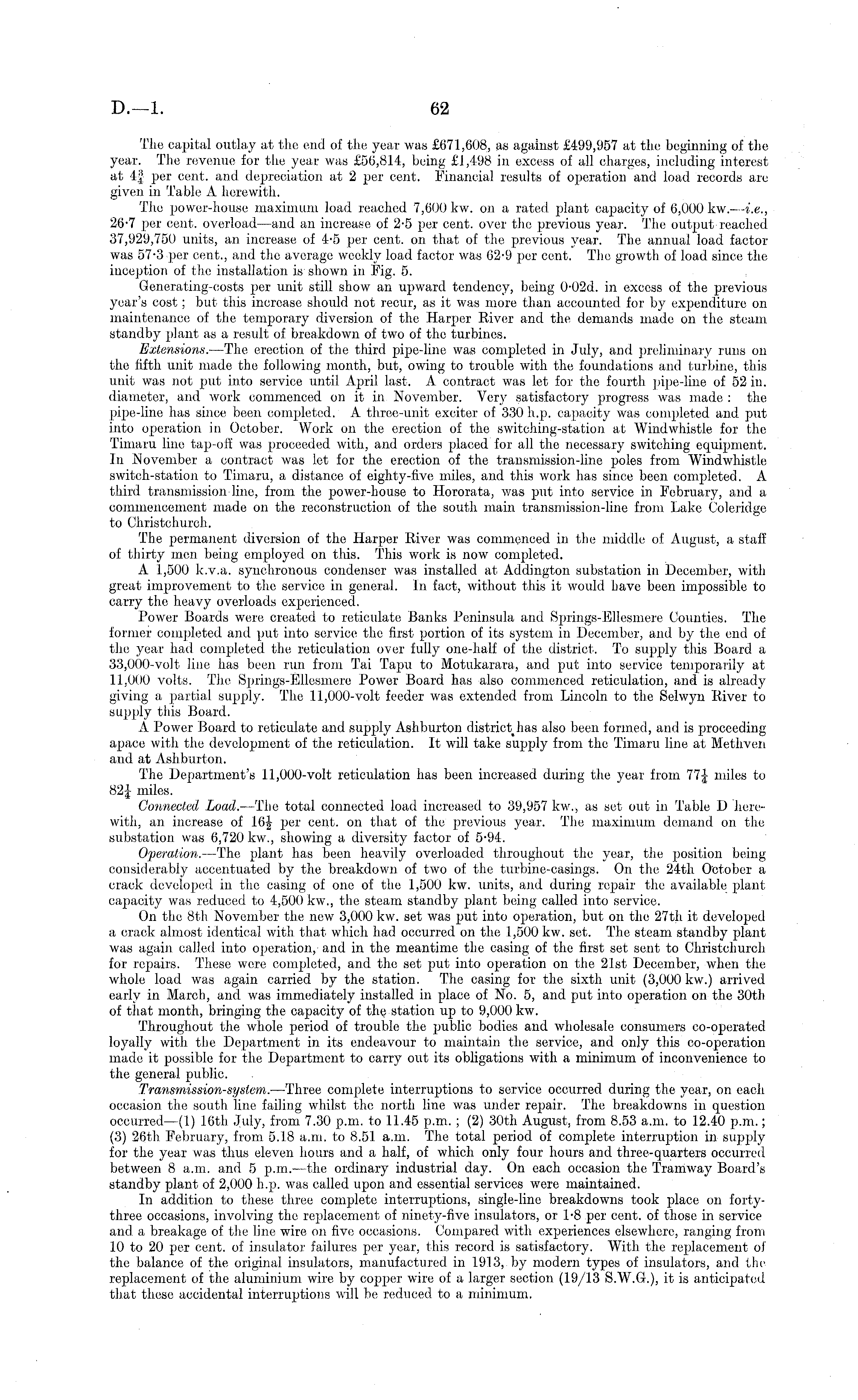 The capital outlay at the end of the year was £671,608, as against £499,957 at the beginning of the year. The revenue for the year was £56,814, being £1,498 in excess of all charges, including interest at 4| per cent, and depreciation at 2 per cent. Financial results of operation and load records are given in Table A herewith. The power-house maximum load reached 7,600 kw. on a rated plant capacity of 6,000 kw. — i.e., 26-7 per cent, overload —and an increase of 2-5 per cent, over the previous year. The output reached 37,929,750 units, an increase of 4-5 per cent, on that of the previous year. The annual load factor was 57-3 per cent., and the average weekly load factor was 62-9 per cent. The growth of load since the inception of the installation is shown in Fig. 5. Genera ting-costs per unit still show an upward tendency, being 0-02 d. in excess of the previous year's cost; but this increase should not recur, as it was more than accounted for by expenditure on maintenance of the temporary diversion of the Harper River and the demands made on the steam standby plant as a result of breakdown of two of the turbines. Extensions. —The erection of the third pipe-line was completed in July, and preliminary runs on the fifth unit made the following month, but, owing to trouble with the foundations and turbine, this unit was not put into service until April last. A contract was let for the fourth pipe-line of 52 in. diameter, and work commenced on it in November. Very satisfactory progress was made : the pipe-line has since been completed. A three-unit exciter of 330 h.p. capacity was completed and put into operation irr October. Work on the erection of the switching-station at Wind whistle for tho Timaru line tap-off was proceeded with, and orders placed for all the necessary switching equipment. In November a contract was let for the erection of the transmission-line poles from Windwhistle switch-station to Timaru, a distance of eighty-five miles, and this work has since been completed. A third transmission-line, from the power-house to Hororata, was put into service in February, and a commencement made on the reconstruction of the south main transmission-line from Lake Coleridge to Christchurch. The permanent diversion of the Harper River was commenced in the middle of August, a staff of thirty men being employed on this. This work is now completed. A 1,500 k.V.a. synchronous condenser was installed at Addington substation iir December, with great improvement to the service in general. In fact, without this it would have been impossible to carry the heavy overloads experienced. Power Boards were created to reticulate Banks Peninsula and Springs-Ellesmere Counties. The former completed and put into service the first portion of its system in December, and by the end of the year had completed the reticulation over fully one-half of the district. To supply this Board a 33,000-volt line has been run from Tai Tapu to Motukarara., and put into service temporarily at 11,000 volts. The Springs-Ellesmere Power Board has also commenced reticulation, and is already giving a partial supply. The 11,000-volt feeder was extended from Lincoln to the Selwyn River to supply this Board. A Power Board to reticulate and supply Ashburton district has also been formed, and is proceeding apace with the development of the reticulation. It will take supply from the Timaru line at Methveir and at Ashburton. The Department's 11,000-volt reticulation has been increased during the year from 77| miles to 821 miles. Connected Load. —The total connected load increased to 39,957 kw., as set out in Table D herewith, an increase of 16| per cent, on that of the previous year. The maximum demand on the substation was 6,720 kw., showing a diversity factor of 5-94. Operation. —The plant has been heavily overloaded throughout the year, the position being considerably accentuated by the breakdown of two of the turbine-casings. On the 24th October a crack developed in the casing of one of tire 1,500 kw. units, and during repair the available plant capacity was reduced to 4,500 kw., the steam standby plant being called into service. On the Bth November the new 3,000 kw. set was put into operation, but on the 27th it developed a crack almost identical with that which had occurred on the 1,500 kw. set. The steam standby plant was again called into operation, and in the meantime the casing of the first set sent to Christchurch for repairs. These were completed, and the set put into operation on the 21st December, when the whole load was again carried by the station. The casing for the sixth unit (3,000 kw.) arrived early in March, and was immediately installed in place of No. 5, and put into operation on the 30th of that month, bringing the capacity of the station up to 9,000 kw. Throughout tire whole period of trouble the public bodies and wholesale consumers co-operated loyally with the Department in its endeavour to maintain the service, and only this co-operation made it possible for the Department to carry out its obligations with a minimum of inconvenience to the general public. Transmission-system. —Three complete interruptions to service occurred during the year, orr each occasion the south line failing whilst the north line was under repair. The breakdowns iir question occurred—(l) 16th July, from 7.30 p.m. to 11.45 p.m. ; (2) 30th August, from 8.53 a.m. to 12.40 p.m.; (3) 26th February, from 5.18 a.m. to 8.51 a.m. The total period of complete interruption in supply for the year was thus eleven hours and a half, of which only four hours and three-quarters occurred between 8 a.m. and 5 p.m. —the ordinary industrial day. On each occasion the Tramway Board's standby plant of 2,000 h.p. was called upon and essential services were maintained. In addition to these three complete interruptions, single-lino breakdowns took place on fortythree occasions, involving the replacement of ninety-five insulators, or 1-8 per ce