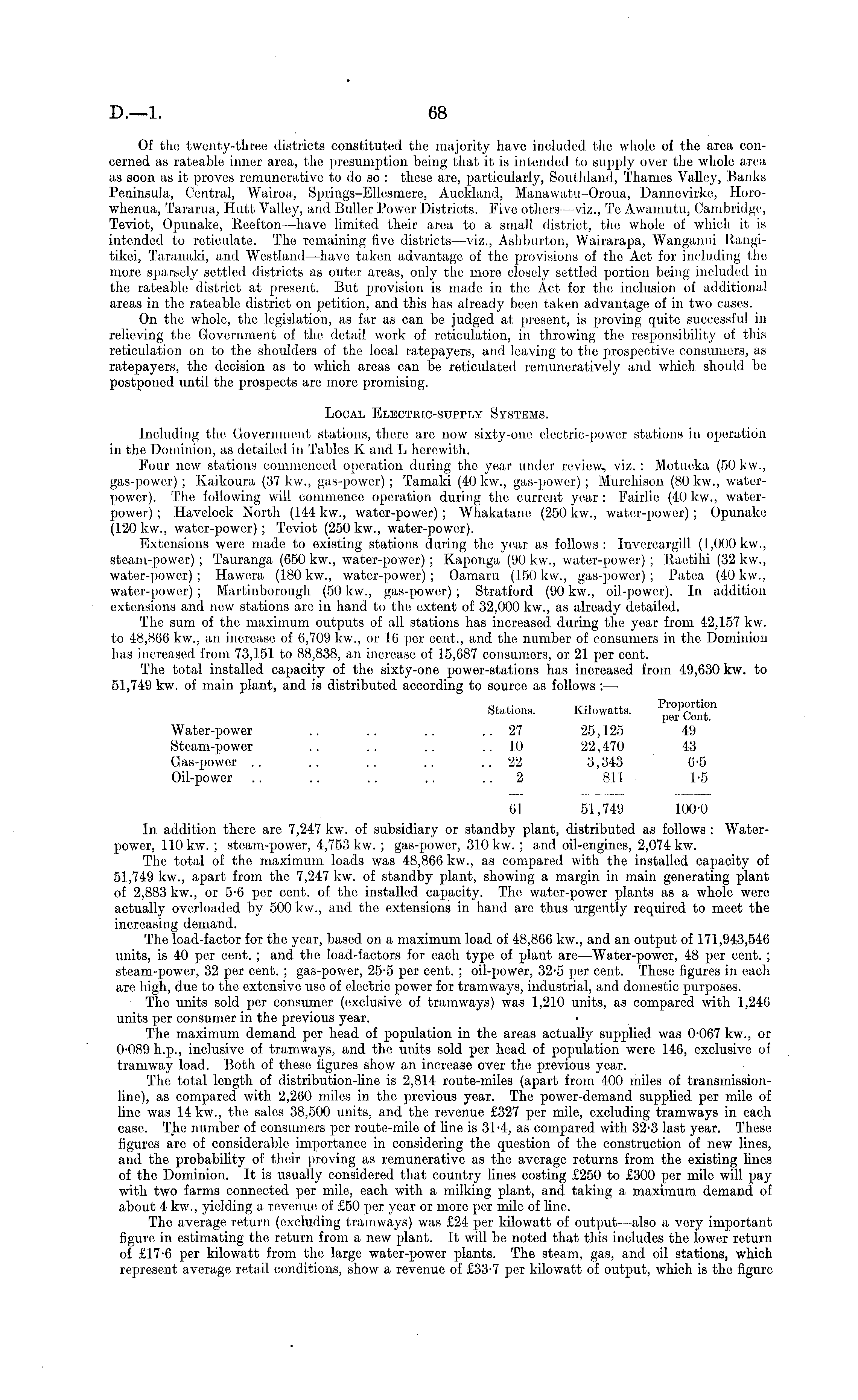 Of the twenty-three districts constituted the majority have included the whole of the area concerned as rateable inner area, the presumption being that it is intended to supply over the whole area as soon as it proves remunerative to do so : these are, particularly, Southland, Thames Valley, Banks Peninsula, Central, Wairoa, Springs-Ellesmere, Auckland, Manawatu-Oroua, Dannevirke, Horowhenua, Tararua, Hutt Valley, and Buller Power Districts. Five others —viz., Te Awamutu, Cambridge, Teviot, Opunake, Reefton —have limited their area to a small district, the whole of which it is intended to reticulate. The remaining five districts—viz., Ashburton, Wairarapa, Wanganui-Rangi-tikei, Taranaki, and Westland. —have taken advantage of the provisions of the Act for including the more sparsely settled districts as outer areas, only the more closely settled portion being included irr the rateable district at present. But provision is made in the Act for the inclusion of additional areas in the rateable district on petition, and this has already been taken advantage of in two cases. On the whole, the legislation, as far as can be judged at present, is proving quite successful in relieving the Government of the detail work of reticulation, in throwing the responsibility of this reticulation on to the shoulders of the local ratepayers, and leaving to the prospective consumers, as ratepayers, the decision as to which areas can be reticulated remuneratively and which should be postponed until the prospects are more promising. Local Electric-supply Systems. Including tire Government stations, there are now sixty-one electric-power stations irr operation in the Dominion, as detailed in Tables X and L herewith. Four new stations commenced operation during the year under review, viz. : M.ofueka (50 kw., gas-power); Kaikoura (37 kw., gas-power); Tamaki (40 kw., gas-power); Murchison (80 kw., waterpower). The following will commence operation during the current year : Fairlie (40 kw., waterpower) ; Havelock North (144 kw., water-power); Whakatane (250 kw., water-power); Opunake (120 kw., water-power) ; Teviot (250 kw., water-power). Extensions were made to existing stations during the year as follows: Invercargill. (1,000 kw., steam-power); Tauranga (650 kw., water-power); Kaponga (90 kw., water-power); Raetihi (32 kw., water-power); Hawora (180 kw., water-power); Oamaru (150 kw., gas-power) ; Patea (40 kw., water-power) ; Martinborough (50 kw., gas-power) ; Stratford (90 kw., oil-power). In addition extensions and new stations are in hand to the extent of 32,000 kw., as already detailed. The. sum of the maximum outputs of all stations has increased during the year from 42,157 kw. to 48,866 kw., an increase of 6,709 kw., or 16 per cent., and the number of consumers in tire Dominion has increased from 73,151 to 88,838, an increase of 15,687 consumers, or 21 per cent. The total installed capacity of the sixty-one power-stations has increased from 49,630 kw. to 51,749 kw. of main plant, and is distributed according to source as follows : — Stations. Kilowatts. ''~ , nor Cent. Water-power .. .. .. ..27 25,125 49 Steam-power .. .. .. ..10 22,470 43 Gas-power .. .. .. .. ..22 3,343 6-5 Oil-power .. .. .. .. ..2 811 1-5 61 51,749 100-0 In addition there are 7,247 kw. of subsidiary or standby plant, distributed as follows : Waterpower, 110 kw. ; steam-power, 4,753 kw. ; gas-power, 310 kw. ; and oil-engines, 2,074 kw. The total of tho maximum loads was 48,866 kw., as compared with the installed capacity of 51,749 kw., apart from the 7,247 kw. of standby plant, showirrg a margin in main generating plant of 2,883 kw., or 5-6 per cent, of the installed capacity. The water-power plants as a whole were actually overloaded by 500 kw., and the extensions in hand are thus urgently required to meet the increasing demand. The load-factor for the year, based on a maximum load of 48,866 kw., and an output of 171,943,546 units, is 4-0 per cent. ; and the load-factors for each type of plant are—Water-power, 48 per cent. ; steam-power, 32 per cent. ; gas-power, 25-5 per cent. ; oil-power, 32-5 per cent. These figures in each are high, due to the extensive use of electric power for tramways, industrial, and domestic purposes. The units sold per consumer (exclusive of tramways) was 1,210 units, as compared with 1,246 units per consumer in the previous year. The maximum demand per head of population in the areas actually supplied was 0-067 kw., or 0-089 h.p., inclusive of tramways, and the units sold per head of population were 146, exclusive of tramway load. Both of these figures show an increase over the previous year. The total length of distribution-line is 2,814 route-miles (apart from 400 miles of transmissionline), as compared with 2,260 miles in the previous year. The power-demand supplied per mile of line was 14 kw., the sales 38,500 units, and the revenue £327 per mile, excluding tramways in each case. The number of consumers per route-mile of line is 31-4, as compared with 32-3 last year. These figures are of considerable importance in considering the question of the construction of new lines, and the probability of their proving as remunerative as the average returns from the existing lines of the Dominion. It is usually considered that country lines costing £250 to £300 per mile will pay with two farms connected per mile, each with a milking plant, and taking a maximum demand of about 4 kw., yielding a revenue of £50 per year or more per mile of line. The average return (excluding tramways) was £24 per kilowatt of output also a very important figure in estimating tho return from a new plant. It will be noted that this includes the lower return of £17-6 per kilowatt from the large water-power plants. The steam, gas, and oil stations, which represent average retail conditions, show a revenue of £33-7 per kilowatt of output, which is the figure