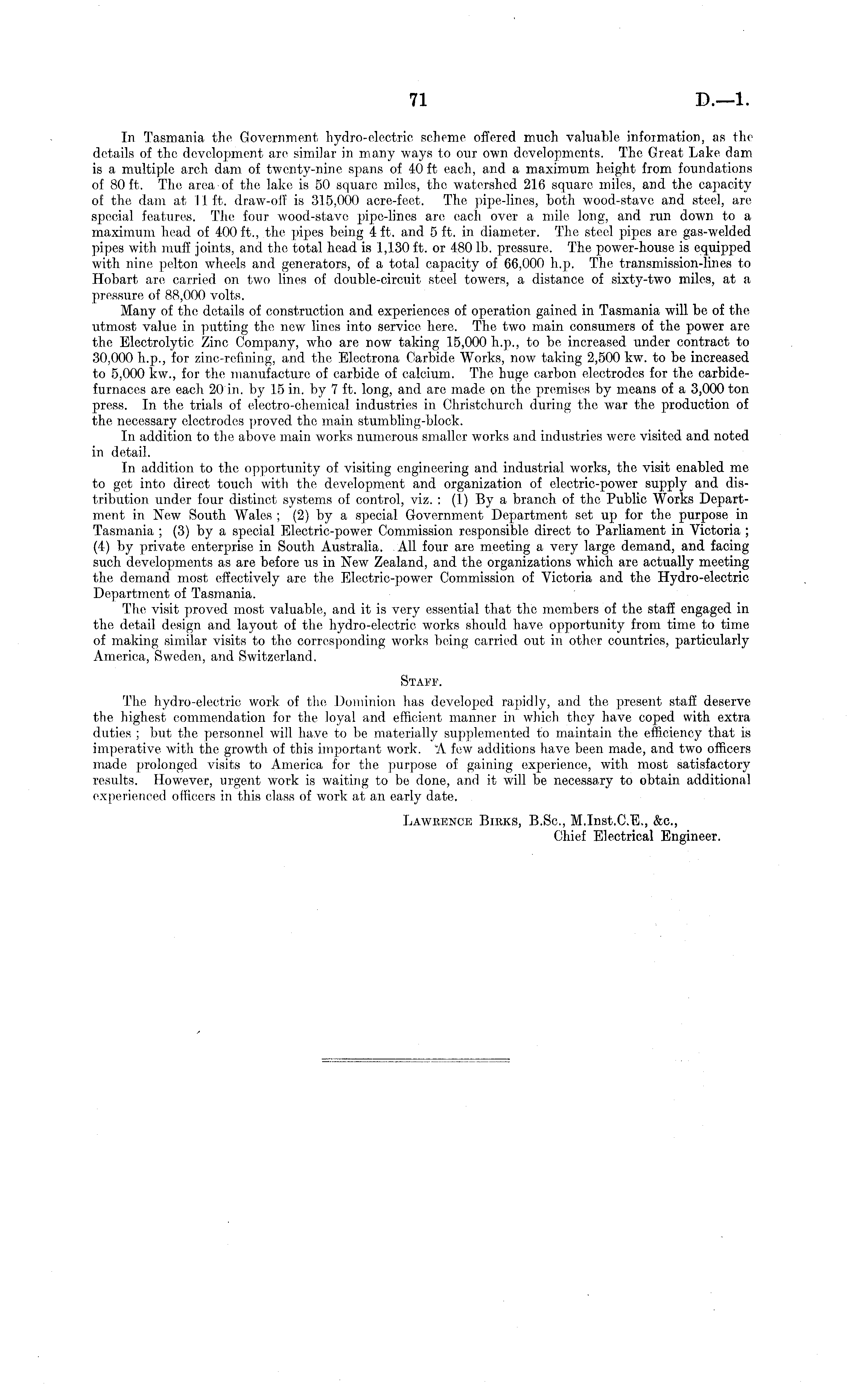 In Tasmania the Government hydro-electric scheme offered much valuable information, as the details of the development are similar in many ways to our own developments. The, Great Lake dam is a multiple arch dam. of twenty-nine spans of 40 ft each, and a maximum height from foundations of 80 ft. The area of the lake is 50 square miles, tho watershed 216 square, miles, and the capacity of the dam at 11 ft. draw-off is 315,000 acre-feet. The pipe-lines, both wood-stave and steel, are special features. The four wood-stave pipe-lines are each over a mile long, and run down to a maximum head of 400 ft., the pipes being 4 ft. and 5 ft. in diameter. The steel pipes are, gas-welded pipes with muff joints, and the total head is 1,130 ft. or 480 lb. pressure. The power-house is equipped with nine pelton wheels and generators, of a total capacity of 66,000 h.p. The transmission-lines to Hobart are carried on two lines of double-circuit steel towers, a distance of sixty-two miles, at a pressure of 88,000 volts. Many of the details of construction and experiences of operation gained in Tasmania will be of the utmost value in putting the new lines into service here. The two main consumers of the power are the Electrolytic Zinc Company, who are now taking 15,000 h.p., to be increased under contract to 30,000 h.p., for zinc-refining, and the, Elcctrona Carbide Works, now taking 2,500 kw. to be increased to 5,000 kw., for the manufacture of carbide of calcium. The huge carbon electrodes for the carbidefurnaces are each 20 in. by 15 in. by 7 ft. long, and. are made, on the premises by means of a 3,000 ton press. In the trials of electro-chemical industries in Christchurch during the war the production of the necessary electrodes proved the main stumbling-block. In addition to the above main works numerous smaller works and industries wore visited and noted in detail. In addition to the opportunity of visiting engineering and industrial works, the visit enabled me to get into direct touch with the development and organization of electric-power supply and distribution under four distinct systems of control, viz. : (1) By a branch of the Public Works Department in New South Wales ; (2) by a special Government Department set up for the purpose in Tasmania ; (3) by a special Electric-power Commission responsible direct to Parliament in Victoria ; (4) by private enterprise in South Australia. AH four are meeting a very large demand, and facing such developments as are before us in New Zealand, and the organizations which are actually meeting the demand most effectively are the Electric-power Commission of Victoria and the Hydro-electric Department of Tasmania. The visit proved most valuable, and it is very essential that the members of the staff engaged in the detail design and layout of the hydro-electric works should have opportunity from time to time of making similar visits to tho corresponding works being carried out in other countries, particularly America, Sweden, and Switzerland. Staff. The hydro-electric work, of the Dominion has developed rapidly, and the present staff deserve the highest commendation for the loyal and efficient manner in which they have coped with extra duties ; but the personnel will have to be materially supplemented to maintain the efficiency that is imperative with the growth of this important work. "A few additions have been made, and two officers made prolonged visits to America for the purpose of gaining experience, with most satisfactory results. However, urgent work is waiting to be done, and it will be necessary to obtain additional experienced officers in this class of work at an early date. Lawrence Birks, B.Sc, M.lnst.C.E., &c, Chief Electrical Engineer.