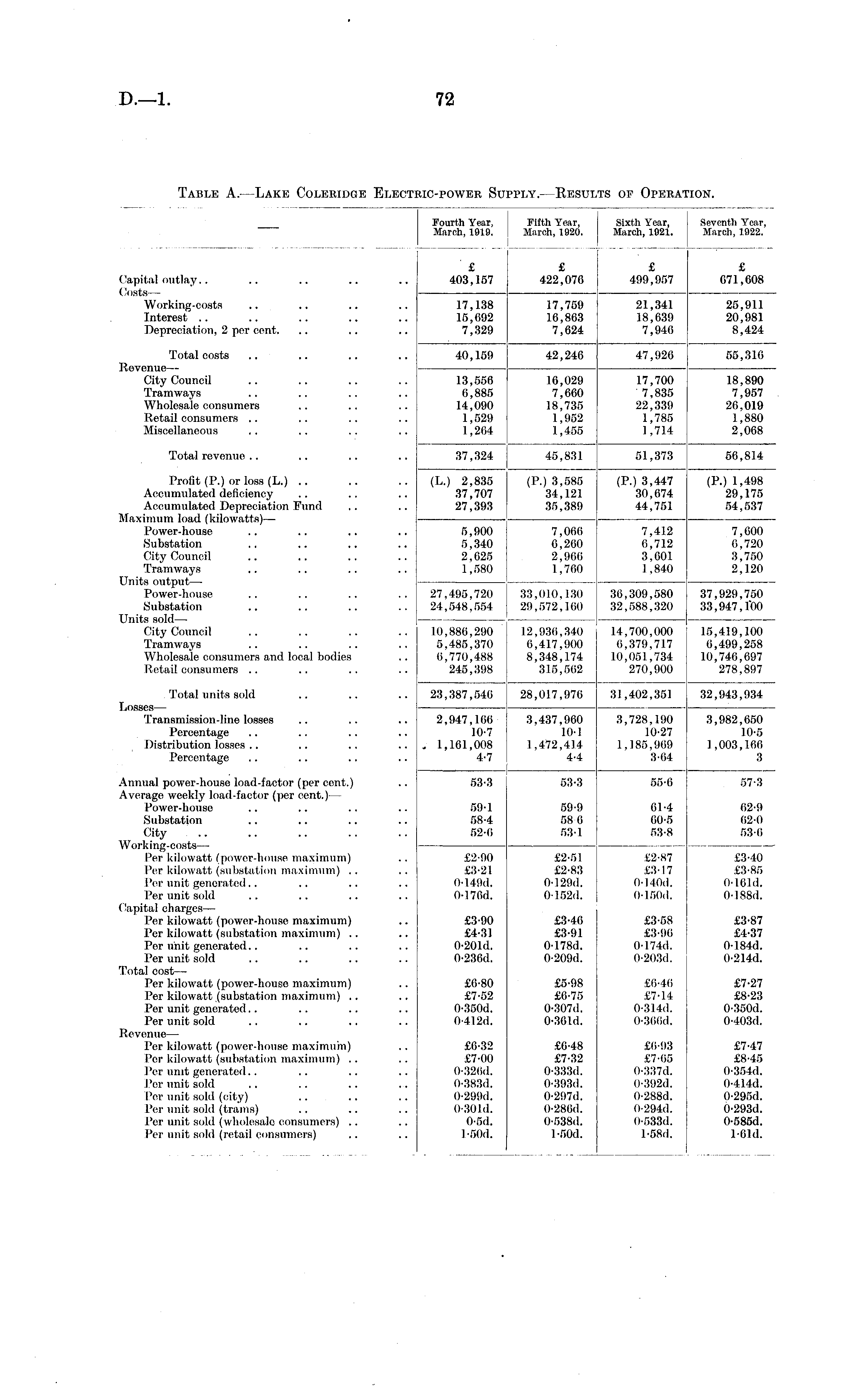 Fourth Year, March, 191.9. Fifth Year, March, 1920. Sixth Year, Seventh Year, March, 1021. March, 1.922. I Capital outlay Costs— Working-costs Interest Depreciation, 2 per cent. £ 403,157 £ 422,076 £ £ 499,957 671,608 17,138 15,692 7,329 17,759 16,863 7,624 21,341 18,639 7,946 25,911 20,981 8,424 Total costs 40,159 42,246 47,926 55,310 Revenue— City Council Tramways Wholesale consumers Retail consumers Miscellaneous 13,556 6,885 14,090 1,529 1,264 16,029 7,660 18,735 1,952 1,455 17,700 7,835 22,339 1,785 1,714 18,890 7,957 26,019 1,880 2,068 Total revenue 37,324 45,831 51,373 56,814 Profit (P.) or loss (L.) Accumulated deficiency Accumulated Depreciation Fund Maximum load (kilowatts) — Power-house Substation City Council Tramways Units output — Power-house Substation Units sold— City Council Tramways Wholesale consumers and local bodies Retail consumers (I..) 2,835 37,707 27,393 5,900 5,340 2,625 1,580 (P.) 3,585 34,121 35,389 7,066 6,260 2,966 1,760 (P.) 3,447 30,674 44,751 7,412 6,712 3,601 1,840 (P.) 1,498 29,175 54,537 7,600 6,720 3,750 2,120 27,495,720 24,548,554 33,010,130 29,572,160 36,309,580 32,588,320 37,929,750 33,947,100 10,886,290 5,485,370 6,770,488 245,398 12,936,340 6,417,900 8,348,174 315,562 14,700,000 6,379,717 10,051,734 270,900 15,419,100 6,499,258 10,746,697 278,897 Total units sold 23,387,546 28,017,976 31,402,351 32,943,934 Losses — Transmission-line losses Percentage Distribution losses Percentage 2,947,166 10-7 1,161,008 4-7 3,437,960 10-1 1,472,414 4-4 3,728,190 10-27 1,185,969 3-64 3,982,650 10-5 1,003,166 3 Annual power-house load-factor (per cent.) Average weekly load-factor (per cent.) — Power-house Substation City Working-costs— Per kilowatt (power-house maximum) Per kilowatt (substation maximum) .. Per unit generated.. Per unit sold Capital charges— Per kilowatt (power-house maximum) Per kilowatt (substation maximum) .. Per unit generated Per unit sold Iota] cost— Per kilowatt (power-house maximum) Per kilowatt (substation maximum) .. Per unit generated Per unit sold £2-90 £3-21 0-149(1. 0-176(1. 53-3 59-1 58-4 52-6 £2-51 £2-83 0-129(1. 0-152(1. 53-3 59-9 58 6 53-1 £2-87 £3-17 0-IIOd. 0-150(1. 55-0 61-4 60-5 53-8 57-3 62-9 62-0 530 £3-40 £3-85 0-161d. 0-188d. £3-90 £4-31 0-20L1. 0-236(1. £3-46 £3-91 0-178d. 0-209(1. £3-58 £3-96 0-174d. 0-203d. £3-87 £4-37 0-184d. 0-214d. £6-80 £7-52 0-350(1. 0-412(1. £5-98 £6-75 0-307(1. 0-361d. £6-46 £7-14 0-314(1. 0-366(1. £7-27 £8-23 0-350d. 0-403d. Revenue — Per kilowatt (power-house maximum) Per kilowatt (substation maximum) .. Per unit generated Per unit sold Per unit sold (city) Per unit sold (trains) Per unit sold (wholesale consumers) .. Per unit sold (retail consumers) £6-32 £7-00 0-326(1. 0-383(1. 0-299(1. 0-301(1. 0-5d. 1 -50d. £6-48 £7-32 0-333(1. 0-393(1. 0-297(1. 0-286(1. 0-538(1. 1-50(1. £6-93 £7-65 0-337d. 0-392(1. 0-288d. 0-294d. 0-533(1. 1-58(1. £7-47 £8-45 0-354d. 0-414d. 0-295d. 0-293d. 0-585d. 1 GUI.
