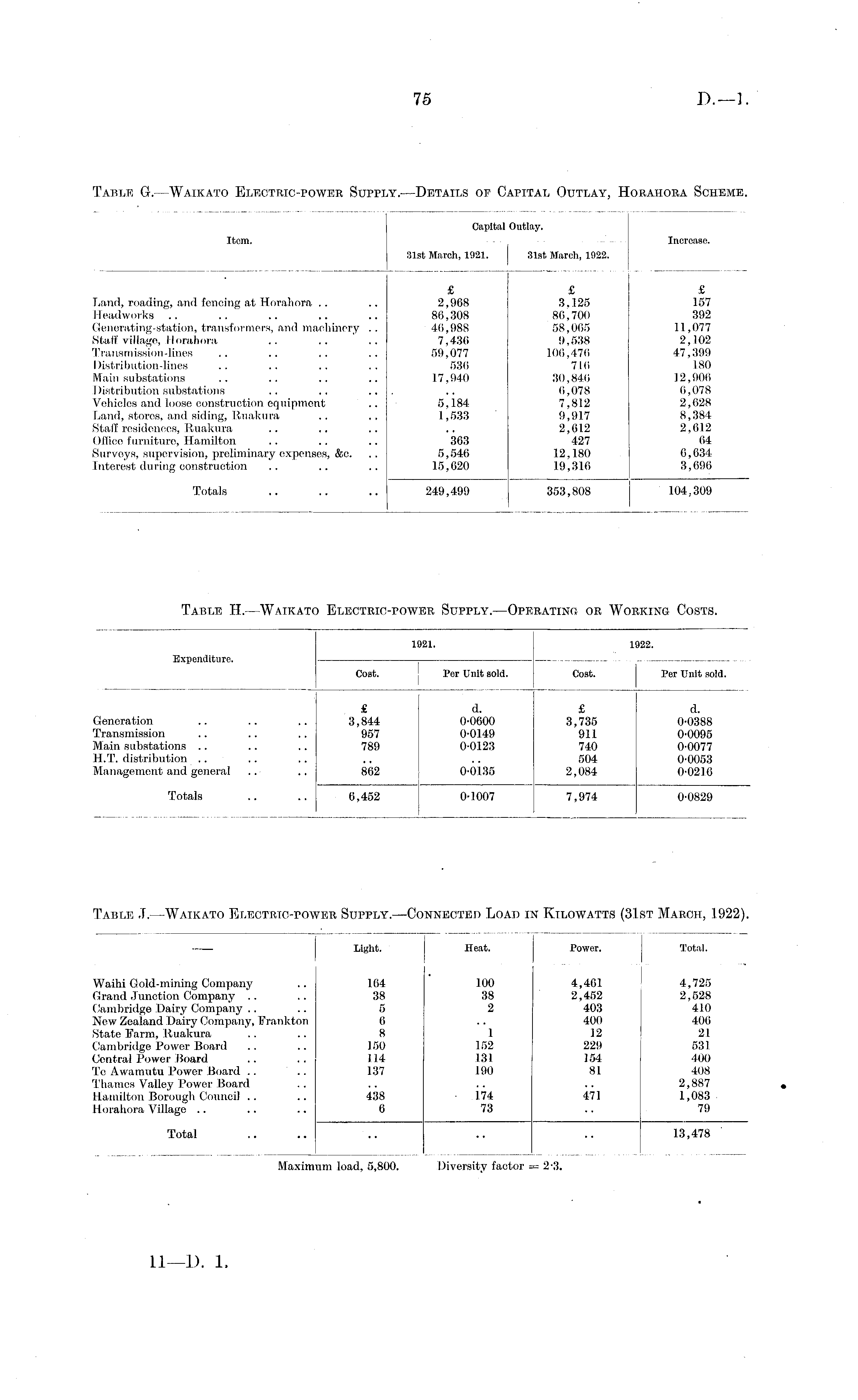Item. Capital Outlay. 31st March, 1921. 31st March, 1922. Increase. Land, reading, and fencing at Horahora Headworks Generating-station, transformers, and machinery .. Staff village, Horahora Transmission-lines Distribution-lines Main substations Distribution substations Vehicles and loose construction equipment Land, stores, and siding, Ruakura Staff residences, Ruakura Ollico furniture, Hamilton Surveys, supervision, preliminary expenses, &c. Interest during construction £ 2,968 86,308 46,988 7,436 59,077 536 17,940 £ 3,125 86,700 58,065 9,538 100,476 716 30,846 6,078 7,812 9,917 2,612 427 12,180 19,316 £ 157 392 11,077 2,102 47,399 180 12,906 6,078 2,628 8,384 2,612 64 6,634 3,696 5,184 1,533 363 5,546 15,620 Totals 249,499 353,808 104,309