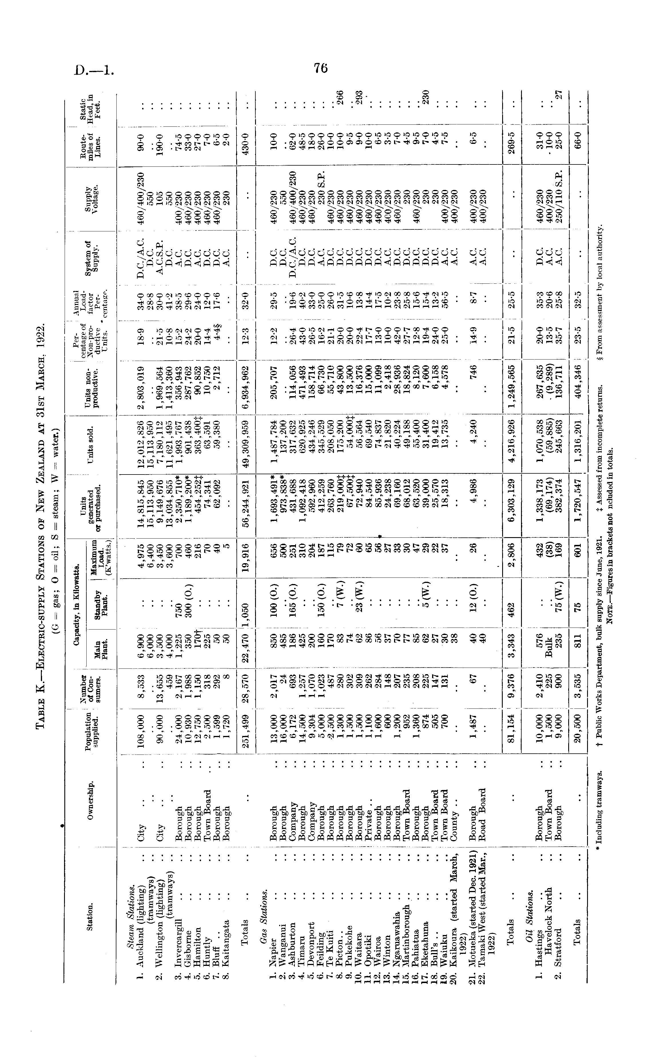 Table K.—Electric-supply Stations of New Zealand at 31st March, 1922.