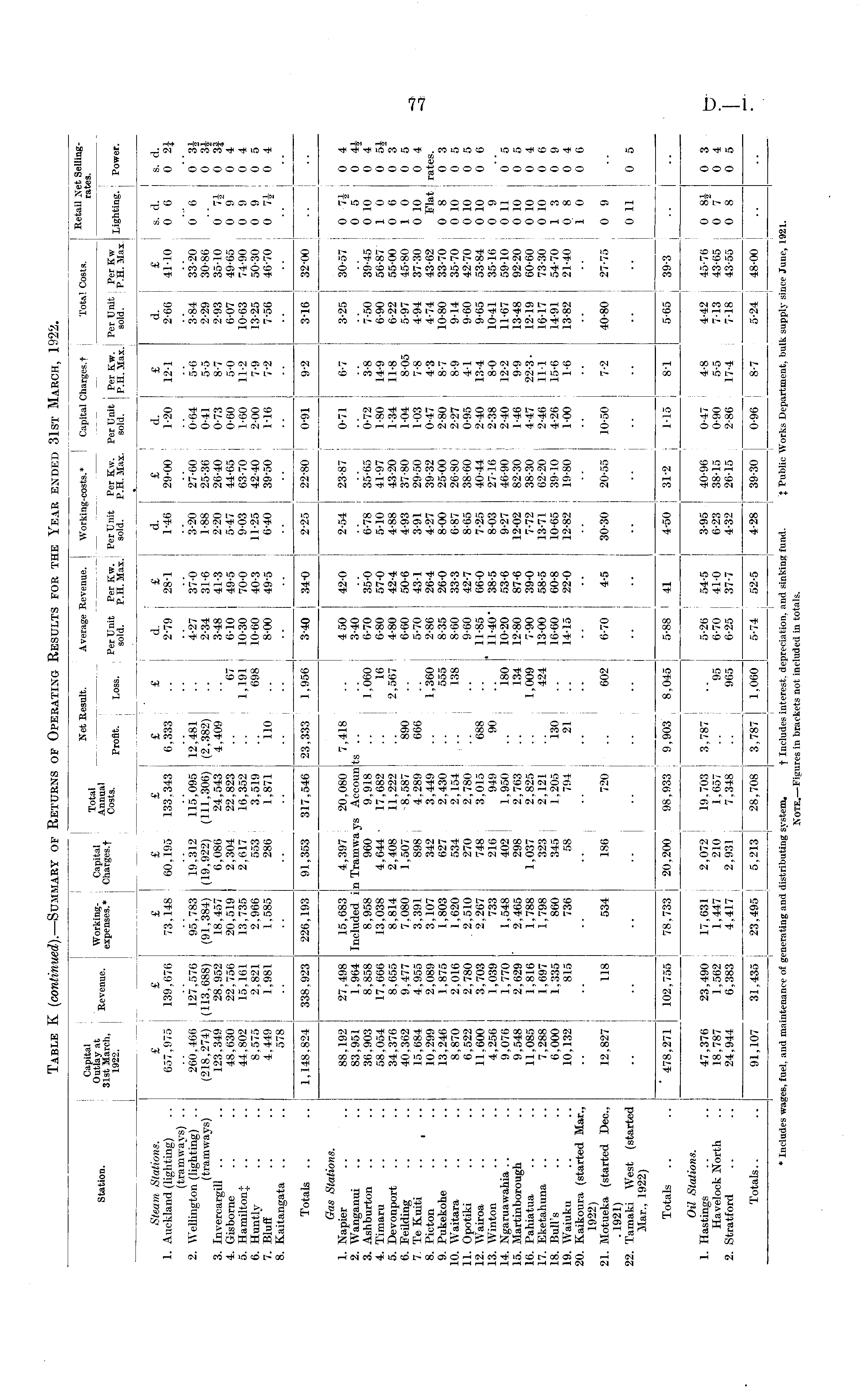 Table K (continued). —Summary of Returns of Operating Results for the Year ended 31st March, 1922.