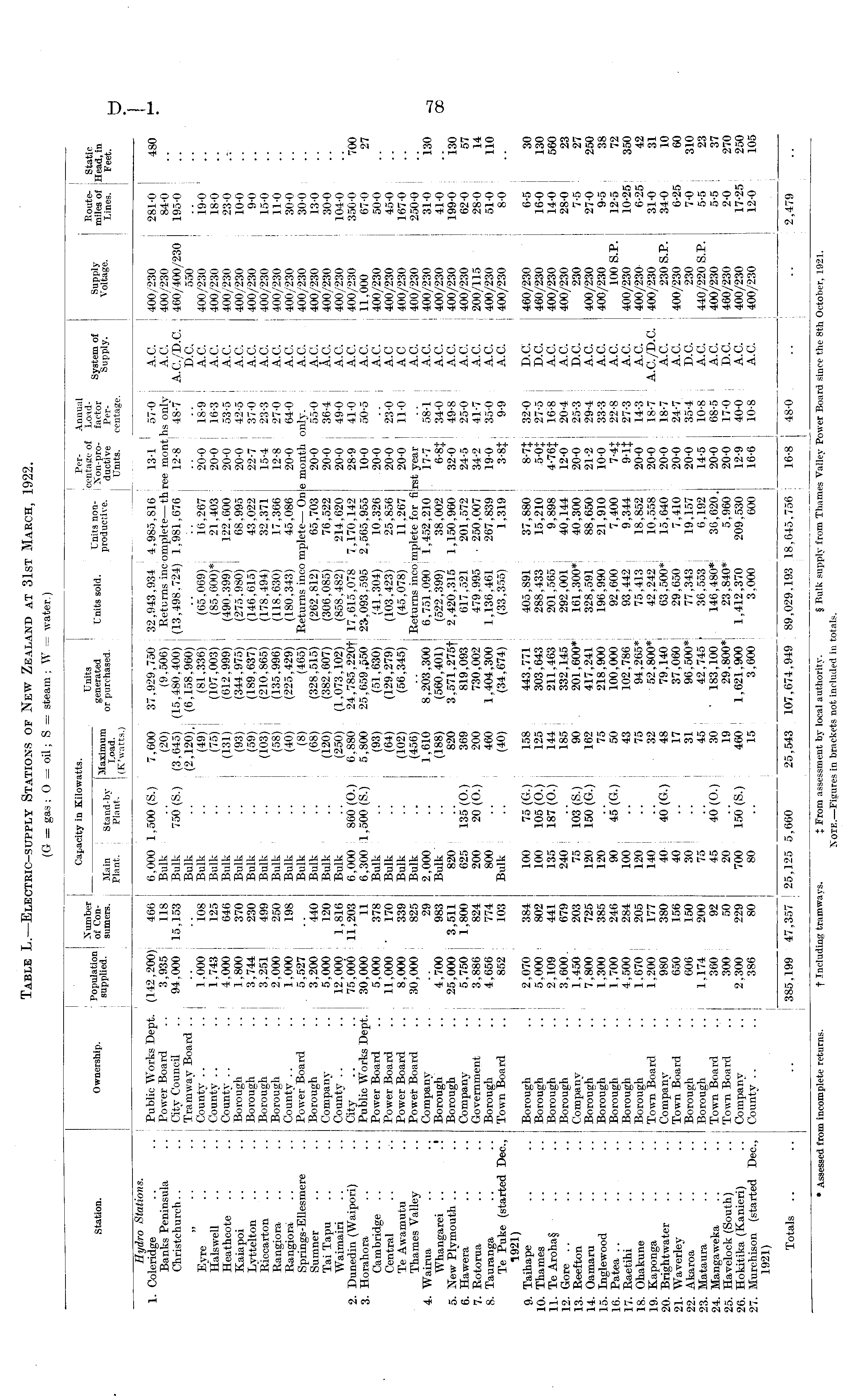 Table L.—Electric-supply Stations of New Zealand at 31st March, 1922.