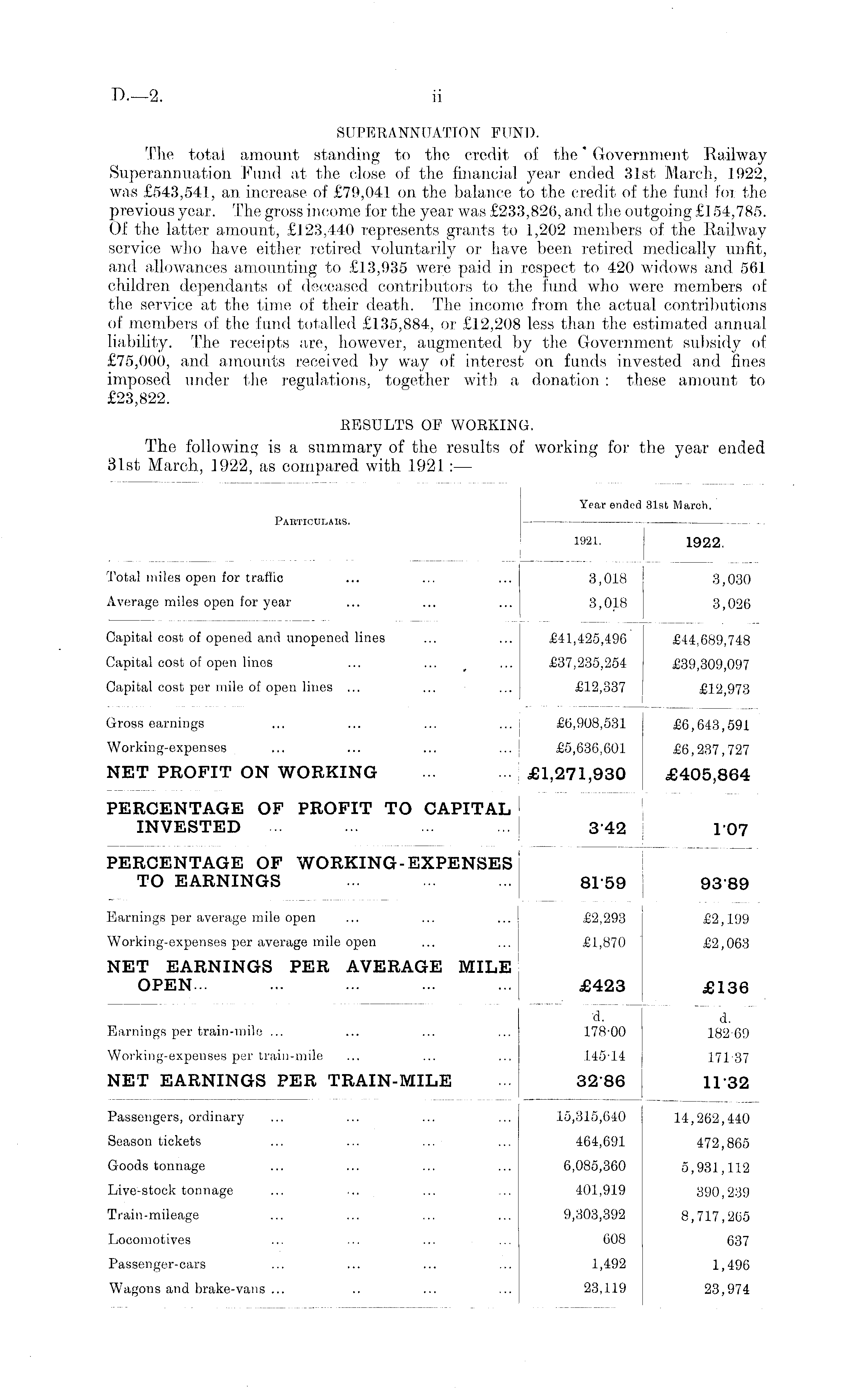 Year ended 31st March. Particulars. 1921, 1922. Total miles open for traffic ... ... ... 3,018 3,030 Average miles open for year ... ... ... 3,018 3,026 Capital cost of opened and unopened lines ... ... £41,425,496 £44,689,748 Capital cost of open lines ... ... ( ... £37,235,254 £39,309,097 Capital cost per mile of open lines ... ... ... £12,337 £12,973 Gross earnings ... ... ... ... £6,908,531 £6,643,591 Working-expenses ... ... ... ... £5,636,601 £6,237,727 NET PROFIT ON WORKING ... ... £1,271,930 £405,864 PERCENTAGE OP PROFIT TO CAPITAL INVESTED ... ... ... ... j 342 107 PERCENTAGE OF WORKING-EXPENSES TO EARNINGS ... ... 8159 9389 i Earnings per average mile open ... ... ... £2,293 £2,199 Working-expenses per average mile open ... ... £1,870 £2,063 NET EARNINGS PER AVERAGE MILE OPEN.. ... ... ... ... £423 £136 •a. a. Earnings per train-mile ... ... ... ... 178-00 18269 Working-expenses per traiu-mile ... ... ... 145-14 17137 NET EARNINGS PER TRAIN-MILE ... 3286 1132 Passengers, ordinary ... ... ... ... 15,315,640 14,262,440 Season tickets ... ... ... ... 464,691 472,865 Goods tonnage ... ... ... ... 6,085,360 5,931,112 Live-stock tonnage ... ... ... ... 401,919 390,239 Train-mileage ... ... ... ... 9,303,392 8,717,265 Locomotives ... ... ... ... 608 637 Passenger-cars ... ... ... ... 1,492 1,496 Wagons and brake-vans ... .. ... ... 23,119 23,974