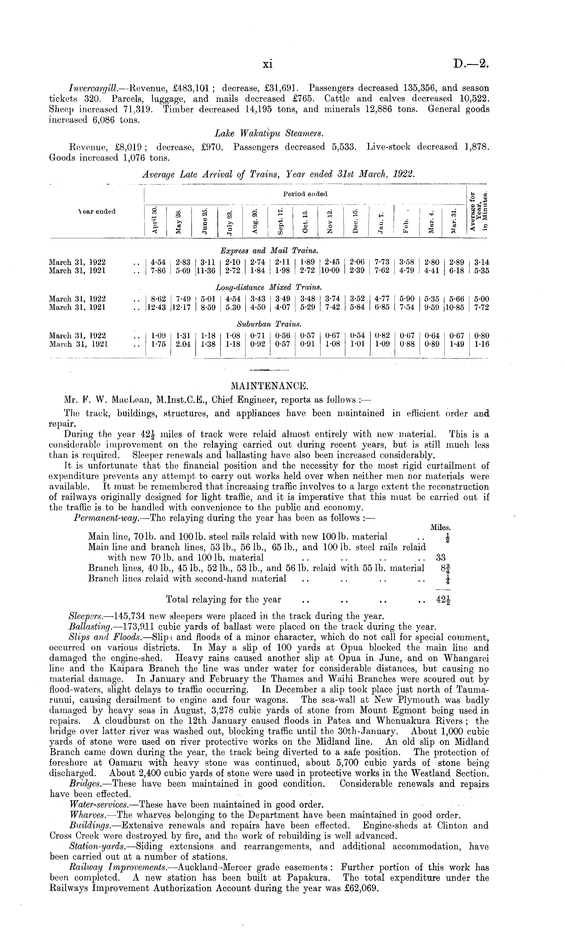 Invercargill. —Revenue, £483,101; decrease, £31,69.1. Passengers decreased 135,356, and season tickets 320. Parcels, luggage, and mails decreased £765. Cattle and calves decreased 10,522. Sheep increased 71,319. Timber decreased 14,195 tons, and minerals 12,886 tons. General goods increased 6,086 tons. Lake Wakatipu Steamers. Revenue, £8,019 ; decrease, £970. Passengers decreased 5,533. Live-stock decreased 1,878. Goods increased 1,076 tons.
