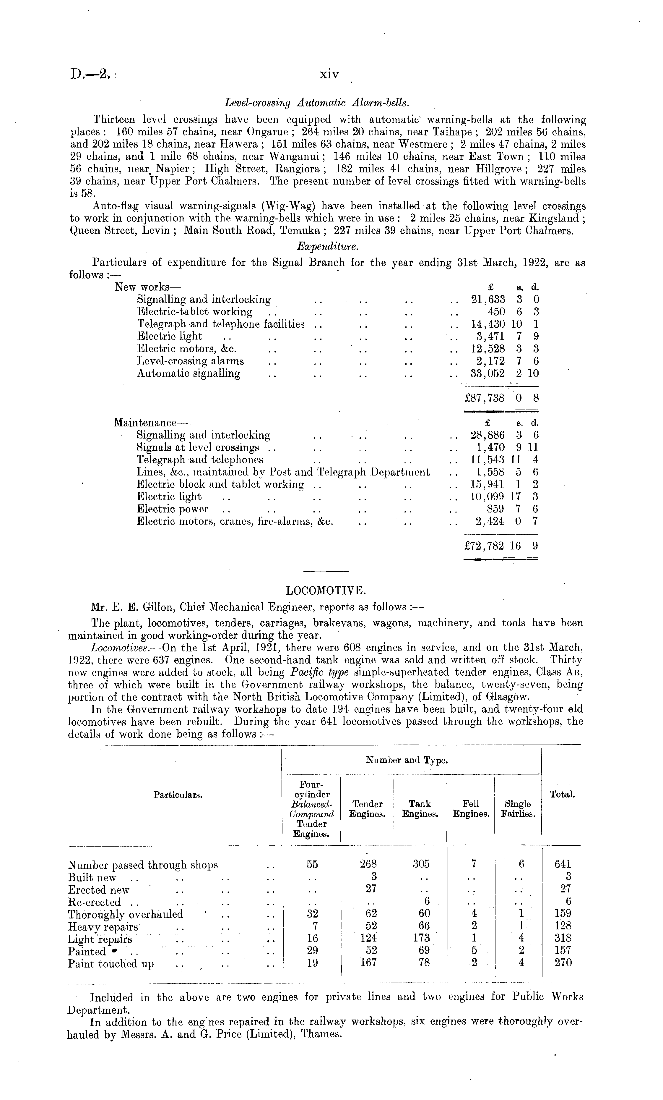 Level-crossing Automatic Alarm-bells. Thirteen level crossings have been equipped with automatic' warning-bells at the following places : 160 miles 57 chains, near Ongarue ; 264 miles 20 chains, near Taihape,; 202 miles 56 chains, and 202 miles 18 chains, near Hawera ; 151 miles 63 chains, near Westmero ; 2 miles 47 chains, 2 miles 29 chains, and 1 mile 68 chains, near Wanganui; 146 miles 10 chains, near East Town ; 1.10 miles 56 chains, near Napier ; High Street, Rangiora ; 182 miles 41 chains, near Hillgrove ; 227 miles 39 chains, near Upper Port Chalmers. The present number of level crossings fitted with warning-bells is 58. Auto-flag visual warning-signals (Wig-Wag) have been installed at the following level crossings to work in conjunction with the warning-bells which were in use : 2 miles 25 chains, near Kingsland ; Queen Street, Levin ; Main South Road, Temuka ; 227 miles 39 chains, near Upper Port Chalmers. Expenditure. Particulars of expenditure for the Signal Branch for the year ending 31st March, 1922, are as follows :— New works — £ s. d. Signalling and interlocking .. .. .. .. 21,633 3 0 Electric-tablet working .. .. .. .. .. 450 6 3 Telegraph and telephone facilities .. .. .. .. 14,430 10 1 Electric light .. .. .. .. .. .. 3,471 7 9 Electric motors, &c. .. .. .. .. .. 12,528 3 3 Level-crossing alarms .. .. .. .. .. 2,172 7 6 Automatic signalling .. .. .. .. .. 33,052 2 10 £87,738 0 8 Maintenance — £ s. d. Signalling and interlocking .. - .. .. .. 28,886 3 6 Signals at level crossings .. .. . . . . . . 1,470 911 Telegraph and telephones .. .. .. .. 11,543 11 4 Lines, &c., maintained by Post and Telegraph Department .. 1,558 5 6 Electric block and tablet working .. .. .. .. 15,941 1 2 Electric light .. .. .. .. .. .. 10,099 17 3 Electric power . . . . .. .. . . .. 859 7 6 Electric motors, cranes, fire-alarms, &c. .. .. .. 2,424 0 7 £72,782 16 9 LOCOMOTIVE. Mr. E. E. Gillon, Chief Mechanical Engineer, reports as follows : — The plant, locomotives, tenders, carriages, brakevans, wagons, machinery, and tools have been maintained in good working-order during the year. Locomotives. —On the Ist April, 1921, there were 608 engines in service, and on the 31st March, 1922, there were 637 engines. One second-hand tank engine was sold and written off stock. Thirty new engines were added to stock, all being Pacific type simple-superheated tender engines, Class An, three of which were built in the Government railway workshops, the balance, twenty-seven, being portion of the contract with the North British Locomotive Company (Limited), of Glasgow. In the Government railway workshops to date 194 engines have been built, and twenty-four old locomotives have been rebuilt. During the year 641 locomotives passed through the workshops, the details of work done being as follows : —