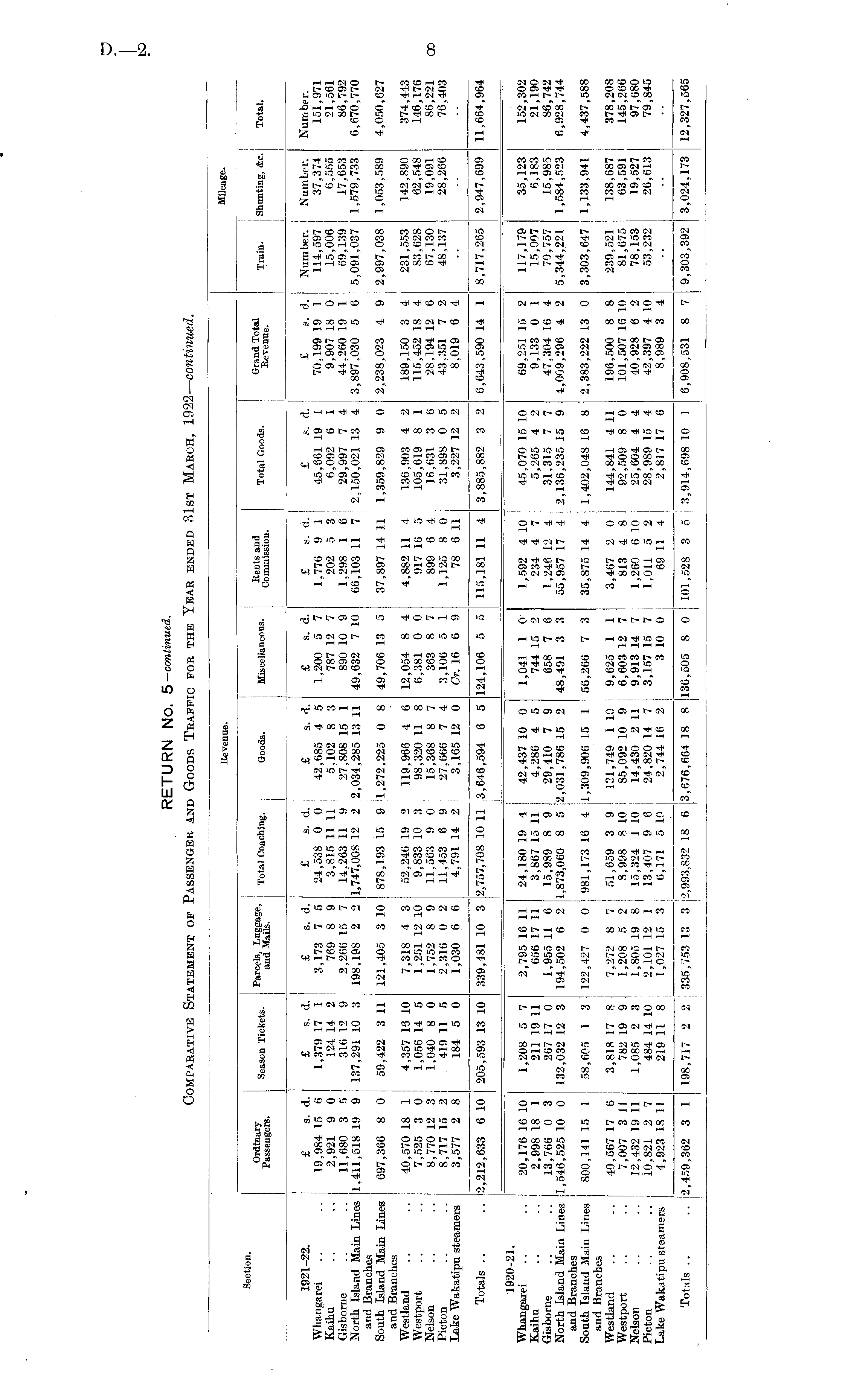Revenue. Mileage. Section. Ordinary Passengers. Season Tickets. Parcels, Luggage, and Mails. Total Coaching. Goods. Miscellaneous. Rents and Commission. Total Goods. Grand Total Revenue. Train. Shunting, &c. Total. I 1921-22. Whangarei Kaihu Gisborne North Island Main Lines and Branches South Island Main Lines and Branches Westland Westport Nelson Pieton Lake Wakatipu steamers £ s. d. £ s. d. 19,984 15 6 1,379 17 1 2,921 9 0 124 14 2 11,680 3 5 316 12 9 1,411,518 19 9 ' 137,291 10 3 £ s. d. 3.173 7 5 769 8 9 2,266 15 7 198,198 2 2 £ s. d. £ s. d. 24,538 0 0 42,685 4 5 3,815 11 11 5.102 8 3 14,263 11 9 27,808 15 1 1,747,008 12 2 2,034,285 13 11 £ s. d. 1,200 5 7 787 12 7 890 10 9 49,632 7 10 £ s. cl. 1,776 9 1 202 5 3 1,298 1 6 66,103 11 7 £ s. d. 45,661 19 1 6,092 6 1 29,997 7 4 2,150,021 13 4 £ b. a. 70,199 19 1 9,907 18 0 44,260 19 1 3,897,030 5 6 Number. 114,597 15.006 69,139 5,091,037 Number. 37,374 6.555 17,653 1,579,733 Num ber. 151,971 21,561 86,792 6,670,770 697,366 8 0 j 59,422 3 11 121,405 3 10 878,193 i5 9 1,272,225 0 8 49,706 13 5 37,897 14 11 1,359,829 9 0 2,238,023 4 9 2,997,038 1,053,589 4,050,627 40,570 18 1 I 4,357 16 10 7,525 3 0 ! 1,056 14 5 8,770 12 3 1,040 8 0 8,717 15 2 419 11 5 3,577 2 8 I 184 5 0 7,318 4 3 1,251 12 10 1,752 8 9 2,316 0 2 1.030 6 6 52,246 19 2 119,966 4 6 9,833 10 3 98,320 11 8 11,563 9 0 15,368 8 7 11,453 6 9 27,666 7 4 4,791 14 2 3,165 12 0 12,054 8 4 6,381 0 0 363 8 7 3,106 5 1 Cr. 16 6 9 4,882 11 4 917 16 5 899 6 4 1,125 8 0 78 6 11 136,903 4 2 105,619 8 1 16,631 3 6 31,898 0 5 3,227 12 2 189,150 3 4 115,452 18 4 28,194 12 6 43,351 7 2 8,019 6 4 231,553 83,628 67,130 48.137 142,890 62.548 19,091 28,266 374,443 146,176 86,221 76,403 Totals .. .. ! 2,212,633 6 10 205,593 13 10 339,481 10 3 2,757,708 10 11 3,646,594 6 5 124,106 5 5 115,181 11 4 3,885,882 3 2 6,643,590 14 1 8,717,265 2,947,699 11,664,96-1920-21. Whangarei Kaihu Gisborne North Island Main Lines and Branches South Island Main Lines and Branches Westland Westport Nelson Pieton Lake Wakatipu steamers Totuls .. .. : 20,176 16 10 2,998 18 1 13,766 0 3 1,546,525 10 0 800,141 15 1 40,567 17 6 7,007 3 11 12,432 19 11 10,821 2 7 4,923 18 11 1,208 5 7 211 19 11 267 17 0 132,032 12 3 58,605 1 3 3,818 17 8 782 19 9 1,085 2 3 484 14 10 219 11 8 2,795 16 11 24,180 19 4 42,437 10 0 1,041 1 0 656 17 11 3,867 15 11 4,286 4 5 744 15 2 1,955 11 6 15,989 8 9 29,410 7 9 658 7 6 194,502 6 2 1,873,060 8 5 2,031,786 15 2 48,491 3 3 122,427 0 0 981,173 16 4 1,309,906 15 1 56,266 7 3 7,272 8 7 51,659 3 9 131,749 1 10 9,625 1 1 1,208 5 2 8,998 8 10 I 85,092 10 9 6,603 12 7 1,805 19 8 15,324 1 10 14,430 2 11 9,913 14 7 2,101 12 1 13,407 9 6 24,820 14 7 3,157 15 7 1,027 15 3 i 6,171 5 10 2,744 16 2 3 10 0 1,592 4 10 45,070 15 10 234 4 7 5,265 4 2 1,246 12 4 31,315 7 7 55,957 17 4 2,136,235 15 9 35,875 14 4 1,402,048 16 8 69,251 15 2 9,133 0 1 47,304 16 4 4.009,296 4 2 2,383,222 13 0 196,500 8 8 101,507 16 10 40,928 6 2 42,397 4 10 8,989 3 4 117,179 15,007 70,757 5,344,221 3,303,647 239,521 81,675 78,153 53,232 35,123 6,183 15,985 1,584,523 1,133,941 138,687 63,591 19,527 26,613 152,302 21,190 S6.742 6,928,744 4,437,588 378,208 145,266 97,680 79,845 3,467 2 0 ] 144,841 4 11 813 4 8 I 92,509 8 0 1,260 6 10 25,604 4 4 1.011 5 2 | 28,989 15 4 69 11 4 2,817 17 6 i i I 2,459,362 3 1 198,717 2 2 335,753 13 3 2,993,832 18 6 3,676,664 18 8 136,505 8 0 i 101,528 3 5 3,914,698 10 1 6,908,531 8 7 9,303,392 3,024,173 12,327,56: