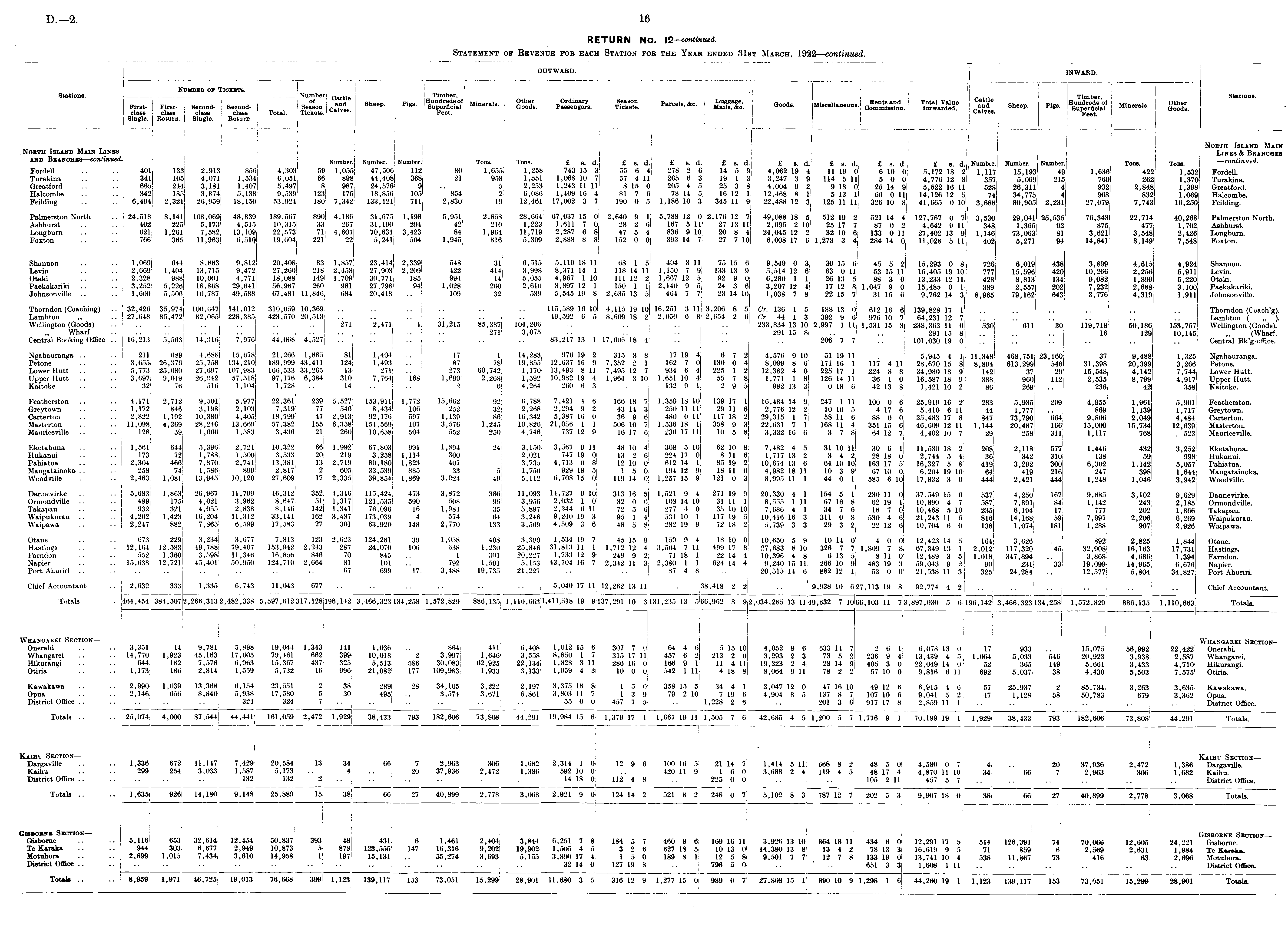 OUTWABD. I INWARD. Number of Tickets. i Stations. Number Cattle Timber, Timber, Stations. First- First- Second- Second-! Season Sheep. Pigs. fSEESS. S. Parcels, &c. j£gg%;. Goods. MisceHaneoue. Sd' -V Sbee P' "flciaf Minerals. Other class class class class | Total. Tickets. v^ttlv ° 8 * Feet. 1 Calves. Feet. Single. Return. Single. Return. J III ! North Island Main North Island Main Lines | | Links & Branches and Branches continued. Number. Number. Number. Tons. Tons. £ 8. d. £ s. d. £ s. d. £ s. d.j £ s. d. £ s. d. £ s. d £ s d Number. Number. Number. Tons. Tons. —continued. Fordell .. .. 401 133 2,913 856 4,303 59 1,055 47,506 112 80 1,655 1,258 743 15 3 55 6 4 278 2 6 14 5 9 4,062 19 4 11 19 0 6 10 0 5,172 18 2 1,117 15,193 49 1,636 422 1,532 Fordell. Turakina .. .. 341 105 4,071 1,534 6,051 66 898 44,408 368 21 958 1,551 1,068 10 7 57 4 11 265 6 3 19 1 3l 3,247 3 9 114 5 11 5 0 0 4,776 12 8 357 5,069 215 769 262 1,370 Turakina. Greatford .. .. 665 244 3,181 1,407 5,497 8 987 24,576 9 5 2,253 1,243 11 11 8 15 0 205 4 5 25 3 8| 4,004 9 2 9 18 0 25 14 9 5,522 16 11 528 26,311 4 932 2,848 1,398 Greatford. Halcombe .. .. 342 185 3,874 5,138 9,539 123 175 18,856 105 854 2 6,086 1,409 16 4 81 7 6 78 14 5 16 12 1| 12,468 8 1 5 13 1 66 0 11 14,126 12 5 74 34,775 4 968 832 1,069 Halcombe. Feilding .. .. 6,494 2,321 26,959 18,150 53,924 180 7,342 133,121 711 2,830 19 12,461 17,002 3 7 190 0 5 1,186 10 3 345 11 9 22,488 12 3l 125 11 11 326 10 8 41,665 0 10 3,688 80,905 2,231 27,079 7,743 16,250 Feilding. Palmerston North .. 24,518 8,141 108,069 48,839 189,567 890 4,186 31,675 1,198 5,951 2,858 28,664 67,037 15 0 2,640 9 1 5,788 12 0 2,176 12 7 49,088 18 5' 512 19 2 521 14 4 127,767 0 7 3,530 29,041 25,535 76,343 22,714 40,268 Palmerston North. Ashhurst .. .. 402 225 5,173 4,515 10,315 33 267 31,190 294 42 210 1,223 1,611 7 0 28 2 6 167 5 11 27 13 11 2,695 2 10 25 17 7 87 0 2 4,642 9 11 348 1,365 92 875 477 1,702 Ashhurst. Longburn .. .. 621 1,261 7,582 13,109 22,573 71 4,607 70,631 3,423 84 1,964 11,719 2,287 6 8 47 5 4 836 9 10 20 8 4 24,045 12 2 32 10 6 133 0 11 27,402 13 9 1,146 73,063 81 3,621 3,548 2,426 Longburn. Foxton .. .. 766 365 11,963 6,51Q 19,604 221 22 5,241 504: 1,945 816 5,309 2,888 8 8 152 0 0 393 14 7 27 7 10 6,008 17 6 1,273 3 4 284 14 0 11,028 5 11 402 5,271 94 14,841 8,149 7,548 Foxton. I" i ■ Shannon .. .. 1,069 644 8,883 9,812 20,408 83 1,857 23,414 2,339 548[ 31 6,515 5,119 18 11 68 1 5 404 3 11 75 15 6 9,549 0 3 30 15 6 45 5 2 15,293 0 8 726 6,019 438 3,899 4,615 4,924 Shannon. Levin .. .. 2,669 1,404 13,715 9,472 27,260 218 2,458 27,903 2,209 422 414 3,998 8,371 14 1 118 14 11 1,150 7 9 133 13 9 5,514 12 6 63 0 11 53 15 11 15,405 19 10 777 15,596 420 10,266 2,256 5,911 Levin. Otaki .. .. 2,328 988 10,001 4,771 18,088 149 1,709 30,771 185! 994 14 5,055 4,967 1 10 111 12 2 1,667 12 5 92 9 0 6,280 1 1 26 13 5 88 3 0 13,233 12 11 428 8,813 134 9,082 1,899 5,220 Otaki. Paekakariki .. .. 3,252 5,226 18,868 29,641 56,987 260 981 27,798 94 1,028 260 2,610 8,897 12 1 150 1 1 2,140 9 5 24 3 6 3,207 12 4 17 12 8 1,047 9 0 15,485 0 1 389 2,557 202 7,232 2,688 3,100 Paekakariki. Johnsonville .. .. 1,600 5,506 10,787 49,588 67,481 11,846 684 20,418 .. 109 32 539 5,545 19 8 2,635 13 5 464 7 7 23 14 10 1,038 7 8 22 15 7 31 15 6 9,762 14 3 8,965 79,162 643 3,776 4,319 1,911 Johnsonville. . Thorndon (Coaching) .. 32,426 35,974 100,647 141,012 310,059 10,369 .. .. .. .. .. .. 115,589 16 10 4,115 19 10 16,251 3 11 3,206 8 5 Cr. 136 1 5| 188 13 0 612 16 6 139,828 17 1 .. .. .. .. .. .. Thorndon (Coach'g). Lambton „ .. 27,648 85,472 82,065 228,385 423,570 20,513 .. .. .. 1 .. .. | .. 49,592 6 5j 8,609 18 2 2,050 6 8 2,654 2 6 Cr. 44 1 3 392 9 6 976 10 7 64,231 12 7i .. .. .. .. .. Lambton ( „ ). Wellington (Goods) .. ... .. .. .. .. .. 271 2,471 4 31,215 85,387 104,206 .. .. .. .. 233,834 13 10 2,997 111 1,531 15 3 238,363 11 0 530 611 30 119,718 50,186 153,757 Wellington (Goods). Wharf .. .. .. .. .. .. .. .. .. ..I .. 271 3,075 .. .. .. .. 291 15 8 .. .. 291 15 8 .. .. .. 16 129 10,145 „ (Wharf. Central Booking Office .. 16,213 5,563 14,316 7,976 44,068 4,527 .. .. .. .. .. ; .. 83,217 13 1 17,606 18 4 .. .. .. 206 7 7 .. 101,030 19 0 1 .. .. .. .. .. Central Bk'g-office. Ngahauranga .. .. 211 689 4,688 15,678 21,266 1,885 81 1,404 .. 17 1 14,283 976 19 2 315 8 8 17 19 4 6 7 2 4,576 9 10 51 19 11 .. 5,945 4 11 11,348 468,751 23,160 37 9,488 1,325 Ngahauranga. Petone .. .. 3,655 26,376 25,758 134,210 189,999 43,411 124 1,493 .. 87 7S 19,855 12,637 16 9 7,352 2 1 162 7 0 130 0 4 8,099 8 6 171 16 1 117 4 11 28,670 15 8 8,894 613,299 546 31,398 20,399 3,266 Petone. Lower Hutt .. .. 5,773 25,080 27,697 107,983 166,533 33,265 13 271 .. 273 60,742 1,170 13,493 8 11 7,495 12 7 934 6 4 225 1 2 12,382 4 0 225 17 1 224 8 8 34,980 18 9 142 37 29 15,548 4,142 7,744 Lower Hutt. Upper Hutt .. .. 3,697 9,019 26,942 57,518 97,176 6,384 310 7,764 168 1,690 2,268 1,592 10,982 19 4 1,964 3 10 1,651 10 4 55 7 8 1,771 1 8 126 14 11 36 1 0 16,587 18 9 388 960 112 2,535 8,799 4,9171 Upper Hutt. Kaitoke .. .. 32 76 516 1,104 1,728 .. 14 .. 2 6 4,264 260 6 3 .. 132 9 1 2 9 5 982 13 3 0 18 6 42 13 8 1,421 10 2 86 269 .. 236 42 358 Kaitoke. Featherston .. .. 4,171 2,712 9,501 5,977 22,361 239 5,527 153,911 1,772 15,662 92 6,788 7,421 4 6 166 18 7 1,359 18 10 139 17 1 16,484 14 9 247 1 11 100 0 6 25,919 16 2 283 5,935 209 4,955 1,961 5,901 Featherston. Greytown .. .. 1,172 846 3,198 2,103 7,319 77 546 8,434 106 252 32 2,268 2,294 9 2 43 14 3 250 11 11 29 11 6 2,776 12 2 10 10 5 4 17 6 5,410 6 11 44 1,777 .. 869 1,139 1,717 Greytown. Carterton .. .. 2,822 1,192 10,380 4,405 18,799 47 2,913 92,176 597 1,139 86 16,342 5,387 16 0 36 9 6 480 0 11 117 18 2 29,315 1 7 58 11 6 88 0 0 35,483 17 8 847 73,790 664 9,806 2,049 4,484 Carterton. Masterton .. .. 11,098 4,369 28,246 13,669 57,382 155 6,358 154,569 107 3,576 1,245 10,826 21,056 1 1 506 10 7 1,536 18 1 358 9 3 22,631 7 1 168 11 4 351 15 6 46,609 12 1