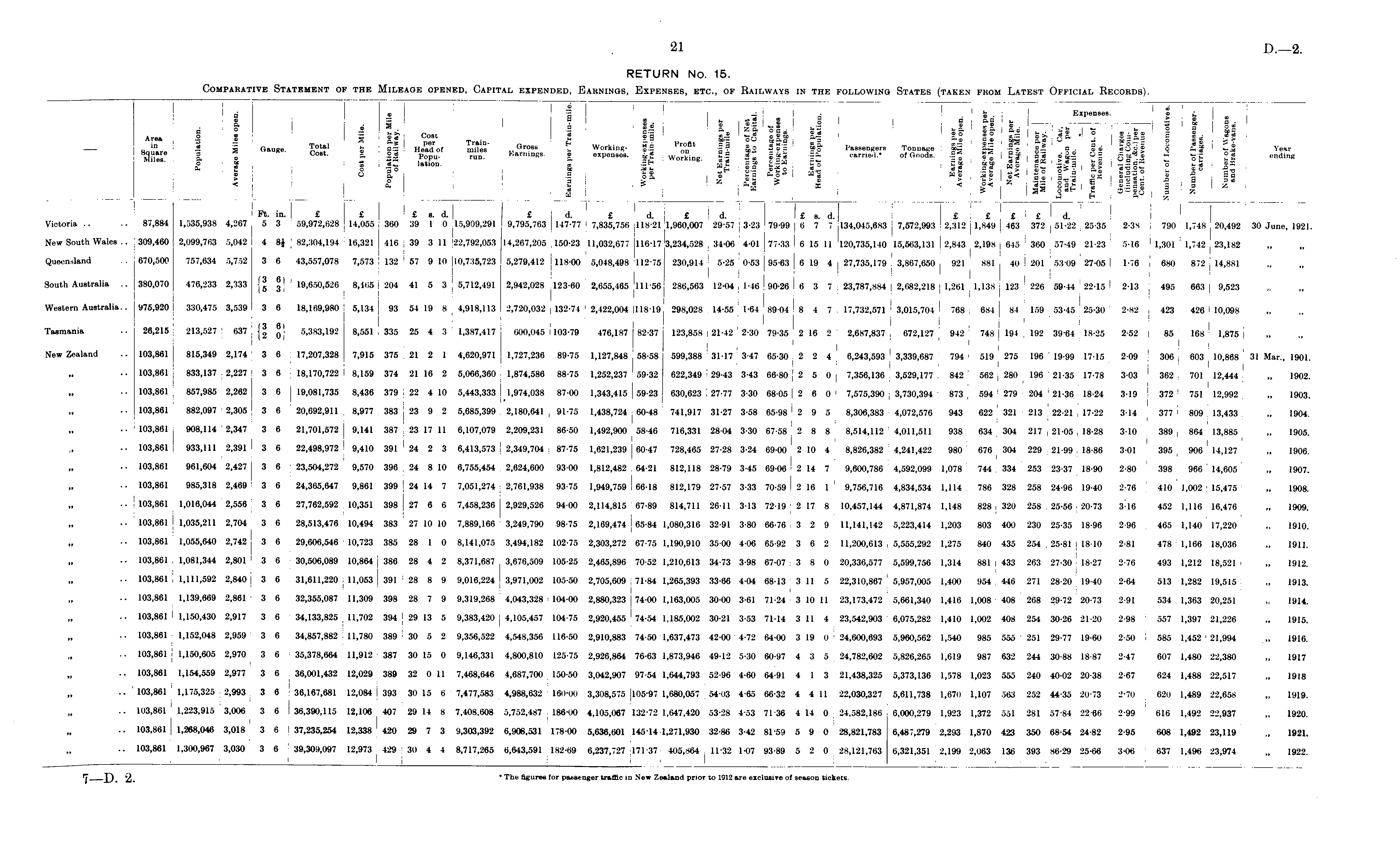 RETURN No. 15. Comparative Statement of the Mileage opened, Capital expended, Earnings, Expenses, etc., of Railways in the following States (taken from Latest Official Records).