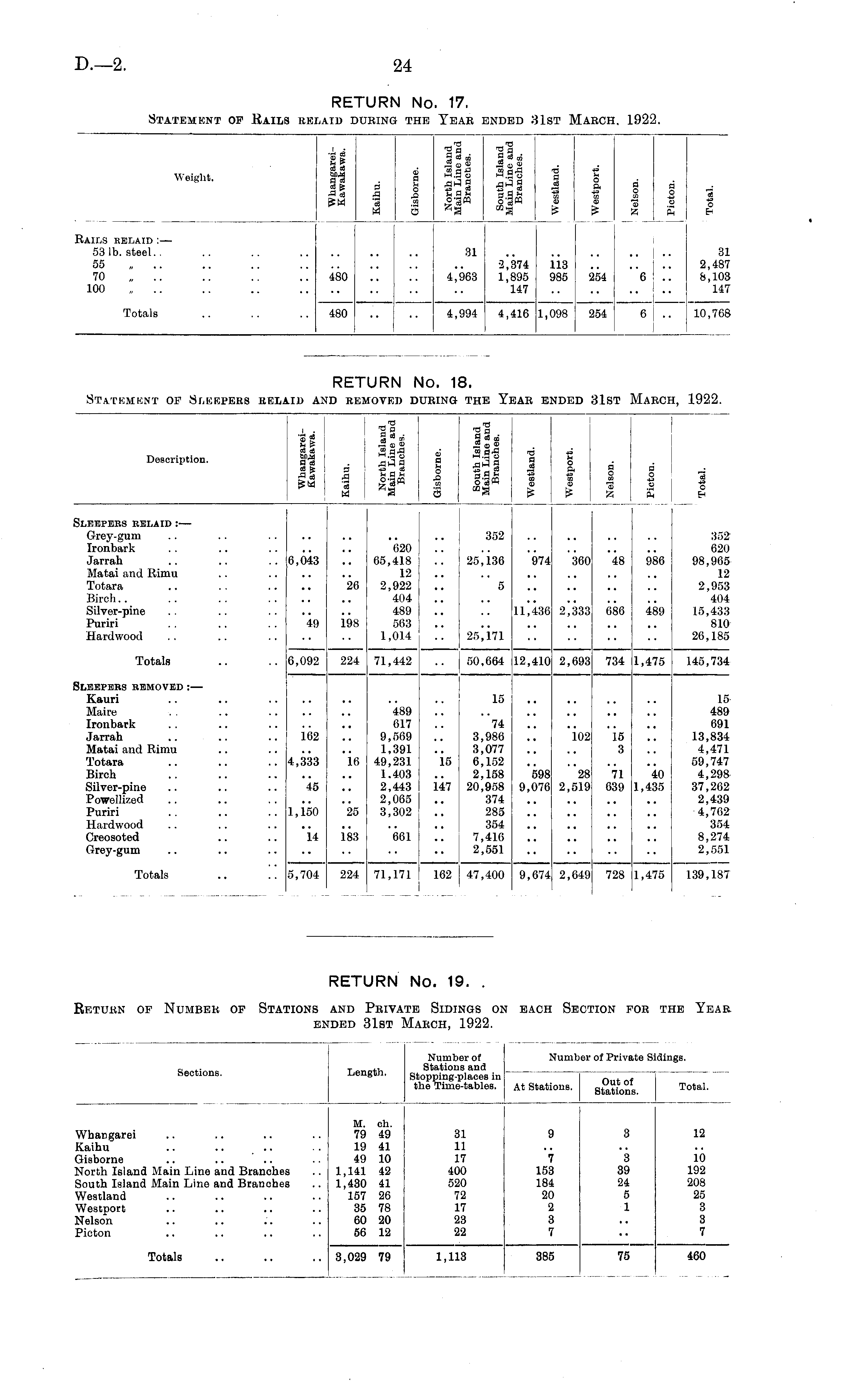 Length. Number of Stations and Stopping-places in the Time-tables. Numl ier of Private Si idings. Sections. At Stations. Out of Stations. Total. M. eh. 79 49 19 41 49 10 1,141 42 1,430 41 157 26 35 78 60 20 56 12 3 12 Whangarei Kaihu .. .. Gisborne North Island Main Line and Branches South Island Main Line and Branches Westland Westport Nelson Pieton 31 11 17 400 520 72 17 23 22 9 7 153 184 20 2 3 7 3 39 24 5 1 10 192 208 25 3 3 7 Totals 3,029 79 1,113 385 75 460