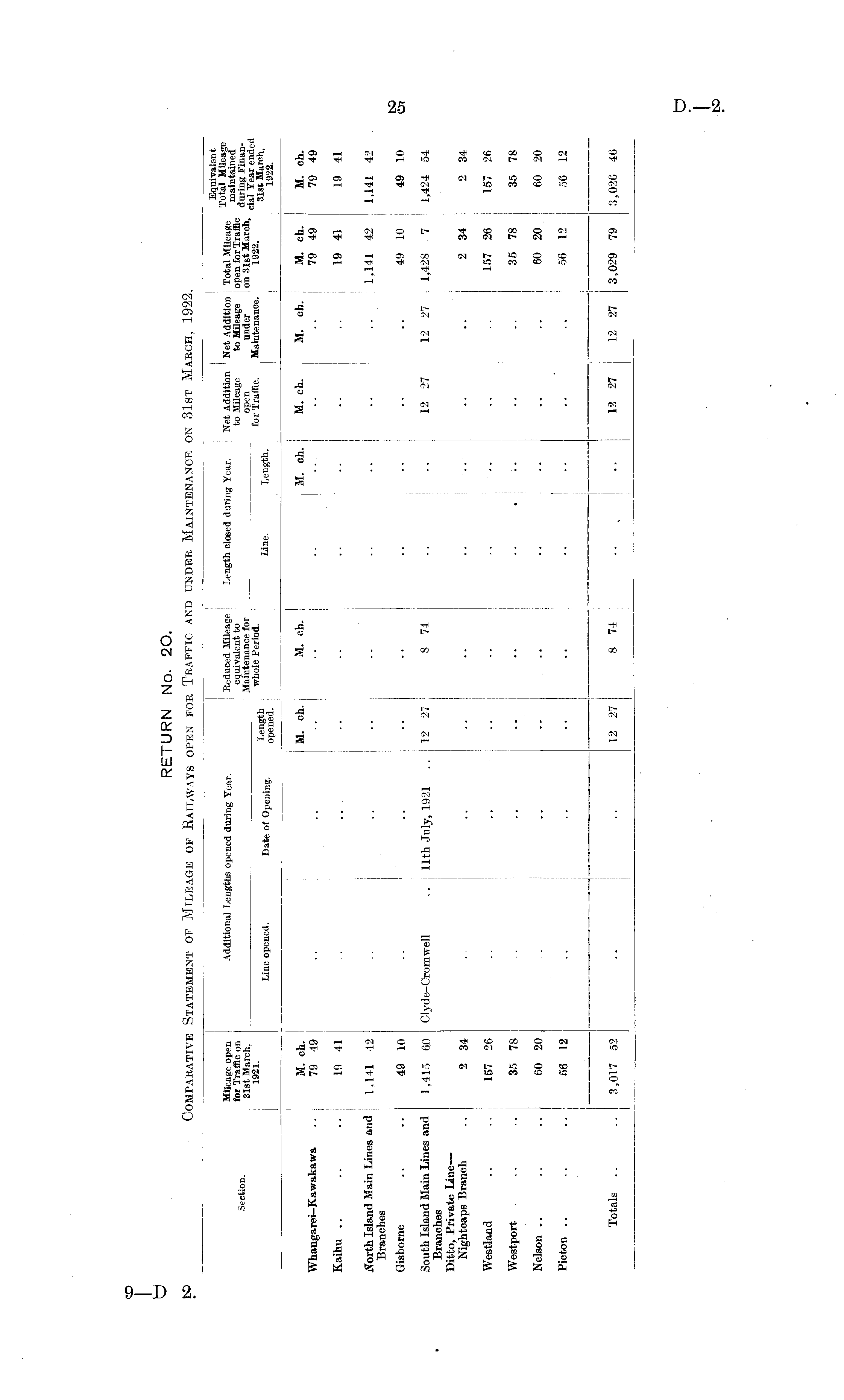 RETURN No. 20. Comparative Statement of Mileage of Railways open foe Traffic and under Maintenance on 31st March, 1922.