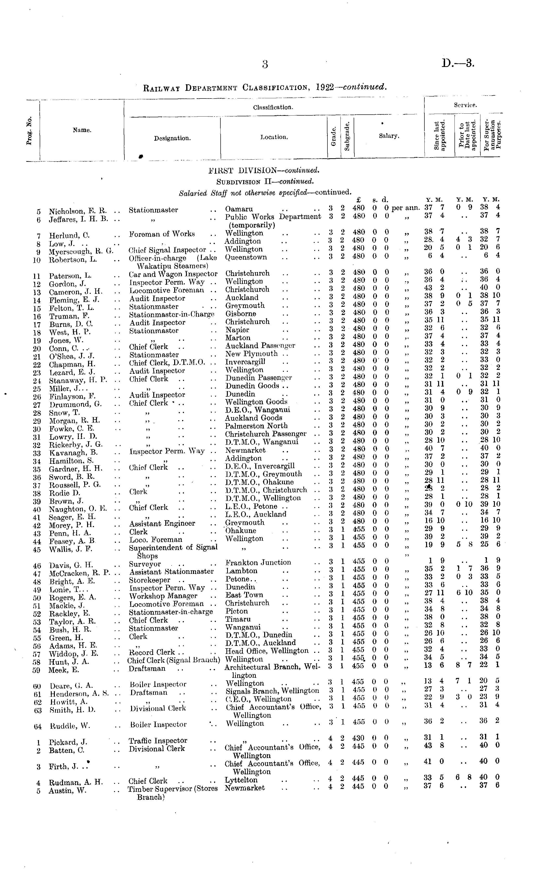 Classification, ti Name. ■§ E , 9 8 Designation. Location. g » Salary. g-g a o •§ .s a # , Classification. Service. ov,i k%i Z-c §-'5s SSZ m fl& B g ft u fl fl ft a a pa? Service. jS -*- »- c as j p g & ftp a FIRST DIVISION— continued. Subdivision II— continued. Salaried Staff not otherwise specified —continued. £ s. d. Y. M. 5 Nicholson, E. R. . • Stationmaster .. Oamaru .. .. 3 2 480 0 0 per ann. 37 7 6 Jeffares, I. H. B. .. „ • • Public Works Department 3 2 480 0 0 „ 37 4 (temporai-ity) 7 Herlund C. •• Foreman of Works .. Wellington .. .. 3 2 480 0 0 „ 38 1 8 Low J ■• ■ •• Addington .. .. 3 2 480 0 0 „ 28. 4 9 Myerseough, R. G. Chief Signal Inspector .. Wellington .. .. 3 2 480 0 0 „ 20 5 10 Robertson, L. •• Offieer-in-charge (Lake Oueenstown .. .. 3 2 480 0 0 „ b 4 Wakatipu Steamers) 11 Paterson L. .. Car and Wagon Inspector Christchurch .. ..3 2 480 0 0 „ 36 0 12 Gordon, J. •• Inspector Perm. Way .. Wellington .. .. 3 2 480 0 0 „ 36 4 13 Cameron, J. H .. Locomotive Foreman .. Christchurch .. .. 3 2 480 0 „ 43 - 14 Flemin". E. J. . . Audit Inspector .. Auckland . . ...32 480 ) U „ d» J 15 Felton, T L. .. Stationmaster - .. Greymouth .. .. 3 2 480 0 0 „ .37 - 16 Truman. P. .. Stationmastcr-in-Charge Gisborne .. . • 3 2 480 0 0 „ .36 .3 17 Burns, ID. C. .. Audit Inspector .. Christchurch .. .. 3 2 480 0 0 „ 35 11 18 West H P. ■• Stationmaster .. Napier .. .. 3 / 480 O U „ St o 19 Jones W .. ,. • - * * Marton .. .. 3 2 480 0 0 ,. 37 4 20 Conn'c. ... •• Chief Clerk .. .. Auokland Passenger ..32 480 00 „ 33 4 21 O'Shea, J. J. ■• Stationmaster .. New Plymouth . . .. 3 2 480 0 0 „ .32 . 22 Chapman, H. .. Chief Clerk, D.T.M.O. .. Invercargill .. ... 2 480 0 0 „ 32 2 23 Lczard, E. J. .. Audit Inspector .. Wellington .. .. 8 2 48 0 0 „ 32 2 24 Stanaway, IT. P. .. Chief Clerk .. .. Dunedin Passenger .. 3 2 48 „ 32 1 25 Miller J • • „ • ■ * * Dunedin Goods .. . . 3 1 480 O O „ 31 11 26 Finlays'onVF. ■'• Audit Inspector .. Dunedin .. •• 3 2 180 0 0 „ 31 4 27 Drummond.G. .. Chief Clerk •.. .. We lington Goods ..3 2 480 0 0 „ 31 98 Snc.w T ., .... D.E.O., Wanganui .. •> 2 480 0 0 „ .30 J 29 EnR H •• •■ Auckland Goods .. 3 2 480 0 0 „ 30 3 30 Kowke C E ' •• •• Palmerston North ..32 480 0 0 „ 30 2 31 wrvll D •■ •• Christchureh Passenger .. 3 2 480 0 0 „ 30 2 32 Rkkerby J G .. „ ■ • D.T.M.O., Wanganui . . 3 2 480 0 0 „ 28 10 33 Kavanagh, B. .. Inspector Perm. Way .. Newmarket .. . . 3 2 480 0 0 „ 40 7 34 Hamilton. S. .. „ •• Addmgton .. •32 480 0 0 „ 37 - 35 Gardner, HI. II. .. Chief Clerk .. * .. D E.G., Invercargill ... 2 48 „ 30 0 •«i 13 R „ •• •• D.T.M.O., Greymouth ...32 480 0 0 „ ■=:» I fl Roussdl P Q •• ' •• D.T.M.O., Ohakune ..3 2 480 0 0 „ 28 11 ll' r°Zd Clerk .. •• D.T.M.O., Christchureh ..3 2 480 0 0 „ 2% 2 S « r ,t n j " .. •• D.T.M.O., Wellington ..3 2 480 0 0 „ 28 1 40 5io.l •• OhirfClerk .. •• L.E.O., Petone. 3 2 480 0 0 39 0 41 Sealer E H „ •• •• L.K.O., Auckland .. 8 2 480 0 O „ 34 / 3 & ?: a h: - tEng ! noer :: & uth :: :.l\Zll : ™ l l tl SSmTb. :: Loco. Foreman . Wellington ..3 1 455 0 0 39 2 45 Wallis, J. F. ■ • Superintendent of Signal „ . • .. 3 J. 400 u u „ ra j 46 Davis, G. III. •• Surveyor Frankton Junction .. 3 1 455 0 0 1 9 47 McCracken, R. P. . • Assistant Stationmaster Lambton .. .. 3 1 4oo 0 O „ 3o f 48 Bright, A. E. .. Storekeeper .. .. Petone. .. .. 3 . 455 0 0 „ 33 . 49 Lonie, T Inspector Perm. Way .. Dunedin .. • 465 0 „ 50 Rogers, E. A. .. Workshop Manager .. East Town .. ... 455 0 „ 27 11 51 Mackie,.!. .. Locomotive Foreman .. Christchurch .. 455 0 „ 38 4 52 Rackiev, E. . • Stationmaster-in-charge Picton .. . • 3 400 0 o „ .4 « 53 Taylor,'A. R. .. Chief Clerk .. .. Timaru .. ... 455 0 0 „ 88 0 54 Bush, H. R. .. Stationmaster .. Wanganui .. •. -3 1 460 O „ 6i 8 fi« G -eon 11 Clerk .. .. D.T.M.O., Dunedin .. 3 1 455 0 0 „ 26 10 56 Adams H E .. ■■ ■■ D.T.M.O.. Auckland ..3 1 455 0 0 .. 26 6 57 Widdop, J. E. . . Record Clerk . . .. Head Office, Wellington .. 3 465 0 0 „ 32 4 58 Hunt, J. A. .. Chief Clerk (Signal Lranch) Wellington .. 455. 0 ,. 34 5 59 Meek, E. . • Draftsman .. .. Architectural Branch, Wei- 3 1 456 0 0 „ 13 6 lington 60 Deire G A .. Boiler Inspector .. Wellington .. . • 3 1 455 0 0 „ 13 4 61 Henderson, A. S. .. Draftsman .. .. SigniUs Branch, Wellington 3 1 -loo 0 0 „ 27 3 62 Hewitt, A. •• „ •■ •• C.E.O., Wellington .. 3 465 ., 22 9 63 Smith, H. ID. .. Divisional Clerk .. Chief Accountant s Office, ., 1 4.),) 0 0 „ 31 4 Wellington 64 Ruddle, W. . • Boiler Inspector \. Wellington .. ..31 455 0 0 „ 36 2 Y. M. Y. M. 0 9 38 4 .. 37 4 38 7 4 3 32 7 0 1 20 6 6 4 36 0 ;. 36 4 40 0 0 1 38 10 0 5 37 7 36 3 .. 35 11 32 6 .. 37 4 .. 33 4 32 3 33 0 32 2 0 1 32 2 31 11 0 9 32 1 .. 31 0 30 9 30 3 30 2 .. 30 2 .. 28 10 .. 40 0 .. 37 2 30 0 29 1 .. 28 11 28 2 .. 28 I. 0 10 39 10 .. 34 7 16 10 29 9 .. 39 2 5 8 25 6 19 1 7 36 9 0 3 33 5 33 6 6 10 35 0 .. 38 4 34 8 .. 38 0 .. 32 8 .. 26 10 26 6 .. 33 0 34 5 8 7 22 1 7 1 20 5 27 3 3 0 23 9 .. 31 4 36 2 1 Kokard, J. • ■ Traffic Inspector .. „ • • • • 4 2 -430 0 j 2 Batten, 0 •• Divisional Clerk .. Chief Accountant's Office, 4 2 445 0 0 „ 43 8 Wellington 3 Firth, J. . .* • • .. ■ • Chie{ Accountant's Office, 4 2 445 0 0 „ 41 0 Wellington 4 Rudman,A.H. .. Chief Clerk .. .. Lyttelton .. .. 4 2 446 0 0 „ 33 5 5 Austin, W. •• Timber Supervisor (Stores Newmarket .. . . 4 2 44o 0 0 „ 6i o Branch) .. 31 1 .. 40 0 .. 40 0 6 8 40 0 .. 37 6
