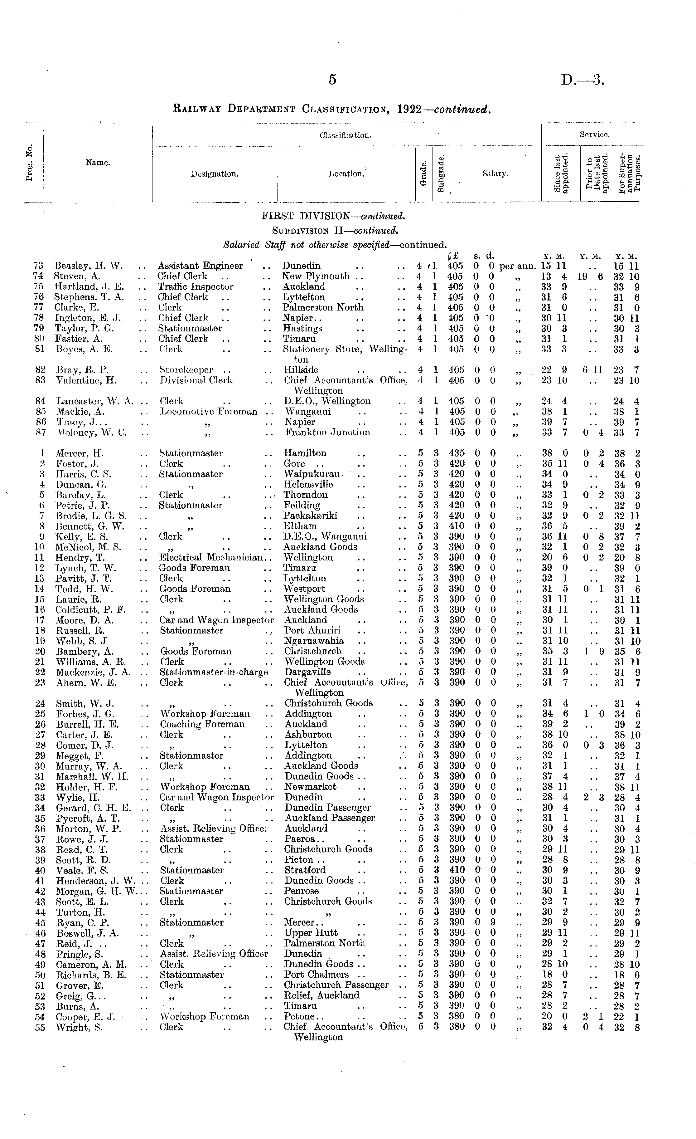 Classification. Service. A Name. 6 f 11 SjS IJ | 2 Designation. Location. ,g fcj, Salary, g-| th % 8. FIRST DIVISION— continued. Subdivision II— continued. Salaried Staff not otherwise specified —continued. I»£ s. d. Y. M. Y. M. Y. M. 73 Bcaslev, II. W. .. Assistant Engineer .. Dunedin .. ..4/1 405 0 0 per ann. 15 11 .. 15 11 74 Steven, A. .. Chief Clerk '.. .. New Plymouth .. .. 4 1 405 0 0 „ 13 4 19 6 32 10 75 Hartland, J. E. .. Traffic Inspector .. Auckland .. .. 4 1 405 0 0 „ 33 9 .. 33 9 76 Stephens, T. A. . . Chief Clerk .. .. Lyttelton .. .. 4 1 405 0 0 „ 31 6 31 6 77 Clarke, E. .. Clerk .. .. Palmerston North .. 4 1 405 0 0 ., 31 0 .. 31 0 78 Ingleton, E. J. .. Chief Clerk .. .. Napier.. .. .. 4 1 405 0 0 „ 30 11 .. 30 11 79 Taylor, P. G. .. Stationmaster .. Hastings .. .. 4 1 405 0 0 „ 30 3 .. 30 3 80 Fastier, A. .. Chief Clerk .. .. Timaru .. .. 4 1 405 0 0 „ 31 1 .. 31 1 81 IBoyos, A. E. .. Clerk .. .. Stationery Store, Weiling- 4 1 405 0 0 „ 33 3 .. 33 3 ton 82 Bray, R. P. . . Storekeeper .. .. Hillside .. ..41 405 0 0 „ 22 9 6 11 23 7 83 Valentine, H. .. Divisional Clerk . . Chief Accountant's Office, 4 1 405 0 0 „ 23 10 .. 23 1.0 Wellington 84 Lancaster, W. A. .. Clerk .. .. ID.E.O., Wellington .. 4 1 405 0 0 „ 24 4 .. 24 4 85 Mackie, A. .. Looomotivo Foreman .. Wanganui .. ..41 405 00 ,, 38 1 . . 38 1 86 Tracy, J... .. „ .. Napier .. .. 4 1 405 0 0 „ 39 7 .. 39 7 87 Moloney, W. O. .. „ .. Frankton Junction .. 4 1 405 0 0 „ 33 7 0 4 33 7 1 Mercer, H. .. Stationmaster .. Hamilton .. .. 5 3 435 0 0 ,. 38 0 0 2 38 2 2 Foster, J. .. Clerk .. .. Gore .. .. .. 5 3 420 0 0 „ 35 11 0 4 36 3 3 Harris, C. S. .. Stationmaster .. Waipukurau. .. .. 5 3 420 0 0 .. 34 0 .. 34 0 4 Duncan, G. .. ., .. Helensville .. .. 5 3 420 0 0 ,. 34 9 .. 34 9 5 Barclav, L. .. Clerk .. ... Thorndon .. ..5 3 420 0 0 „ 33 1 0 2 33 3 6 Petrie, J. P. .. Stationmastor .. Feilding .. .. 5 3 420 0 0 ,, 32 9 .. 32 9 7 Brodie, L. G. S. .. „ .. Paekakariki .. .. 5 3 420 0 0 „ 32 9 0 2 32 11 8 Bennett, G. W. .. „ .. Mltham .. .. 5 3 410 0 0 „ 36 5 .. 39 2 9 Kelly, E. S. . . Clerk .. .. D.E.O., Wanganui .. 5 3 390 0 0 „ 36 11 0 8 37 7 10 McNicol, M. S. .. „ .. .. Auckland Goods ..53 390 0 0 „ 32 1 0 2 32 3 11 Hendry, T. .. Electrical Mechanician.. Wellington .. .. 5 3 390 0 0 „ 20 6 0 2 20 8 12 Lynch, T. W. .. Goods Foreman .. Timaru .. ..53 390 00 „ 39 0 .. 39 0 13 Pavitt, J. T. .. Clerk .. .. Lyttelton .. .. 5 3 390 0 0 ,, 32 I .. 32 1 14 Todd, H. W. .. Goods Foreman .. Westport .. .. 5 3 390 0 0 „ 31 5 0 I 31 6 15 Laurie, R. .. Clerk .. .. Wellington Goods .. 5 3 390 0 0 „ 31 II .. 31 II 16 Coldieutt, P. F. .. „ .. .. Auckland Goods .. 5 3 390 0 0 „ 31 11 .. 31 11 17 Moore, D. A. .. Car and Wagon inspector Auckland .. .. 5 3 390 0 0 „ 30 1 .. 30 1 18 Russell, R. .. Stationmaster .. Port Ahuriri .. ..5 3 390 0 0 .. 3111. .. 3111 19 Webb, S. J. .. „ .. Ngaruawahia .. .. 5 3 390 0 0 .. 31 10 .. 31 10 20 Bamberv, A. .. Goods Foreman .. Christchurch .. .. 5 3 390 0 0 „ 35 3 1 9 35 6 21 Williams, A. R. .. Clerk .. .. Wellington Goods .. 5 3 390 0 0 „ 31 11 31 11 22 Mackenzie, J. A. . . Stationmaster-in-charge Dargaville .. ..53 390 0 0 ,, 31 9 31 9 23 Ahem, W. E. .. Clerk .. .. Chief Accountant's Office, 5 3 390 0 0 „ 31 7 .. 31 7 Wellington 24 Smith, W. J. • • „ • • •. Christchurch Goods .. 5 3 390 0 0 „ 31 4 .. 31 4 25 Forbes, J. G. . . Workshop Foreman . . Addington .. .. 5 3 390 0 0 „ 34 6 1 0 34 6 26 Burrell, H. E. .. Coaching Foreman . . Auckland .. .. 5 3 390 0 0 „ 39 2 .. 39 2 27 Carter, J. E. . . Clerk .. .. Ashburton .. .-. 5 3 390 0 0 „ 38 10 38 10 28 Comer, D. J. . . „ .. •. Lyttelton .. ..53 390 0 0 „ 36 0 03 36 3 29 Megget, F. . . Stationmaster .. Addington .. ..53 390 00 „ 32 1 32 1 30 Murrav, AV. A. .. Clerk .. .. Auckland Goods .. 5 3 390 0 0 ,, 31 1 .. 31 1 31 Marshall, W. H. .. „ . . .. Dunedin Goods .. .. 5 3 390 0 0 „ 37 4 . . 37 4 32 Holder, H. F. . . Workshop Foreman .. Newmarket .. .. 5 3 390 0 0 „ 38 11 . . 38 11 33 Wylie, H. . . Car and Wagon Inspector Dunedin .. .. 5 3 390 0 0 ., 28 4 2 3 28 4 34 Gerard, C. H. E. .. Clerk .. .. Dunedin Passenger .. 5 3 390 0 0 „ 30 4 .. 30 4 35 Pycroft, A. T. .. „ .. .. Auckland Passenger .. 5 3 390 0 0 „ 31 1 .. 31 1 36 Morton, W. P. .. Assist. Relieving Officer Auckland .. ..53 390 00 „ 30 4 30 4 37 Rowe, J. J. .. Stationmaster .. Paeroa.. .. .. 5 3 390 0 0 „ 30 3 .. 30 3 38 Read, C. T. .. Clerk .. .. Christchurch Goods .. 5 3 390 0 0 „ 29 11 .. 29 11 39 Scott, R. D. • • „ .. • • Picton .. .. .. 5 3 390 0 0 „ 28 8 .. 28 8 40 Veale, F. S. .. Stationmaster .. Stratford .. .. 5 3 410 0 0 „ 30 9 . . 30 9 41 Henderson, J. W. .. Clerk '.. .. Dunedin Goods .. .. 5 3 390 0 0 „ 30 3 .. 30 3 42 Morgan, G. H. W... Stationmaster .. Penrose . . .. 5 3 390 0 0 „ 30 1 30 1 43 Scott, E. L. .. Clerk .. .. Christchurch Goods .. 5 3 390 0 0 „ 32 7 . . 32 7 44 Turton, H. .. .. .. „ .. 5 3 390 0 0 „ 30 2 .. 30 2 45 Rvan, C. P. .. Stationmaster .. Mercer.. .. .. 5 3 390 0 9 „ 29 9 .. 29 9 46 Boswell, J. A. .. „ .. Upper Hutt .. ..5 3 390 0 0 „ 29 11 .. 29 1.1 47 Reid, J. .. . . Clerk .. .. Palmerston North .. 5 3 390 0 0 „ 29 2 . . 29 2 48 Pringle, S. .. Assist. Relieving Officer Dunedin .. .. 5 3 390 0 0 „ 29 1 . . 29 1 49 Cameron, A. M. ..' Clerk .. .. Dunedin Goods .. .. 5 3 390 0 0 ,, 28 10 .. 28 10 50 Richards, B. E. . . Stationmaster .. Port Chalmers .. .. 5 3 390 0 0 „ 18 0 .. 18 0 51 Grover, E. .. Clerk .. .. Christchurch Passenger .. 5 3 390 0 0 „ 28 7 .. 28 7 52 Greig, G... .. „ .. .. Relief, Auckland .. 5 3 390 0 0 „ 28 7 . . 28 7 53 Burns, A. . . ,, .. • • Timaru .. .. 5 3 390 0 0 „ 28 2 .. 28 2 54 Cooper, E. J. .. Workshop Foreman .. Petone.. .. ... 5 3 380 0 0 „ 20 0 2 1 22 1 55 Wright, S. . . Clerk .. . . Chief Accountant's Office, 5 3 380 0 0 „ 32 4 0 4 32 8 Wellington