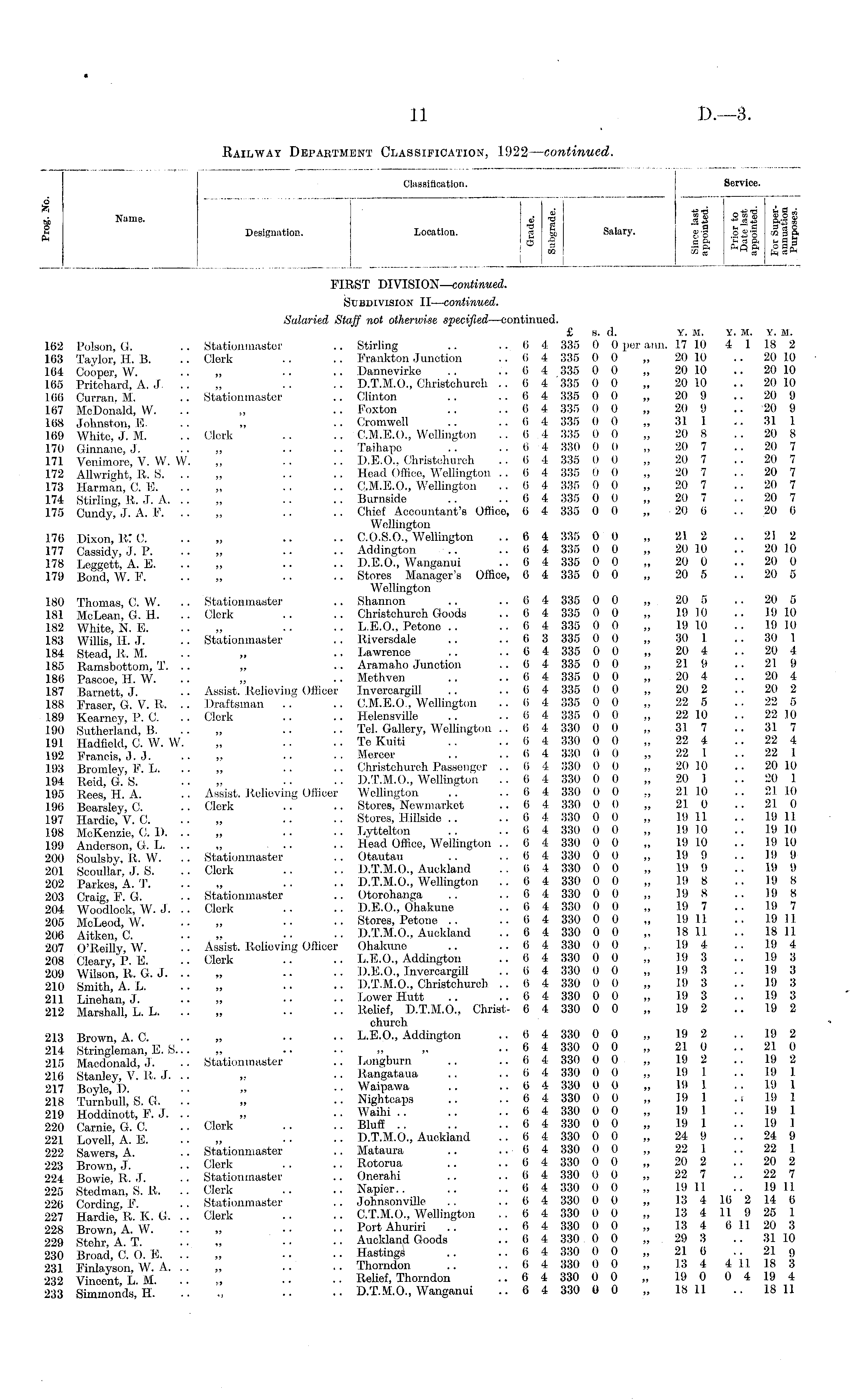 Classification. Service. _ . , . . . Kama • ij c0 <U 9 "> OJ 4) O S S Designation. Location. g §, Salary. «-| §$•§ M % ft Classification. Service. .2 So >..<q ft C a j. 5 « £ DQ 3 ft sis FIRST DIVISION— continued. Subdivision II— continued. Salaried Staff not otherwise specified —continued. £ s. d. Y. M. Y. M. Y. M. 162 Poison, G. .. Stationmaster .. Stirling .. ..6 4 335 0 0 per ann. 17 10 4 1 18 2 163 Taylor, H. B. .. Clerk .. .. Frankton Junction .. 6 4 335 0 0 „ 20 10 .. 20 10 164 Cooper, W. .. .. .. Dannevirke .. ..6 4 335 0 0 „ 20 10 .. 20 10 165 Pritcharcl, A. ,1 „ . . .. D.T.M.O., Christchureh ..64 335 0 0 „ 20 10 .. 20 10 166 Cm-ran. M. .. Stationmaster .. Clinton .. ..64 335 0 0 „ 20 9 .. 20 9 167 McDonald, W. .. „ .. Foxton .. ..64 335 0 0 „ 20 9 .. 20 9 168 Johnston, E. .. „ .. Cromwell . . ..64 335 0 0 „ 31 1 .. 31 1 169 White, J. M. .. Clerk .. .. CM.E.G., Wellington .. 6 4 335 0 0 „ 20 8 .. 20 8 170 Ginnane, J. ,. .. .. Taihape .. ..6 4 330 0 0 „ 20 7 .. 20 7 171 Venimore, V. W. W. „ .. .. D.E.O.. Christchurch . . 6 4 335 0 0 „ 20 7 .. 20 7 172 Allwright, li. S. .. „ .. • • Head Office, Wellington ..64 335 0 0 „ 20 7 . . 20 7 173 Harman, C. E. .. „ .. • • C.M.E.O., Wellington ..64 335 0 0 „ 20 7 .. 20 7 174 Stirling, R. J. A. .. „ .. .. Burnside .. ..64 335 0 0 „ 20 7 .. 20 7 175 Cundy, J. A. F. .. „ . . • • Chief Accountant's Office, 6 4 335 0 0 „ 20 6 .. 20 6 Wellington 176 Dixon, R,:C. „ .. •• C.O.S.O., Wellington ..6 4 335 0 0 „ 21 2 .. 21 2 111 Cassidy, J. P. • • „ • • ■ • Addington .. ..04 335 0 0 „ 20 10 .. 20 10 178 Leggett, A. E. .. „ .. .. D.E.O., Wanganui ..64 335 0 0 „ 20 0 .. 20 0 179 Bond, W. F. „ • • ■ • Stores Manager's Office, 6 4 335 0 0 „ 20 5 .. 20 5 Wellington 180 Thomas, C. W. .. Stationmaster .. Shannon .. ..64 335 0 0 „ 20 5 .. 20 5 181 McLean, G. H. .. Clerk .. .. Christchurch Goods .. 6 4 335 0 0 „ 19 10 .. 19 10 182 White, N. E. .. „ .. •• L.E.O., Petone .. .. 6 4 335 0 0 „ 19 10 .. 19 10 183 Willis, H. J. • • Stationmaster .. Riversdale .. ..63 335 0 0 „ 30 1 .. 30 1 184 Stead, li. M. „ • • Lawrence .. ..04 335 0 0 „ 20 4 .. 20 4 1.85 Ramsbottom, T. .. „ .. Aramaho Junction .. 6 4 335 0 0 „ 21 9 .. 21 9 186 Pascoe, IH. W. „ ■ • Mothven .. ..64 335 0 0 „ 20 4 .. 20 4 187 Barnett, J. . - Assist. Relieving Officer Invercargill .. ..64 335 0 0 „ 20 2 .. 20 2 188 Eraser, G. V. R. .. Draftsman .. .. C.M.E.O., Wellington •• 6 4 335 0 0 „ 22 5 .. 22 5 189 Kearney, P.O. .. Clerk .. .. Helonsville .. ..6 4 335 0 0 „ 22 10 .. 22.10 190 Sutherland, B. .. „ . • • • Tel. Gallery, Wellington .. 6 4 330 0 0 „ 31 7 .. 31 7 191 Hadfield, C. W. W. „ .. .. Te Kuiti .. ..64 330 0 0 „ 22 4 .. 22 4 192 Francis, J.J. .. •• •• Mercer .. ..6 4 330 0 0 „ 22 1 .. 22 1 193 Bromley F L. .. „ .. •• Christchurch Passenger .. 6 4 330 0 0 „ 20 10 .. 20 10 194 Reid, G. S. . • ,. • ■ • • D.T.M.O., Wellington ..64 330 0 0 „ 20 1 .. 20 1 195 Rees, H. A. ., Assist. Relieving Officer Wellington .. ..64 330 0 0 „ 2110 .. 211.0 196 Boarsley, 0. . • Clerk .. .. Stores, Newmarket .. 6 4 330 0 0 „ 21 0 21 0 197 Hardie V. C. .. •• •• Stores, Hillside .. ..6 4 330 0 0 „ 19 11 .. 19 11 198 McKenzie, O. ID. .. •• •• Lyttelton .. ..0 4 330 0 0 „ 19 1.0 .. 19 10 199 Anderson, G. L. .. „ •• •• Head Office, Wellington ..6 4 330 0 0 „ 19 10 .. 19 10 200 Soulsby, R. W. .. Stationmaster .. Otautau .. ..6 4 330 0 0 „ 19 9 .. 19 9 201 Scoullar, J. S. .. Clerk .. .. D.T.M.O., Auckland .. 6 4 330 0 0 „ 19 9 .. 19 9 202 Parkes, A. T. .. .. .. D.T.M.O., Wellington ..6 4 330 0 0 „ 19 8 .. I!) 8 203 Craig F. G. .. Stationmaster .. Otorohanga .. .. 6 4 330 0 0 „ 19 8 .. 19 8 204 Woodlock, W. J. .. Clerk .. .. D.E.O., Ohakune ..6 4 330 0 0 „ 1!) 7 .. 19 7 205 McLeod W .. „ •• •• Stores, Petone .. ..6 4 330 0 0 ,, 19 11 .. 19 11 206 Aitken, C. • • ,. •• ■• D.T.M.O,, Auckland ..6 4 330 0 0 „ 18 11 .. 18 11 207 O'Reilly W. •• Assist. Relieving Officer Ohakimc .. .. 6 4 330 0 0 ,. 19 4 .. 19 4 208 Oleary.P. E. .. Clerk .. .. L.E.O., Addington .. 6 4 330 0 0 „ 19 3 .. 19 3 209 Wilson, R. G. J. .. .. •• D.E.O., Invercargill ..6 4 330 0 0 „ 19 8 .. 19 8 210 Smith A L „ .. •• D.T.M.O., Christehureh ..6 4 330 0 0 „ 19 3 .. 19 3 211 Linehan J „ •• •• Lower Hutt .. .. 6 4 330 0 0 „ I!) 3 ..19 3 212 Marshall, L. L. .. „ .. • • Relief, D.T.M.O., Christ- 0 4 330 0 0 „ 19 2 .. 19 2 church 213 Brown A. C. „ . • ■ • L.E.O., Addington ..64 330 0 0 „ 19 2 .. 19 2 214 Stringleman,E.S... „ .. .. ,. ..6 4 330 0 0 „ 21 0 .. 21 0 215 Maedonald, J. • • Stationmaster .. Longburn .. ..64 330 0 0 „ 19 2 .. 19 2 216 Stanley, V. R. J. .. ,, •• Rangataua .. ..6 4 330 0 0 „ 19 I. .. 19 1 217 Boyle D .. „ •• Waipawa .. ..6 4 330 0 0 „ 19 1 .. 19 1 218 Turnbull, S. G. .. „ •• Nightcaps .. ..6 4 330 0 0 „ 19 1 .. 19 1 219 Hoddinott, F. J. .. „ .. Waihi 6 4 330 0 0 „ 19 1 .. 19 1 220 Carnie.G. C. .. Clerk Bluff 6 4 330 0 0 „ 19 1 ..19 1 221 Lovell, A. E. • • „ • ■ • • D.T.M.O., Auckland .. 6 4 330 0 0 „ 24 9 .. 24 9 222 Sawers, A. .. Stationmaster .. Mataura .. ..04 330 0 0 „ 22 1 .. 22 1 223 Brown, J. .. Clerk .. .. Rotorua .. ..6 4 330 0 0 „ 20 2 .. 20 2 224 Bowie, R. J. . . Stationmaster .. Onerahi .. ..64 330 0 0 „ 22 7 .. 22 7 225 Stedman, S. li. .. Clerk .. .. Napier.. .. ..6 4 330 0 0 „ 19 11 .. 19 11 226 Cording, F. .. Stationmaster .. Johnsonville .. ..64 330 0 0 „ 13 4 16 2 14 6 227 Hardie! R. K. G. .. Clerk .. .. C.T.M.O., Wellington ..6 4 330 0 0 „ 18 4 11 9 25 1 228 Brown AW .. „ •• •• Port Ahuriri .. ..6 4 330 0 0 „ 13 4 6 11 20 3 229 Stehr, A. T. .. „ •• •■ Auckland Goods ..6 4 330 0 0 „ 29 3 .. 3110 230 Broad 0 O E „ •