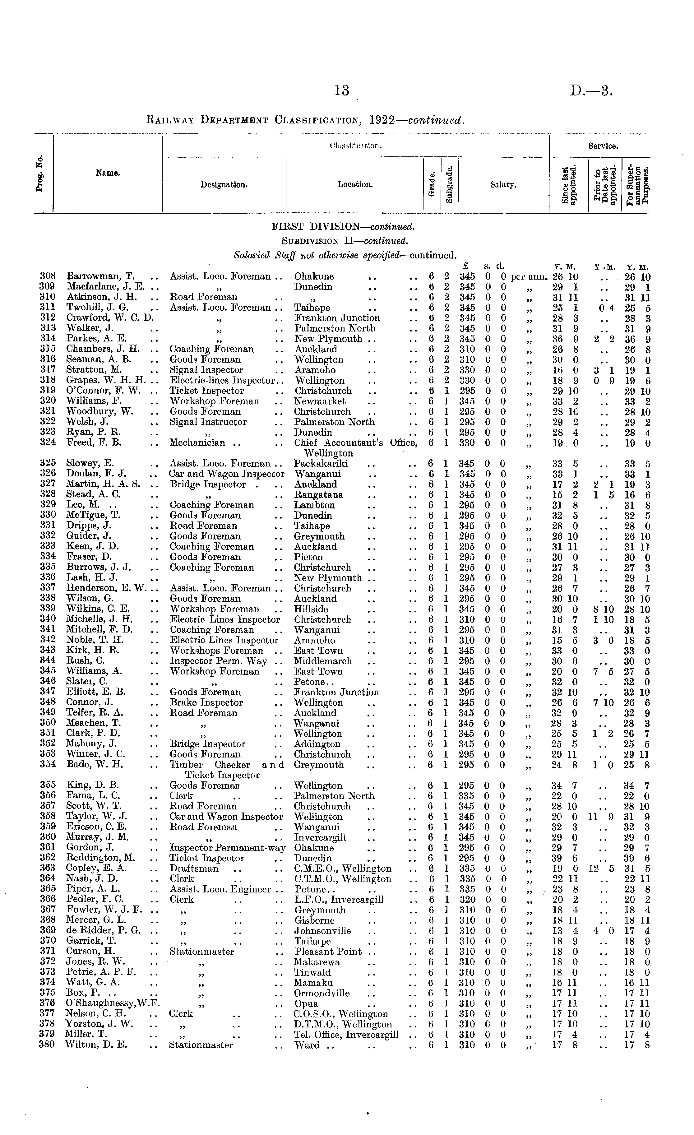 Classification. Service. Service. Name. Designation. Location. <a5 d xi g tc * 1 Salary. II Sit d m 1-1 d y Q .2^0 d ft P <s ft 3a Ph q ft III «3 B ft n M ofl£ FIRST DIVISION— continued. Subdivision II— continued. Salaried Staff not otlierwise specified —continued. £ s. d. Y. M. ¥ .11. Y. M. 308 Barrowman, T. .. Assist. Loco. Foreman .. Ohakune .. .. 6 2 345 0 0 per ann. 26 10 .. 26 10 309 Macfarlane, J. E. .. „ Dunedin .. .. 6 2 345 0 0 „ 29 1 .. 29 1 310 Atkinson, J. H. .. Road Foreman .. „ .. .. 6 2 345 0 0 „ 31 11 31 11 311 Twohill, J. G. .. Assist. Loco. Foreman .. Taihape .. .. 6 2 345 0 0 „ 25 1 0 4 26 5 312 Crawford, W. C. D. „ .. Frankton Junction .. 6 2 345 0 0 „ 28 3 .. 28 3 313 Walker, J. .. „ .. Palmerston North .. 6 2 345 0 0 „ 31 9 .. 31 9 314 Parkes, A. E. .. „ .. New Plymouth .. .. 6 2 345 0 0 „ 36 9 2 2 36 9 315 Chambers, J. H. .. Coaching Foroman .. Auckland .. .. 6 2 310 0 0 „ 26 8 .. 26 8 316 Seaman, A. B. .. Goods Foroman .. Wellington .. .. 6 2 310 0 0 „ 30 0 .. 30 0 317 Stratton, M. .. Signal Inspector .. Aramoho .. .. 6 2 330 0 0 „ Ki 0 3 1 19 1 318 Grapes, W. H. H. .. Electric-lines Inspector.. Wellington .. .. 6 2 330 0 0 „ 18 9 0 9 19 6 319 O'Connor, F. W. .. Ticket Inspector .. Christchurch .. .. 6 1 295 0 0 „ 29 10 .. 29 10 320 Williams, F. .. Workshop Foreman .. Newmarket .. .. 6 1 345 0 0 „ 33 2 ,. 33 2 321 Woodbury, W. .. Goods Foreman .. Christchurch .. .. 6 1 295 0 0 „ 28 10 .. 28 10 322 Welsh, J. .. Signal Instructor .. Palmerston North .. 6 1 295 0 0 „ 29 2 .. 29 2 323 Ryan, P. R. .. „ .. Dunedin .. .. 6 1 295 0 0 „ 28 4 .. 28 4 324 Freed, F. B. .. Mechanician .. .. Chief Accountant's Office, 6 1 330 0 0 „ 19 0 .. 19 0 Wellington 325 Slowey, E. .. Assist. Loco. Foreman .. Paekakariki .. .. 6 1 345 0 0 „ 33 5 .. 33 5 320 Doolan, F. J. .. Car and Wagon Inspector Wanganui .. ..61 345 00 ,. 33 1 33 1 327 Martin, H. A. S. .. Bridge Inspector . .. Auokland .. .. 6 1 345 0 0 „ 17 2 2 I 19 8 328 Stead, A. C. .. „ .. Rangataua .. .. 6 1 346 0 0 „ 15 2 I 5 16 6 329 Lee, M. .. .. Coaching Foreman .. Lambton .. .. 6 1 295 0 0 „ 31 8 31 8 330 McTigue, T. .. Goods Foreman .. Dunedin .. .. 6 1 295 0 0 „ 32 5 .. 32 5 331 Dripps, J. .. Road Foreman .. Taihape .. .. 6 1 345 0 0 „ 28 0 .. 28 0 332 Guider, J. .. Goods Foreman .. Greymouth .. .. 6 1 295 0 0 „ 26 10 .. 26 10 333 Keen, J. D. .. Coaching Foreman .. Auckland .. .. 6 1 295 0 0 „ 31 11 .. 31 11 334 Fraser, D. .. Goods Foreman .. Pieton .. .. 6 1 295 0 0 „ 30 0 30 0 335 Burrows, J. J. .. Coaching Foreman .. Christchurch .. ..61 295 0 0 „ 27 3 27 3 336 Lash, H. J. .. „ .. New Plymouth .. .. 6 1 295 0 0 „ 29 1 29 1 337 Henderson, E. W. .. Assist. Loco. Foreman .. Christchureh .. .. 6 1 345 0 0 „ 26 7 .. 26 7 338 Wilson, G. .. Goods Foreman .. Auckland .. .. 6 1 295 0 0 „ 30 10 .. 30 10 339 Wilkins, C. E. .. Workshop Foreman .. Hillside .. .. 6 1 345 0 0 „ 20 0 8 10 28 10 340 Michelle, J. H. .. Electric Lines Inspector Christchurch .. .. 6 1 310 0 0 „ 16 7 1 10 18 5 341 Mitchell, F. D. .. Coaching Foreman .. Wanganui .. .. 6 1 295 0 0 „ 31 3 31 3 342 Noble, T. H. .. Electric Lines Inspector Aramoho .. .. 6 1 310 0 0 „ 15 5 3 0 18 5 343 Kirk, H. R. .. Workshops Foreman .. East Town .. .. 6 1 345 0 0 „ 33 0 .. 33 0 344 Rush, C. .. Inspector Perm. Way .. Middlemarch .. .. 6 1 295 0 0 „ 30 0 .. 30 0 345 Williams, A. .. Workshop Foreman' .. East Town .. .. 6 1 345 0 0 „ 20 0 7 5 27 5 346 Slater, C. .. „ .. Petone.. .. .. 6 1 345 0 0 „ 32 0 32 0 347 Elliott, E. B. .. Goods Foreman .. Frankton Junction .. 6 1 295 0 0 „ 32 10 .. 32 10 348 Connor, J. .. Brake Inspector .. Wellington .. .. 6 1 345 0 0 „ 26 6 7 10 26 6 349 Telfer, R. A. .. Road Foreman .. Auckland .. .. 6 1 345 0 0 „ 32 9 32 9 350 Meaehen, T. „ .. Wanganui .. .. 6 1 345 0 0 „ 28 3 .. 28 3 351 Clark, P. D. .. „ .. Wellington .. .. 6 1 345 0 0 ,, 25 5 1 2 26 7 352 Mahony, J. .. Bridge Inspector .. Addington .. ..61 345 00 „ 25 5 25 5 353 Winter, J. C. .. Goods Foreman .. Christchureh .. .. 6 1 295 0 0 „ 29 11 .. 29 1] 354 Bade, W. H. .. Timber Checker a n d Greymouth .. .. 6 1 295 0 0 „ 24 8 1 0 25 8 Ticket Inspector 355 King, D. B. .. Goods Foreman .. Wellington .. .. 6 1 295 0 0 „ 34 7 .. 34 7 356 Fama, L. C. .. Clerk .. .. Palmerston North .. 6 1 335 0 0 „ 22 0 .. 22 0 357 Scott, W. T. .. Road Foroman .. Christchurch .. .. 6 1 345 0 0 „ 28 10 .. 28 10 358 Taylor, W. J. .. Car and Wagon Inspector Wellington .. .. 6 1 345 0 0 ,, 20 0 11 9 31 9 359 Ericson, C. E. .. Road Foreman .. Wanganui .. .. 6 1 345 0 0 „ 32 3 .. 32 3 360 Murray, J. M. .. „ .. Invercargill .. ..6 1 345 0 0 ,, 29 0 29 0 361 Gordon, J. .. Inspector Permanent-way Ohakune .. ..6 1 295 0 0 ,, 29 7 ..29 7 362 Reddington, M. .. Ticket Inspector .. Dunedin .. .. 6 1 295 0 0 „ 39 6 .. 39 6 363 Copley, E. A. .. Draftsman .. .. C.M.E.O., Wellington ..61 335 0 0 „ 1!) 0 12 5 31 5 364 Nash, J. D. .. Clerk .. .. C.T.M.O., Wellington ..6 1 335 0 0 „ 22 11 .. 22 11 365 Piper, A. L. .. Assist. Loco. Engineer .. Petone.. .. .. 6 1 335 0 0 „ 23 8 .. 23 8 366 Pedler, F. C. .. Clerk .. .. L.F.O., Invercargill ..61 320 00 „ 20 2 20 2 367 Fowler, W. J. F. .. „ .. .. Greymouth .. .. 6 1 310 0 0 „ 18 4 .. 18 4 368 Mercer, G. L. .. „ .. .. Gisborne .. .. 6 1 310 0 0 „ 18 11 .. 18 11 369 de Bidder, P. G. .. „ .. .. Johnsonvffle .. .. 6 I 310 0 0 „ 13 4 4 0 17 4 370 Garriok, T. • • „ .. .. Taihape .. .. 6 1 310 0 0 „ 18 9 .. 18 9 371 Curson, H. .. Stationmaster .. Pleasant Point .. .. 6 1 310 0 0 „ 18 0 .. 18 0 372 Jones, R. W. .. * „ .. Makarewa .. .. 6 1 310 0 0 „ 18 0 .. 18 0 373 Petrie, A. P. F. .. „ .. Tinwald .. .. 6 1 310 0 0 „ 18 0 .. 18 0 374 Watt, G. A. .. „ .. Mlamaku .. .. 6 1 310 0 0 „ Kill .. 16 11 375 Box, P. .. .. „ .. Ormondville .. .. 6 1 310 0 0 „ 17 11 .. 17 11 376 0'Shaughnessy,W.F. „ .. Opua .. .. 6 1 310 0 0 „ 17 II