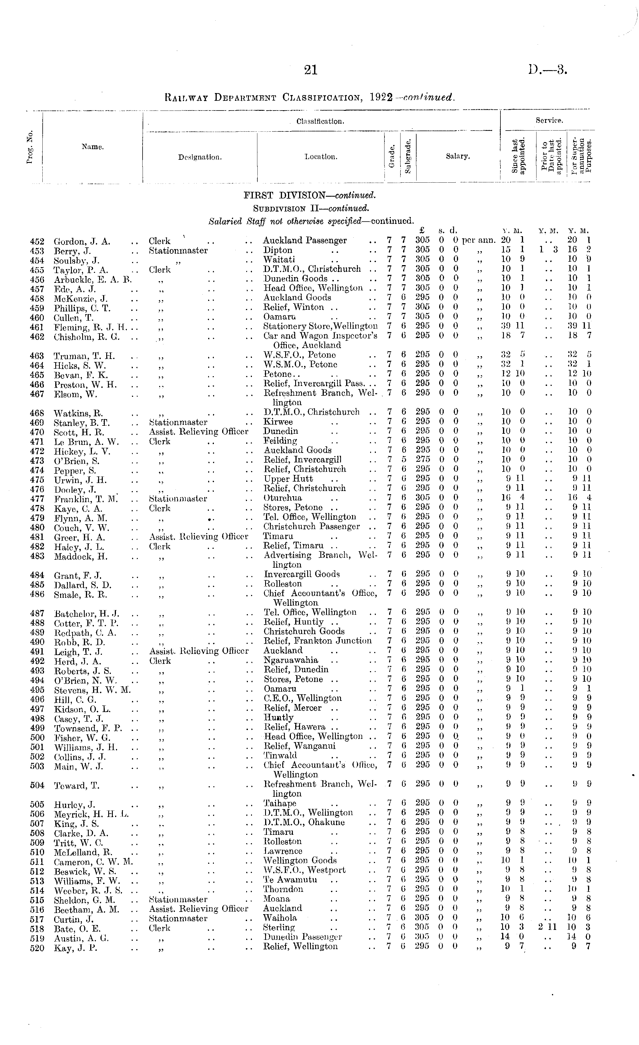 Classification. Service. 6 ~~~ " ». «S 'SV, 0H1V M Name, cj •a «.g <*Si.S JS; 2 Designation. Locution. a S, Salary. g-g §JS"I «§ S C5 *£ eft ?«ft i-Sa « -if fl O§' £!« Service. FIRST DIVISION— continued, Subdivision* II— continued. Salaried Staff not otherwise specified —continued. £ s. (I. v. 11. Y. M. Y. M. 452 Gordon, J. A. .. Clerk .. . . Auckland Passenger ..77 305 0 0 per ann. 20 1 .. 20 I 453 Berry, J. .. Stationmaster .. Dipton .. .. 7 7 305 0 0 „ 15 1 1 3 .16 2 454 Soulsbv, J. .. „ •• Waitati .. .. 7 7 305 0 0 „ 10 9 .. 10 9 455 Taylor" P A. .. Clerk .. .. D.T.M.O., Christchurch ..7 7 805 0 0 „ 10 1 .. 10 1 456 Arbucklc, E. A. 13. ., .. .. Dunedin Goods .. .. 7 7 305 0 0 „ 10 1 .. 10 1 457 Ede A. J. .... . . ■ ■ Head Office, Wellington ..77 305 0 0 „ 10 1 .. 10 1 458 McKenzie, J .. ,. .. •■ Auckland Goods ..76 295 0 0 „ 10 0 .. 10 0 459 Phillips C T. .. ,', .. ■■ Relief, Win ton .. ..7 7 305 0 0 „ 10 0 .. 10 0 460 Cullen, T. .. ., .. •• Oamaru .. ..7 7 305 0 0 „ II) 0 .. 10 0 461 Fleming, R. J. II. .. ,, .. .. Stationery Store,Wellington 7 6 295 0 0 ,, 39 11 .. 39 11 462 Chisholm, R. G. .. ,, .. •• Car and Wagon Inspector's 7 6 295 0 0 ,, 18 7 .. 18 7 Office, Auckland 463 Truman, T. H. . . ' „ . • • • W.S.F.O., Petone ..76 295 0 0 „ 32 5 . . 32 6 464 Hicks S W „ .. • • W.S.M.O., Petone ..76 295 0 0 ,. 32 1 .. 32 I 465 Bevan, F. K. .. „ .. .. Petone.. .. ..7 0 295 0 0 „ 12 10 .. 12 10 466 Preston W H. .. ., .. •• Relief. Invercargill Pass. .. 7 6 295 0 0 „ 10 0 .. 10 0 467 Elsom, W. •. „ • • • • Refreshment Branch, Wei- 7 6 295 0 0 „ 10 0 .. 10 0 lington 468 Watkins.R. .. „ •• •• D.T.M.O., Christchurch .. 7 6 295 0 0 ,, 10 0 .. 10 0 469 Stanley, B. T. .. Stationmaster .. Kirwee .. .. 7 6 295 0 0 ., 10 0 .. 10 0 470 Scott, H. R. .. Assist. Relieving Officer Dunedin .. .. 7 6 295 0 0 „ 10 0 .. 10 0 471 Le Brun, A. \X. .. Clerk .. .. Feilding . . .. 7 6 295 0 0 „ 10 0 .. 10 0 472 Hickey L V. . . „ • • • • Auckland Goods ..76 295 0 0 ., 10 0 .. 10 0 473 O'Brien S . . •• •• Relief, Invercargill ..7 5 275 0 0 ., 10 0 .. 10 0 474 Pepper S .. ., .. •• Relief, Christchureh .. 7 6 295 0 0 ,, 10 0 .. 10 0 475 Urwin J H .. •• Upper Hutt .. ..7 6 295 0 0 „ 9 11 .. 9 11 476 Dooley, J. .. ,, •• •• Relief, Christchurch .. 7 6 295 0 0 „ 9 11 .. 9 1] 477 Franklin, T. M.' .. Stationmaster .. Oturehua .. ..7 6 305 0 0 ., 16 4 .. 16 4 478 Kaye, 0. A. .. Clerk .. .. Stores, Petone .. ..76 295 00 ,, 9 1.1 . . 911 479 Flynn, A. M. .. ., .. .. Tel. Office, Wellington ..7 6 295 0 0 ,, 9 1.1 .. 9 11 480 Couch' V W .. ,, •■ •• Christchurch Passenger .. 7 6 295 0 0 ,. 9 11 .. 9 11 481 Greer, H. A. .. Assist. Relieving Officer Timaru .. ..76 295 0 0 ,, 911 .. 911 482 Haley J. L. .. Clerk .. .. Relief, Timaru .. .. 7 6 295 0 0 „ 9 11 .. 9 11 483 Maddook, H. .. „ .. .. Advertising Branch, Wei- 7 6 295 0 0 „ 9 11 .. 9 11 lington 484 Grant F J .. ,, ■• ■■ Invercargill Goods .. 7 6 295 0 0 ,, 9 10 .. 9 10 485 Dallard S D. .. „ .. •• Rolleston .. .. 7 6 295 0 0 „ 9 10 .. 9 10 486 Smalc, R, R. .... Chief Accountant's Office, 7 6 295 0 0 „ 9 10 .. 9 10 Wellington 487 Batchelor, H. J. .. „ .. •■ Tel. Office, Wellington ..7 6 295 0 0 „ 9 10 .. 9 10 488 Cotter F. T. P. .. ,. .. .*. Relief, Huntly .. . . 7 (i 295 0 0 „ 9 10 .. 9 10 489 Rodpa'th C A. ,. •• •■ Christchureh Goods .. 7 6 295 0 0 ,, !) 10 .. 9 10 490 Robb, R. D. .. ,, •• •• Relief, Frankton Junction 7 6 295 0 0 ,, 9 10 .. 9 10 491 Leigh' T. J. . . Assist. Relieving Officer Auckland .. ..76 295 00 ,, 9 10 .. 9 10 492 Herd J A .. Clerk .. .. Ngaruawahia .. ..7 0 295 0 0 ,, 9 10 .. 9 10 493 Roberts, J. S. .. ,, • . • • Relief, Dunedin . . 7 6 295 0 0 „ 9 10 .. 9 10 494 O'Brien' N. W .. •• Stores, Petone .. ..7 6 295 0 0 „ 9 10 .. 9 .10 495 Stevens' H. W. M. „ .. . . Oamaru .. ..7 6 295 0 0 ,, 9 II .. 9 1 496 Hill C G .. ,, • • • ■ C.E.O., Wellington ..76 295 0 0 ,. 99 . . 9 9 497 Kidson 6 L .. ,, .. •• Relief, Mercer .. . . 7 6 295 0 0 „ 9 9 .. 9 9 498 Casey, T. J. . . ,. • • • • Huntly .. ..76 295 00 „ 99 .. 99 499 Townsend F. P. .. ., • • • • Relief, Hawera .. ..76 295 0 0 „ 99 .. 9 9 500 Fisher, W. G. .. „ . • • • Head Office, Wellington .. 7 6 205 0 0 ,. 9 0 . . 9 0 501 Williams J 1*1 ,, • ■ • • Relief, Wanganui . . 7 6 295 0 0 ,, 9 9 . . 9 9 502 Collins, J. J. .. „ • • ■ • Tinwald .. ..76 295 0 0 „ 9 9 .. 9 9 503 Main, W.J. .. „ •• •• Chief Accountant's Office, 7 6 295 0 0 „ 9 9 .. 9 9 Wellington 504 Toward, T. .. ,, •• •■ Refreshment Branch, Wei- 7 6 295 0 0 ,, 9 9 .. 9 9 lington 505 Hurley, J. .. ,, •• ■• Taihape .. ..7 6 295 0 0 „ 9 9 .. 9 9 506 Meyriok H H L. ., . • • • D.T.M.O., Wellington ..76 295 0 0 ,, 9 9 .. 99 507 King j's ... .. •• D.T.M.O., Ohakune .. 7 6 295 0 0 ,, 9 9 ... 9 9 508 Clarke, D. A. .. ,. .. •■ Timaru .. .. 7 0 295 0 0 „ 9 8 .. 9 8 509 Tritt, W r . O. .... . • • • Rolleston . . ..76 295 0 0 „ 98 . . 9 8 510 McLclland, R .. . . Lawrence . . ..76 295 0 0 ,, 98 .. 9 8 511 Cameron C W. M. ,, .. .. Wellington Goods .. 7 6 295 0 0 ,, 10 I .. 10 1 512 BeswicU.'w. S. .. ., . . • • W.S.F.O., Westport ..76 295 0 0 „ 98 . . 9 8 513 Williams, F. W. .. ,, .• •■ Te Awamutu .. ..7 6 295 0 0 ,, 9 8 .. 9 8 514 Wecbcr, R. J. S. .. ., .. •• Thorndon .. ..76 295 0 0 ,, 10 1 .. 10 1 515 Sheldon', G. M. . . Stationmaster . . Moana . . ..76 295 0 0 ,, 98 .. 9 8 516 Beetham, A. M. . . Assist. Relieving Officer Auckland .. ..76 295 0 0 „ 9 8 . . 98 517 Curtin, J. .. Stationmaster .. Waihola .. ..7 6 305 0 0 ,, 10 6 .. 10 6 518 Bate, O. E. . . Clerk .. .. Sterling .. ..76 305 0 0 „ 10 3 211103 519 Austin AG .. „ .. •• Dunedin Passenger .. 7 6 305 0 0 ,, 14 0 .. 14 0 520 Kay, J. P. .. „ ••