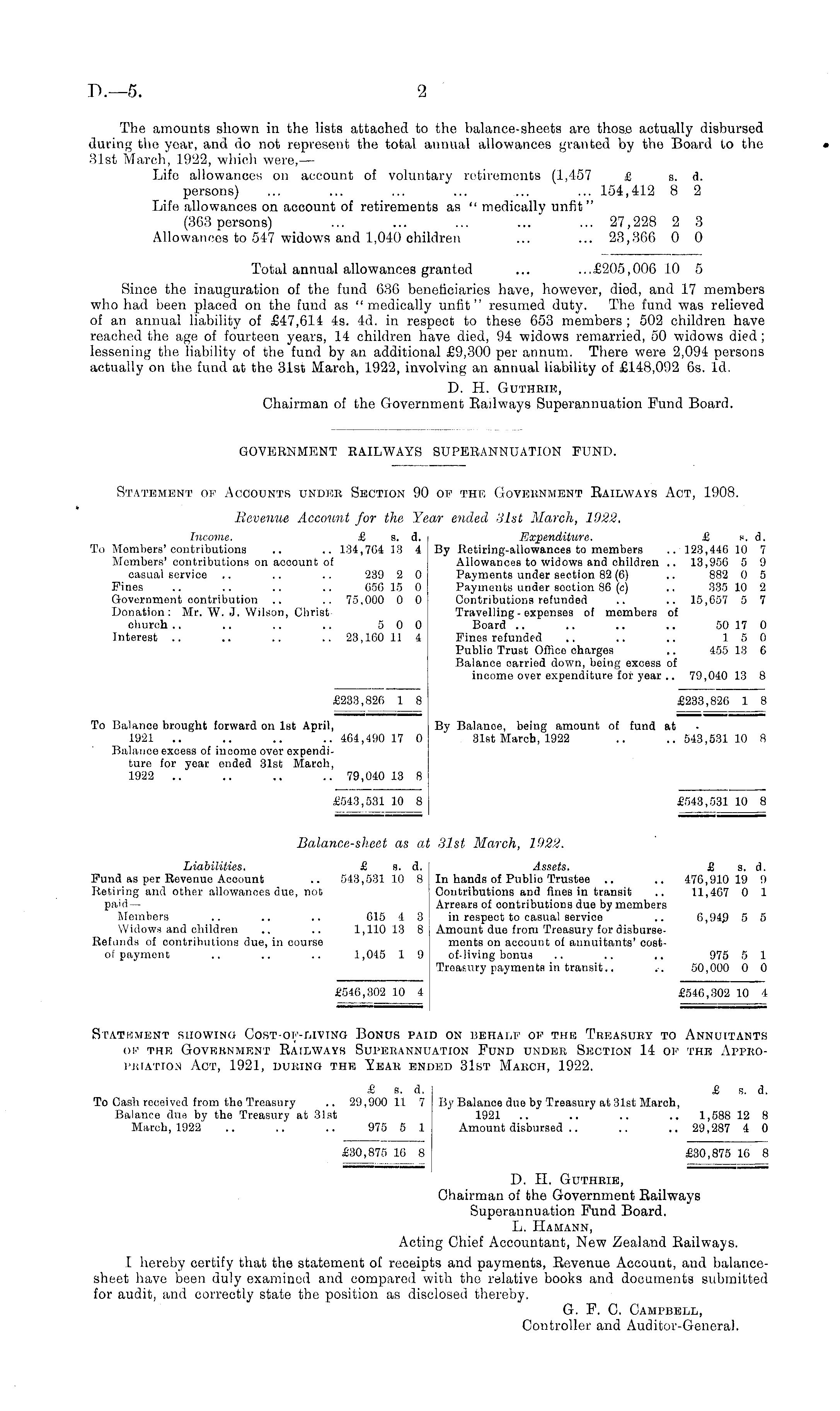 The amounts shown in the lists attached to the balance-sheets are those actually disbursed during the year, and do not represent the total annual allowances granted by the Board to the 31st March, 1922, which were,— Life allowances on account of voluntary retirements (1,457 £ s. d. persons) ... ... ... ... ... ... 154,412 8 2 Life allowances on account of retirements as " medically unfit" (363 persons) ... ... ... ... ... 27,228 2 3 Allowances to 547 widows and 1,040 children ... ... 23,366 0 0 Total annual allowances granted ... ...£205,006 10 5 Since the inauguration of the fund 636 beneficiaries have, however, died, and 17 members who had been placed on the fund as "medically unfit" resumed duty. The fund was relieved of an annual liability of £47,614 4s. 4d. in respect to these 653 members ; 502 children have reached the age of fourteen years, 14 children have died, 94 widows remarried, 50 widows died; lessening the liability of the fund by an additional £9,300 per annum. There were 2,094 persons actually on the fund at the 31st March, 1922, involving an annual liability of £148,092 6s. Id. D. H. Guthrie, Chairman of the Government Bailways Superannuation Fund Board. GOVERNMENT RAILWAYS SUPERANNUATION FUND. Statement of Accounts under Section 90 of the Government Bailways Act, 1908. Revenue Account for the Year ended 31st March, 1922. Income. £ s. d. Expenditure. £ ». d. To Members'contributions .. .. 134,764 IS 4 By Retiring-allowances to members .. 123,446 10 7 Members' contributions on account of Allowances to widows and children .. 13,956 5 9 casual service .. .. .. 239 2 0 Payments under section 82 (6) .. 882 0 5 Fines .. .. .. .. 656 15 0 Payments under section 86 (c) .. 335 10 2 Government contribution .. .. 75,000 0 0 Contributions refunded .. .. 15,657 5 7 Donation: Mr. W. J. Wilson, Christ- Travelling-expenses of members of church.. .. .. .. 5 0 0 Board .. .. .. .. 50 17 0 Interest .. .. .. .. 23,160 11 4 Fines refunded .. .. .. 15 0 Public Trust Office charges .. 455 13 6 Balance carried down, being excess of income over expenditure for year .. 79,040 13 8 £233,826 1 8 £233,826 1 8 To Balance brought forward on Ist April, By Balanoe, being amount of fund at 1921 .. .. .. .. 464,490 17 0 31st March, 1922 .. .. 543,53110 8 Balance excess of income over expenditure for year ended 31st March, 1922 .. .. .. .. 79,040 13 8 £543,531 10 8 £543,531 10 8 Balance-sheet as at 31st March, 1922. Liabilities. £ s. d. Assets. £ s. d. Fund as per Revenue Account .. 543,53110 8 In hands of Public Trustee .. .. 476,910 19 9 Retiring and other allowances due, not Contributions and fines in transit .. 11,407 0 1 paid— Arrears of contributions due by members Members .. .. .. 615 4 3 in respect to casual service .. 6,940 5 5 Widows and children .. .. 1,110 13 8 Amount due from Treasury for disburseRefunda of contributions due, in course ments on account of annuitants' oostof payment .. .. .. 1,045 1 9 of-living bonus .. .. .. 975 5 1 Treasury payments in transit.. .. 50,000 0 0 £540,302 10 4 £546,302 10 4 Statement showing Cost-of-living Bonus paid on behalf of the Treasury to Annuitants op the Government Railways Superannuation Fund under Section 14 of the Appropriation Act, 1921, during the Year ended 31st March, 1922. £ s. d. £ s. d. To Cash received from the Treasury .. 29,900 11 7 By Balance duo by Treasury at 31st March, Balance due by the Treasury at 31st 1921 .. .. .. .. 1,588 12 8 March, 1922 .. .. .. 975 5 1 Amount disbursed .. .. .. 29,287 4 0 £30,875 16 8 £30,875 16 8 D. 11. Guthrie, Chairman of the Government Railways Superannuation Fund Board. L. Hamann, Acting Chief Accountant, New Zealand Railways. I hereby certify that the statement of receipts and payments, Revenue Account, and balancesheet have been duly examined and compared with the relative books and documents submitted for audit, and correctly state the position as disclosed thereby. G. F. C. Campbell, Controller and Auditor-General.