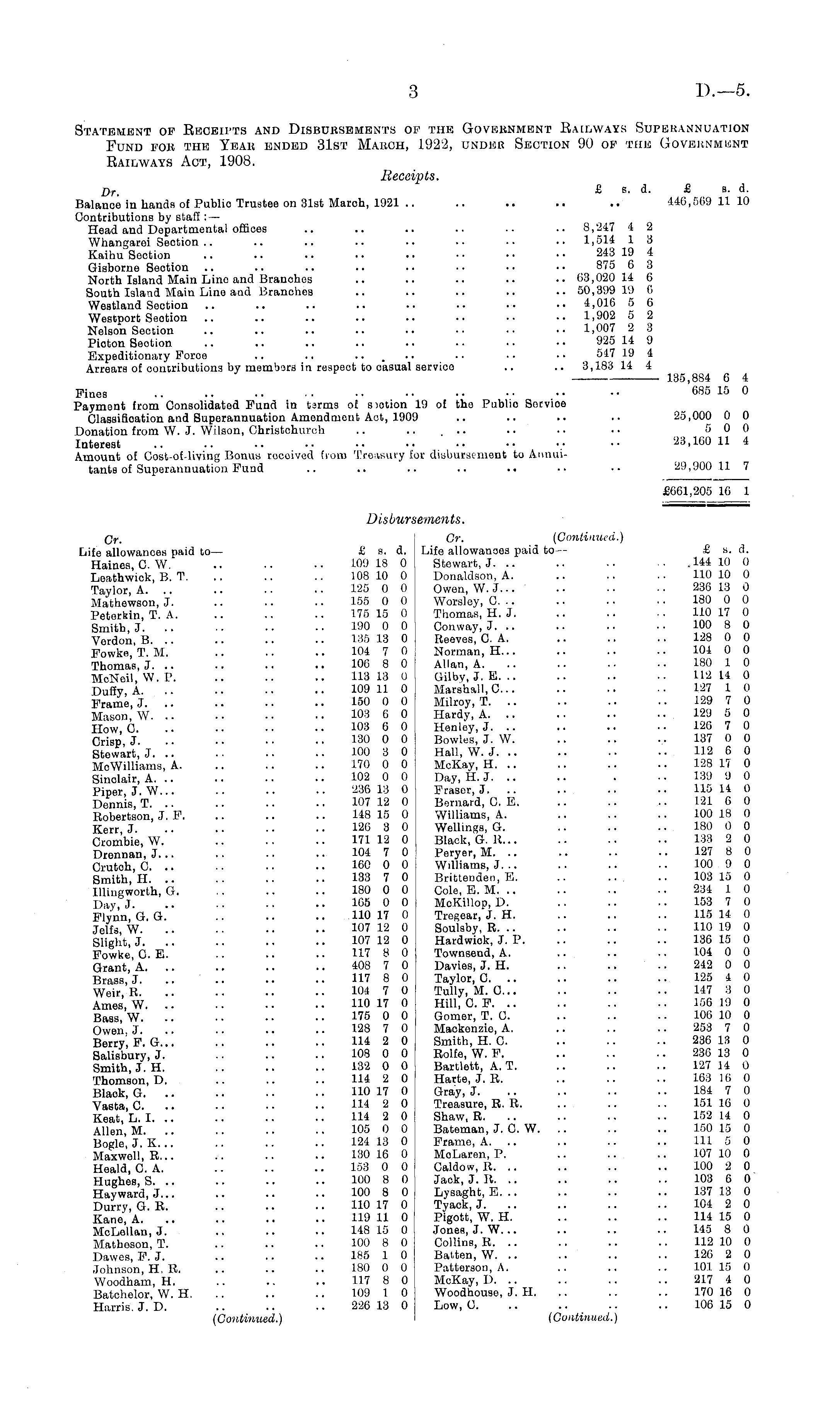 Statement of Receipts and Disbursements of the Government Railways Superannuation Fund for the Year ended 31st March, 1922, undeb Section 90 of the Government Railways Act, 1908. Receipts. D r . £ s. d. £ s. d. Balanoe in hands of Public Trustee on 31st March, 1921 .. .. .. .. .. 446,569 1110 Contributions by staff : — Head and Departmental offices .. .. .. .. .. .. 8,247 4 2 Whangarei Seotion .. .. .. .. .. •• •■ •• 1,514 1 3 Kaihu Section .. .. .. .. .. •• •• •• 243 19 4 Gisborne Seotion .. .. .. .. .. • • • • • ■ 875 6 3 North Island Main Lino and Branohos .. .. .. .. •• 63,020 14 6 South Island Main Line and Branches .. .. .. .. .. 50,399 19 6 Westland Seotion .. .. .. .. .. .. ■• •• 4,016 5 6 Westport Seotion .. .. .. .. .. .. •• ■• 1,902 5 2 Nelson Seotion .. .. .. .. .. •• ■• ■• 1,007 2 3 Pioton Section .. .. .. .. .. .. • • • • 925 14 9 Expeditionary Force .. .. ..... .. .. .. 547 19 4 Arrears of contributions by members in respect to oasual service .. .. 3,183 14 4 135,884 6 4 Fines 685 15 0 Payment from Consolidated Fund in tarms of siotion 19 of tho Publio Sorvioe Classification and Superannuation Amendmout Aot, 1909 .. .. .. •• 25,000 0 0 Donation from W. J. Wilson, Christchurch .. ..... .. .. •• 500 Interest .• •• 11 4 Amount of Cost-of-living Bonus rocoived from Treasury for disbursement to Annuitants of Superannuation Fund .. .. .. .. .. ■• •• 29,900 11 7 £661,205 16 1 Disbursements. Q r- Cr. (Continued.) Life allowances paid to — £ s. d. Life allowances paid to — £ s. d. Haines, C. W .. .. ■• 109 18 0 Stewart, J. .. .. .. ■• ,144 10 0 Leathwick, B. T. .. .. .. 108 10 0 Donaldson, A. .. .. .. 110 10 0 Taylor, A. .. .. . • • • 125 0 0 Owen, W.J...' .. • • ■ • 236 13 0 Mathewson, J. .. .. .. 155 0 0 Worsley, C. .. .. .. .. 180 0 0 Peterkin, T. A. .. .. .. 175 15 0 Thomas, H. J. .. .. .. 110 17 0 Smith, J. .. •• •• ■■ 190 0 0 Conway, J. .. .. ■• •• 100 8 0 Verdon, B. .. .. .. .. 135 13 0 Reeves, C. A. .. .. .. 128 0 0 Fowke, T. M. .. .. .. 104 7 0 Norman, H... .. .. .. 104 0 0 Thomas, J. .. .. .. .. 106 8 0 Allan, A. .. .. .. •• 180 1 0 McNeil, W. P. .. .. .. 113 13 0 G-ilby, J. E. .. .. .. .. 112 14 0 Duffy, A. .. .. •• .. 109 11 0 Marshall, C.. .. .. .. 127 1 0 Frame, J. .. .. •• •• 150 0 0 Milroy, T. .. .. .. .. 129 7 0 Mason, W. .. ■ • •• • • 103 6 0 Hardy, A. .. .. .. ... 129 5 0 How, C. .. 103 6 0 Honley, J. .. .. .. •■ 126 7 0 Crisp J. .. ■•• • • • 130 0 0 Bowles, J. W. .. .. .. 137 0 0 Stewart, J 100 3 0 Hall, W. J 112 6 0 MoWilliams, A 170 0 0 McKay, H 128 17 0 Sinclair, A 102 0 0 Day, H. J . -. 139 9 0 Piper, J. W... .. •• •• 236 13 0 Fraser, J. .. .. .. .. 115 14 0 Dennis, T. .. .. .. .. 107 12 0 Bernard, C. E. .. .. .. 121 6 0 Robertson, J, F. .. .. .. 148 15 0 Williams, A. .. .. .. 100 18 0 Kerr J. .. • • • • • • 120 3 0 Wellings, G. .. .. .. 180 0 0 Cronibie, W. 171 12 0 Black, G. R 133 2 0 Drennan, J 104 7 0 Peryer, M 127 8 0 Crutoh, C. .. •• •• •• 160 0 0 Williams, J. .. .. .. .. 100 9 0 Smith, H. .. .. .. .. 133 7 0 Brittendeu, E. .. ... .. 103 15 0 Illingworth, G .. 180 0 0 Cole, E. M. .. .. .. •• 234 1 0 Day J. .. •• •• •• 165 0 0 McKilloD, D. .. .. .. 153 7 0 Flynn, G. G. .. .. .. 110 17 0 Tregear.'j. H. .. .. .. 115 14 0 Jeffs W. .. ■ • ■ • • • 107 12 0 Soulsby, R. .. .. .. .. 110 19 0 Slight, J. .. .. • • • • 107 12 0 Hardwiok, J. P. .. .. .. 136 15 0 Fowke, C. E. .. .. .. 117 8 0 Townsend, A. .. .. .. 104 0 0 Grant, A. .. .. .. .. 408 7 0 Davies, J. H. .. .. .. 242 0 0 Brass, J .. •• 117 8 0 Taylor, C 125 4 0 Weir, R. .. .. .. •■ 104 7 0 Tully.M. C... .. .. .. 147 3 0 Ames, W. .. .. •■ •• 110 17 0 Hill, C. F. .. .. .. .. 156 19 0 Bass, W. .. • • • • • • 175 0 0 Gomer, T. C. .. .. .. 106 10 0 Owen J. .. .. .. 128 7 0 Mackenzie, A, .. .. .. 253 7 0 Berry, F. G... .. .. .. 114 2 0 Smith, H. 0. .. .. .. 236 13 0 Salisbury, J. .. .. .. 108 0 0 Rolfe, W. F. .. .. • • 236 13 0 Smith, J. H. .. .. .. 132 0 0 Bartlett, A. T. .. .. .. 127 14 0 Thomson, D. .. .. .. 114 2 0 Harte, J. R. .. .. .. 163 16 0 Blaok, G 110 17 0 Gray, J 184 7 0 Vasta, C. .. - • • • • • 114 2 0 Treasure, R. R. .. .. .. 151 16 0 Keat L. I. .. .. .. .. 114 2 0 Shaw, R. .. .. .. .. 152 14 0 Allen, M. .. .. .. .. 105 0 0 Bateman, J. C. W. .. .. .. 150 15 0 Bogle J.K... .. .. .. 124 13 0 Frame, A. .. .. .. .. 11l 5 0 Maxwell, R... .-. .. .. 130 16 0 MoLaren, P. .. ... .. 107 10 0 Heald, C. A. .. .. .. 153 0 0 Caldow, R. .. .. .. .. 100 2 0 Hughes, S. .. .. .. .. 100 8 0 Jack, J. R. .. .. .. .. 103 6 0 Hayward.J... .. .. .. 100 8 0 Lysaght.E... .. .. .. 137 13 0 Durry, G. R. .. .. •• 110 17 0 Tyack, J. .. .. .. .. 104 2 0 Kane, A. .. .. .. .. 119 11 0 Pigott, W. H. .. .. .. 114 15 0 McLellan, J. .. .. .. 148 15 0 Jones, J. W... .. .. .. 145 8 0 Matheson, T. ... .. .. 100 8 0 Collins, R. .. .. .. .. 112 10 0 Dawes, F. J. .. .. •• 185 1 0 Batten, W. .. .. .. .. 126 2 0 Johnson H, R. .. .. .. 180 0 0 Patterson, A. .. .. .. 101 15 0 Woodham, H. .. .. .. 117 8 0 McKay, D .. .. 217 4 0 Batchelor, W. H. .. .. .. 109 1 0 Woodhouse, J. H. .. .. .. 170 16 0 Harris. J. D. .. .. .. 226 13 0 Low, O. .. .. .. .. 106 15 0 (Continued.) (Continued.)