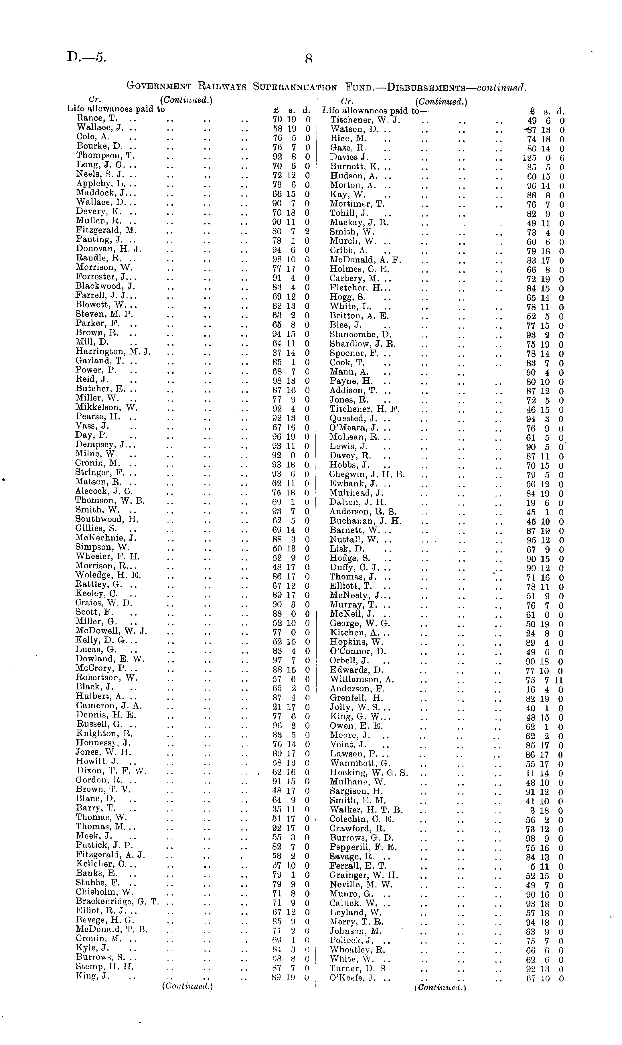 Government Railways Superannuation Fund.—Disbursements— continued. O- (Continued.) Cr. (Continued.) Life allowances paid to— £ s. d. Life allowances paid to— £ s d. Ranee, T. .. .. .. .. 70 19 0 Titchener, W.J. .. .. .. 49 6 0 Wallace, J. .. .. .. .. 58 19 0 Watson, D. .. .. .. .. -87 13 0 Cole > A - •• •• •• .. 76 5 0 Rice, M. .. .. .. .. 74 18 0 Bourke, D. .. .. .. .. 76 7 0 Gazo, R. .. .. .. .. 80 14 0 Thompson, T. .. .. .. 92 8 0 Davios J. .. .. .. .. 125 0 6 Long, J. G... .. .. .. 70 6 0 Burnett, X... .. .. .. 85 5 0 Neels, S. J. .. .. .. .. 72 12 0 Hudson, A. .. .. .. .. 00 15 0 Appleby, L. .. .. .. .. 73 6 0 Morton, A. .. .. .. .. 96 14 0 Maddock, J... .. .. .. 66 15 0 Kay, W. .. .. .. .. 88 8 0 Wallace, D. .. .. .. .. 90 7 0 Mortimer, T. .. .. .. 76 7 0 Devery, K. .. .. .. .. 70 18 0 Tohill, J. .. .. 82 9 0 Mullen, R. .. .. .. .. 90 11 0 Maokay, J. R. .. 49 11 0 Fitzgerald, M. .. .. .. 80 7 2 Smith, W. . .. .. .. 73 4 0 Panting, J. .. .. .. ~ 78 1 0 Murch, W. .. .. .. .. 60 6 0 Donovan, H. J. ~ .. .. 94 6 0 Cribb, A. .. .. .. .. 79 18 0 Raudle, R. .. ~ ~ .. 98 10 0 McDonald, A. F. .. .. .. 83 17 0 Morrison, W. .. .. .. 77 17 0 Holmes, C. E. .. .. .. 66 8 0 Forrester, J... .. .. ~ 91 4 0 Carbery, M. .. .. .. .. 72 19 0 Blaokwood, J. .. .. .. 83 4 0 Fletcher, H... .. .. .. 84 15 0 Farrell, J. J... .. .. .. 69 12 0 Hogg, S. .. .. .. 65 14 0 Blewett, W. .. .. .. .. 82 13 0 White, L. .. .. .. .. 78 11 0 Steven, M. P. .. .. .. 63 2 0 Britton, A. E. .. .. .. 52 5 0 Parker, F. .. .. .. .. 65 8 0 Blee, J. .. .. .. .. 77 15 0 Brown, R. .. .. .. .. 94 15 0 Stanoombe, D. .. .. .. 93 2 0 Mill, D. .. .. .. .. 64 11 0 Shardlow, J. R. .. .. .. 75 19 0 Harrington, M. J. .. .. .. 37 14 0 ' Spoonor, F. .. .. .. .. 78 14 0 Garland, T. .. .. .. .. 85 1 0 Cook, T. .. .. .. .. 83 7 0 Power, P. .. .. .. .. 68 7 0 Mann, A. .. .. .. 90 4 0 Reid, J. .. .. .. .. 98 13 0 Payne, H. .. .. .. .. 80 10 0 Butcher, E. .. .. .. .. 87 16 0 Addison, T. .. .. .. .. 87 12 0 Miller, W. .. .. .. .. 77 9 0 Jones, R. .. .. .. .. 72 5 0 Mikkelson, W. .. .. .. 92 4 0 Titchener, H. F. .. .. .. 46 15 0 Pearse, H. .. .. .. .. 92 13 0 Quested, J. .. .. .. .. 94 3 0 Vass > J- • • • ■ •. .. 67 16 0 O'Meara, J. .. .. ~ .. 76 9 0 D a.y> P- •• •• •- .. 96 19 0 McLean, R. .. .. .. .. 61 5 0 Dempsey, J... .. .. .. 9311 0 Lewis, J. .. .. .. . 90 5 0 Milne, W. .. .. .. .. 92 0 0 Davey, R. .. .. .. .. 87 11 0 Cromn, M. .. ~ .. .. 93 18 0 | Hobbs, J. .. .. .. 70 15 0 Stringer, F. .. .. .. .. 93 6 0 Chegwin, J. H. B. .. .. .. 79 5 0 Matson, R. .. .. .. .. 62 11 0 Ewbank, J. .. .. .. .. 56 12 0 Aleoock, J. C. .. .. .. 75 18 0 Muirhead, J. .. .. .. 84 19 0 Thomson, W. B. .. .. .. 69 1 0 Dalton, J. H. .. .. .. 19 6 0 Smith, W. .. .. .. .. 93 7 0 Anderson, R. S. .. .. .. 45 1 0 Southwood, H. .. ~ .. 62 5 0 Buchanan, J. H. .. .. .. 45 10 0 Gillies, S. .. .. .. .. 69 14 0 Bamett, W. .. .. .. .. 87 19 0 MoKechme, J. .. .. .. 88 3 0 Nuttall, W. .. .. .. .. 95 12 0 Simpson, W. .. .. .. 50 13 0 Lisk, D. .. .. .. .. 07 9 0 Wheeler, F. H. .. .. .. 52 9 0 Hodge, S. .. .. .. .. 90 15 0 Morrison, R... .. .. .. 48 17 0 Duffy, C.J. .. .. .. .. 90 12 0 Woledge, H. E. .. .. .. 80 17 0 Thomas, J. .. .. .. '.. 71 16 0 Rattley, G. .. .. .. .. 67 12 0 Elliott, T. .. .. .. .. 78 11 0 Koeley, C. .. .. ~ .. 89 17 0 McNeely, J... .. .. .. 51 9 0 Craios, W. D. ~ .. .. 90 3 0 Murray, T. .. .. .. .. 76 7 0 Scott, P. .. ~ ~ 83 0 0 MoNei'l, J. .. .. .. .. 61 0 0 Miller, G. .. .. .. .. 52 10 0 George, W. G. .. .. .. 50 19 0 McDowell, W. J. .. .. .. 77 0 0 Kitchen, A. .. .. .. .. 24 8 0 Kelly, D. G. .. .. .. ~ 52 15 0 Hopkins, W. .. .. .. 89 4 0 Luoas, G. .. .. .. .. 83 4 0 O'Connor, D. .. .. .. 49 6 0 Dowland, E. W. .. .. .. 97 7 0 Orbell, J. .. .. .. ~ 90 18 0 McCrory, P. .. ~ .. .. 88 15 0 Edwards, D. .. .. .. 77 10 0 Robertson, W. .. .. .. 57 6 0 Williamson, A. .. .. .. 75 711 Black, J. .. .. .. .. 65 2 0 Anderson, F. .. .. .. 10 4 0 Hulbert, A. .. .. .. .. 87 4 0 Grenfell, H. .. ~ .. 82 19 0 Cameron, J. A. .. ~ .. 21 17 0 Jolly, W. 5... .. .. .. 40 1 0 Dennis, H. E. .. .. ~ 77 6 0 King, G. W... .. .. .. 48 15 0 Russell, G. .. .. .. ~ 96 3 0 Owen, E. E. .. .. . 62 1 0 Knighton, R. .. .. .. 83 5 0 Moore, J. .. .. .. .. 62 2 0 Hennessy, J. .. .. ~ 76 14 0 Veint, J. .. .. .. .. 85 17 0 Jones, W. H. .. .. .. 89 17 0 Lawson, P. .. .. .. .. 86 17 0 Howitt, J. .. .. .. .. 58 13 0 Wannicott, G. .. .. 55 17 0 Dixon, T. F. W. .. .. ... 62 16 0 Hocking, W. G. S. .. .. 11 14 0 Gordon, R. .. ~ .. .. 9115 0 Mnlhane, W. .. .. 48 10 0 Brown, T. V. ' .. .. .. 48 17 0 Sargison, H. .. .. .. 91 12 0 Blanc, D. .. .. .. ~ 64 9 0 Smith, E. M. .. .. .. 41 10 0 Barry, T. .. .. .. .. 35 11 0 Walker, H. T. B. .. .. . 318 0 Thomas, W. .. .. .. 51 17 0 Colechin, C. E. .. .. .. 50 2 0 Thomas, M, .. .. .. .. 92 17 0 Crawford, R. .. .. .. 73 12 0 Moek > J- ■• •■ •• .. 55 3 0 Burrows, G. D. .. .. .. 98 9 0 Puttiok, J. P. .. .. .. 82 7 0 Pepperill, F. E. .. .. .. 75 16 0 Fitzgerald, A. J. .. .. . 58 2 0 Savage, R. .. .. .. .. 84 13 0 Kelleher, C. .. .. .. .. o7 10 0 Perrall, E. T. .. .. .. 511 0 Banks, E. .. .. .. .. 79 1 0 Grainger, W. H. .. .. .. 52 15 0 Stubbs, P. .. .. .. .. 79 9 0 Neville, M. W. .. .. .. 49 7 0 Clnsholm, W. .. .. .. 71 8 0 Munro, G. .. .. .. .. 90 16 0 Brackenridge, G. T. .. .. .. 71 9 0 Callick, W. .. .. .. .. 93 18 0 Elliot, R. J. .. ~ .. .. 67 12 0 Leyland, W. .. .. 57 18 0 Bevege, H. G. .. ~ .. 85 9 0 Merry, T. R. .. .. . 94 18 0 MoDonald, T. B. .. .. .. 71 2 0 Johnson, M. .. .. .. 63 9 0 Cromn, M. .. .. .. .. 69 10 Pollock, J. .. .. .. .. 75 7 0 K y le > J- • • • • • • .. 84 3 0 Whoatley, R. .. .. .. 06 6 0 Burrows, S. .. .. .. .. 58 8 0 White, W. .. .. .. .. 62 0 0 Stemp, H. H. .. .. .. 87 7 0 Turner, D. S. .. .. .. 92 13 0 Ki »g. J- • • ■ • • ■ .. 89 19 O O'Keefe, J. .. .. .. .. 07 10 0 (Continued.) (Continued.)