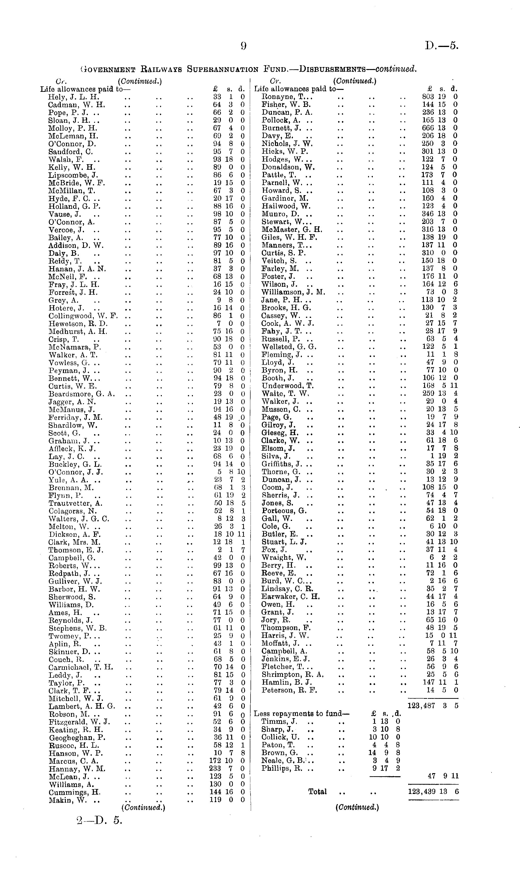 Government Railways Superannuation Fund.—Disbursements — continued. Cr. (Continued.) Cr. (Continued.) Life allowances paid to — £ s. d. Life allowances paid to — £ s. d. Hely, J. L. H. .. .. .. 33 1 0 Ronayne, T..." .. .. .. 803 19 0 Cadman, W. H. .. .. .. 64 3 0 Fisher, W. B. .. .. .. 144 15 0 Pope, P. J. .. .. .. .. 66 2 0 Duncan, P. A. .. .. .. 236 13 0 Sloan, J. H. .. .. .. .. 29 0 0 Pollock, A. .. .. .. .. 165 13 0 Molloy, P. H. .. .. .. 67 4 0 Burnett, J. .. .. .. .. 660 13 0 MoLeman, H. .. .. .. 69 2 0 Davy, E. .. .. .. .. 206 18 0 O'Connor, D. .. .. .. 94 8 0 Nichols, J. W. .. .. .. 250 3 0 Saudford, C. .. .. .. 95 7 0 Hioks, W. P. .. .. .. 301 13 0 Walsh, F. .. .. .. .. 93 18 0 Hodges, W... .. .. .. 122 7 0 Kelly, W. H. .. ..• .. 89 0 0 Donaldson, W. .. .. .. 124 5 0 Lipsoombe, J. .. .. .. 86 6 0 Pattle, T. .. .. .. .. 173 7 0 Moßride, W. F. .. .. .. 19 15 0 Parnell, W. .. .. .. .. 11l 4 0 McMillan, T. .. .. .. 67 3 0 Howard, S. .. .. .. .. 108 3 0 Hyde, F. C. .. .. .. .. 20 17 0 Gardiner, M. .. .. .. 160 4 0 Holland, G. P. .. .. .. 88 16 0 Hailwood, W. .. .. .. 123 4 0 Vause, J. .. .. .. .. 98 10 0 Munro, D. .. .. .. .. 346 13 0 O'Connor, A. .. .. .. 87 5 0 Stewart, W... .. .. .. 203 7 0 Verooe, J. .. .. .. .. 95 5 0 MoMaster, G. H. .. .. .. 316 13 0 Bailey, A. .. .. .. .. 77 10 0 Giles, W. H. P. .. .. .. 138 19 0 Addison, D. W. .. .. .. 89 16 0 Manners, T... .. .. .. 137 11 0 Daly, B. .. .. .. .. 97 10 0 Curtis, S. P. .. .. .. 310 0 O Reidy, T. .. .. .. .. 81 5 0 Veitoh, S. .. .. .. .. 150 18 0 Hanan.J. A. N. .. .. .. 37 3 0 Parley, M. .. .. .. .. 137 8 O McNeil, F. .. .. .. .. 68 13 0 Foster, J. .. .. .. .. 176 11 0 Fray, J. L. H. .. .. ~ 16 15 0 Wilson, J. .. .. .. .. 164 12 6 Forres't, J. H. .. .. .. 24 10 0 Williamson, J. M. .. .. .. 73 0 3 Grey, A. .. .. .. .. 9 8 0 Jane, P. H... .. .. .. 113 10 2 Hotere, J. .. .. .. .. 10 14 0 Brooks, H. G. .. .. .. 130 7 3 Collingwood, W. P. .. .. .. 86 1 0 Cassey, W. .. .. .. .. 21 8 2 Hewetson, R. D. .. .. .. 7 0 0 Cook, A. W. J. .. .. .. 27 15 7 Medhurst, A. H. .. .. .. 75 16 0 Pahy, J. T. .. .. .. .. 28 17 9 Crisp, T. .. .. .. .. 90 18 0 Russell, P. .. .. .. .. 63 5 4 McNamara, P. .. .. .. 53 0 0 Wellsted, G. G. .. .. .. 122 5 1 Walker, A. T. .. .. .. 81 11 0 Fleming, J. .. .. .. .. 11 1 8 Vowless, G. .. .. .. .. 79 11 0 Lloyd, J. .. .. .. .. 47 9 0 Peyman.J. .. .. .. .. 90 2 0 Byron, H. .. .. .. .. 77 10 0 Bennett, W... .. .. .. 94 18 0 Booth, J. .. .. .. .. 106 12 0 Curtis, W. E. .. .. .. 79 8 0 Underwood, T. .. .. .. 168 5 11 Beardsmore, G. A. .. .. .. 23 0 0 Waite, T. W, .. .. .. 259 13 4 Jagger, A.N. .. .. .. 19 13 0 Walker, J. .. .. .. .. 29 0 4 McManus, J. .. .. .. 94 16 0 Mussen, C. .. .. .. .. 20 13 5 Perriday, J. M. .. .. ... 48 19 0 Page, G. .. .. .. .. 19 7 9 Shardlow, W. .. .. .. 118 0 Gilroy, J. .. .. .. .. 24 17 8 Soott, G. .. .. .. .. 24 0 0 Gieseg, H. .. .. .. .. 33 410 Graham, J... .. .. .. 10 13 0 Clarke, W. .. .. .. .. 61 18 6 Affleck, K.J. .. .. .-. 23 19 0 Elsom, J. .. .. .. .. 17 7 8 Lay, J. C. .. .. .. .. 68 6 0 Silva, J. .. .. .. .. 119 2 Buckley, G. L. .. .. .. 94 14 0 Griffiths, J. .. .. .. .. 35 17 6 O'Connor, J. J. .. .. .. 5 8 10 Thorne, G. .. .. .. .. 30 2 3 Yule, A. A. .. .. .. ~ 23 7 2 Dunoan, J. .. .. .. .. 13 12 9 Brennan, M. .. .. .. 68 1 3 Coom, J. .. .. ... .. 108 15 0 Flyun, P. .. .. .. .. 01 19 2 Sherris, J. .. .. .. .. 74 4 7 Trautvetter, A. .. .. .. 50 18 5 Jones, S. .. .. .. .. 47 13 4 Colagoras, N. .. .. .. 52 8 1 Porteous, G. .. .. .. 54 18 0 Walters, J. G. C. .. .. .. 812 3 Gall, W .. 62 1 2 Melton, W. .. ■ .. .. .. 26 3 1 Cole, G. .. .. .. .. 6 10 0 Dickson, A. P. .. .. .. 18 10 11 Butler, E. .. .. .. .. 30 12 3 Clark, Mrs. M. .. .. .. 12 18 1 Stuart, L. J. .. .. .. 4113 10 Thomson, E. J. .. .. .. 2 17 Fox, J. .. .. .. .. 37 11 4 ' Campbell, G. .. .. .. 42 0 0 Wraight, W. .. .. .. 6 2 2 Roberts, W... .. .. .. 99 13 0 Berry, H. .. .. .. .. 11 16 0 Redpath, J. .. .. .. .. 67 16 0 Reeve, E. .. .. .. .. 72 1 6 Gulliver, W. J. .. .. .. 83 0 0 Burd, W. C... .. .. .. 2 16 6 Barbor, H. W. .. .. .. 91 13 0 Lindsay, C. R. .. ... .. 85 2 7 Sherwood, S. .. .. .. 64 9 0 Earwaker, C. H. .. .. .. 44 17 4 Williams, D. .. .. .. 49 6 0 Owen, H. .. .. .. .. 16 5 6 Ames, H. .. .. .. .. 71 15 0 Grant, J. .. .. .. .. 13 17 7 Reynolds, J. .. .. .. 77 0 0 Jory, R. .. .. .. .. 65 16 0 Stephens, W. B. .. .. .. 61 11 0 Thompson, P. .. .. .. 48 19 5 Twomey, P. .. .. .. .. 25 9 0 Harris, J. W. .. .. .. 15 0 11 Aplin, R. .. .. .'. . 43 1 0 Moffatt, J. .. .. .. .. 711 7 Skinner, D... .. .. .. 61 8 0 Campbell, A. .. .. .. 58 5 10 Couoh, R. .. .. .. .. 68 5 0 Jenkins, E.J. .. .. .. 26 3 4 Carmiohael, T. H. .. .. .. 70 14 0 Fletcher, T. .. .. .. .. 56 9 6 Leddy, J. .. .. .. 81 15 0 Shrimpton, R. A. .. .. .. 25 5 6 Taylor, P. .. .. .. .. 77 3 0 Hamlin, B. J. .. .. .. 147 11 1 Clark, T. P. .. .. .. .. 79 14 0 Peterson, R. P. .. .. .. 14 5 0 Mitchell, W.J. .. .. .. 61 9 0 Lambert, A. H. G. .. .. .. 42 6 0 123,487 3 5 Rohson, M. .. .. .. .. 91 6 o Less repayments to fund— £ s. ,d. Fitzgerald, W. J. .. .. .. 52 6 0 Timms, J. .. .. 113 0 Keating, R. H. .. .. .. 34 9 0 Sharp, J. .. .. 310 8 Geogheghan, P. .. .. .. 36 11 0 Collick, U. .. .. 10 10 0 Ruscoe, H. L. .. .. .. 58 12 1 Paton, T. .. .. 4 4 8 Hanson, W. P. .. .. .. 10 7 8 Brown, G. .. .. 14 9 8 Marcus, C. A. .. .. .. 172 10 0 Neale, G. 8.'.. .. 3 4 9 Hannay, W. M. .. .. .. 233 7 0 Phillips, R. .. .. 9 17 2 McLean, J. .. .. .. .. 123 5 0 47 9 11 Williams, A. .. .. .. 130 0 0 Cummings, H. .. .. .. 144 16 0 Total .. .. 123,439 13 6 Makin, W. .. .. .. .. 119 0 0 I — (Continued.) (Continued.)