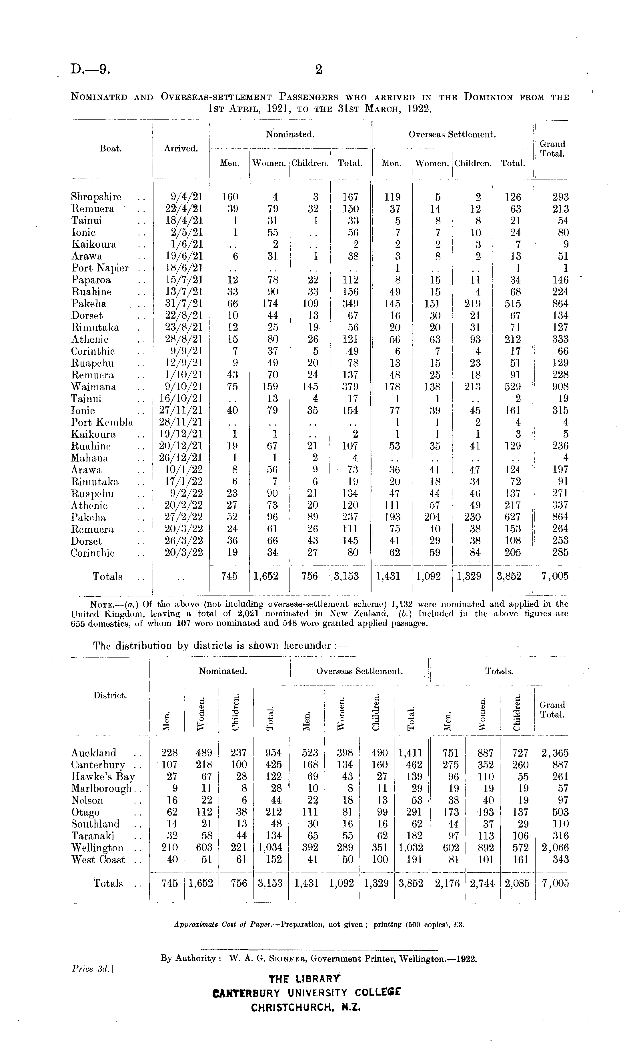 Nominated and Overseas-settlement Passengers who arrived in the Dominion from the 1st April, 1921, to the 31st March, 1922.